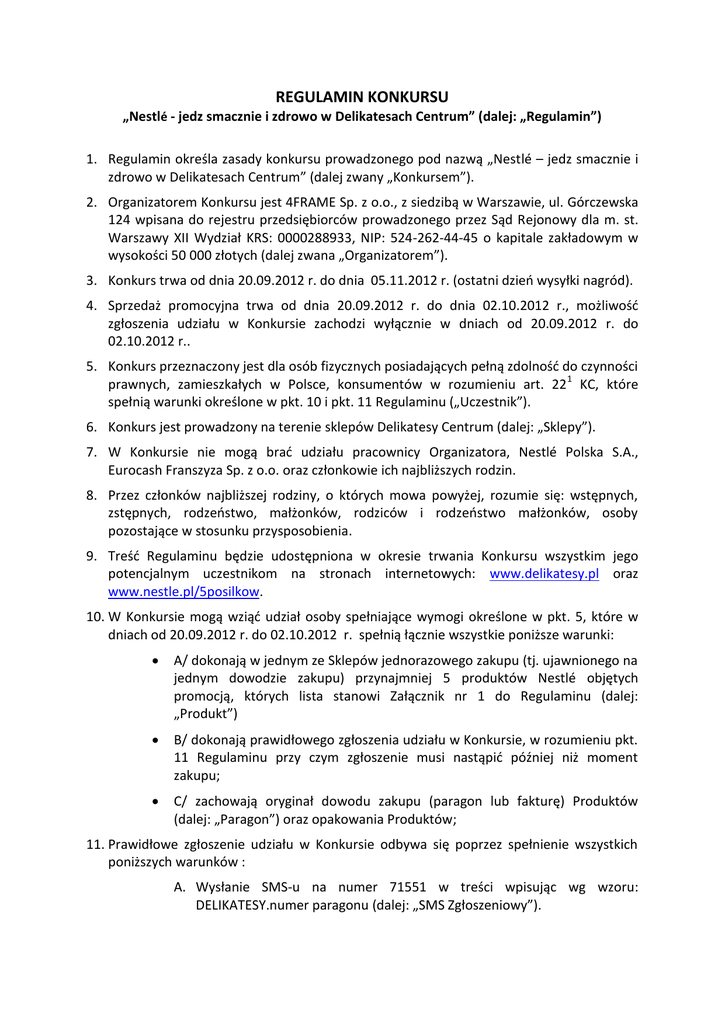 REGULAMIN KONKURSU „Nestlé - jedz smacznie i zdrowo w Delikatesach Centrum” (dalej: „Regulamin”) 1. Regulamin określa zasady konkursu prowadzonego pod nazwą „Nestlé – jedz smacznie i zdrowo w Delikatesach Centrum” (dalej zwany „Konkursem”). 2. Organizatorem Konkursu jest 4FRAME Sp. z o.o., z siedzibą w Warszawie, ul. Górczewska 124 wpisana do rejestru przedsiębiorców prowadzonego przez Sąd Rejonowy dla m. st. Warszawy XII Wydział KRS: 0000288933, NIP: 524-262-44-45 o kapitale zakładowym w wysokości 50 000 złotych (dalej zwana „Organizatorem”). 3. Konkurs trwa od dnia 20.09.2012 r. do dnia 05.11.2012 r. (ostatni dzieo wysyłki nagród). 4. Sprzedaż promocyjna trwa od dnia 20.09.2012 r. do dnia 02.10.2012 r., możliwośd zgłoszenia udziału w Konkursie zachodzi wyłącznie w dniach od 20.09.2012 r. do 02.10.2012 r.. 5. Konkurs przeznaczony jest dla osób fizycznych posiadających pełną zdolnośd do czynności prawnych, zamieszkałych w Polsce, konsumentów w rozumieniu art. 22 1 KC, które spełnią warunki określone w pkt. 10 i pkt. 11 Regulaminu („Uczestnik”). 6. Konkurs jest prowadzony na terenie sklepów Delikatesy Centrum (dalej: „Sklepy”). 7. W Konkursie nie mogą brad udziału pracownicy Organizatora, Nestlé Polska S.A., Eurocash Franszyza Sp. z o.o. oraz członkowie ich najbliższych rodzin. 8. Przez członków najbliższej rodziny, o których mowa powyżej, rozumie się: wstępnych, zstępnych, rodzeostwo, małżonków, rodziców i rodzeostwo małżonków, osoby pozostające w stosunku przysposobienia. 9. Treśd Regulaminu będzie udostępniona w okresie trwania Konkursu wszystkim jego potencjalnym uczestnikom na stronach internetowych: www.delikatesy.pl oraz www.nestle.pl/5posilkow. 10. W Konkursie mogą wziąd udział osoby spełniające wymogi określone w pkt. 5, które w dniach od 20.09.2012 r. do 02.10.2012 r. spełnią łącznie wszystkie poniższe warunki: A/ dokonają w jednym ze Sklepów jednorazowego zakupu (tj. ujawnionego na jednym dowodzie zakupu) przynajmniej 5 produktów Nestlé objętych promocją, których lista stanowi Załącznik nr 1 do Regulaminu (dalej: „Produkt”) B/ dokonają prawidłowego zgłoszenia udziału w Konkursie, w rozumieniu pkt. 11 Regulaminu przy czym zgłoszenie musi nastąpid później niż moment zakupu; C/ zachowają oryginał dowodu zakupu (paragon lub fakturę) Produktów (dalej: „Paragon”) oraz opakowania Produktów; 11. Prawidłowe zgłoszenie udziału w Konkursie odbywa się poprzez spełnienie wszystkich poniższych warunków : A. Wysłanie SMS-u na numer 71551 w treści wpisując wg wzoru: DELIKATESY.numer paragonu (dalej: „SMS Zgłoszeniowy”). B. Wszystkim osobom, które wysłały SMS Zgłoszeniowy zostanie wysłane SMS–em zwrotnym na numer telefonu, z którego zostało wysłane zgłoszenie, zamknięte pytanie konkursowe wraz z trzema odpowiedziami, przyporządkowanymi do liter alfabetu. C. Odpowiedź na pytanie konkursowe musi byd poprzedzona prefiksem DELIKATESY i przesłana na numer 71551. Odpowiedzią na pytanie konkursowe będzie jedna z liter alfabetu, do której przyporządkowana będzie odpowiedź. Tylko jedna odpowiedź będzie poprawna. Zadaniem uczestnika jest udzielenie poprawnej odpowiedzi. Przykładowy schemat SMS-u: DELIKATESY.A (dalej: „SMS Konkursowy”). D. SMS-y powinny zostad wysłane za pośrednictwem telefonów komórkowych. W Konkursie nie biorą udziału komunikaty wysłane za pośrednictwem bramek oraz komunikatorów internetowych, a także stacjonarnych aparatów telefonicznych, w tym aparatów telefonicznych przeznaczonych do użytku publicznego. Niedozwolone jest korzystanie w ramach konkursu z urządzeo, które automatycznie wysyłają zgłoszenia do Konkursu. Organizator zastrzega sobie prawo do odrzucenia zgłoszeo przesłanych za pomocą zakazanych w Konkursie urządzeo. E. Zgłoszenia SMS do Konkursu należy dokonad na numer 71551 w terminie od godz. 00:00 dnia 20.09.2012 r. do godz. 23:59 dnia 02.10.2012 r.. F. Data i godzina wysłania SMS-u nie może byd datą i godziną wcześniejszą, niż data i godzina zakupu Produktów, ujawniona na Paragonie. 12. Koszt przesłania SMS-u wynosi 1,00 zł + VAT. Opłata za przesłanie SMS-u zostanie pobrana niezależnie od tego, czy zgłoszenie udziału w Konkursie będzie spełniad warunki określone w pkt. 11. 13. Uczestnik może wielokrotnie wysyład zgłoszenia udziału w Konkursie, jednakże każdorazowo musi spełnid wszystkie warunki Konkursu zawarte w Regulaminie. 14. Uczestnikom nie przysługuje prawo do zastrzeżenia szczególnych właściwości nagrody, ani do otrzymania ekwiwalentu pieniężnego za rzeczową częśd nagrody. 15. Nagrodą w Konkursie jest: nagroda pieniężna w wysokości 556 zł (500 zł wraz z nagrodą pieniężną w wysokości 56 zł, przeznaczoną na refundację podatku od nagrody) (dalej: „Nagroda”) 16. Nagrody zostaną wydane zgodnie z obowiązującymi przepisami podatkowymi, tj. po odjęciu kwoty w wysokości 10% łącznej wartości Nagrody. Organizator odprowadzi należny podatek od Nagrody, po potrąceniu tego podatku z kwoty Nagrody, na co Uczestnik wyraża zgodę. 17. Pula dostępnych nagród: 91 x Nagroda. 18. Jednego dnia jeden Uczestnik może wygrad tylko jedną Nagrodę. 19. Nad przebiegiem Konkursu czuwad będzie Komisja Konkursowa powołana przez Organizatora (dalej: „Komisja”). 20. Sposób wyłonienia Laureatów przebiega według mechanizmu: a) Każdego dnia trwania konkursu 7 Uczestników, którzy najszybciej w tym dniu udzielą poprawnej odpowiedzi na pytanie konkursowe, zostanie wpisanych na Listę Laureatów z lokatami od 1 do 7. Dodatkowo zostanie stworzona Lista Rezerwowa, na którą zostanie wpisanych 7 Uczestników z lokatami od 8 do 14. Autorom zgłoszeo z lokatami od 1 do 7 na Liście Laureatów przysługuje Nagroda. Każdego dnia zostanie stworzona Lista Laureatów i Lista Rezerwowa. Szybkośd uczestników wpisanych na Listę Laureat