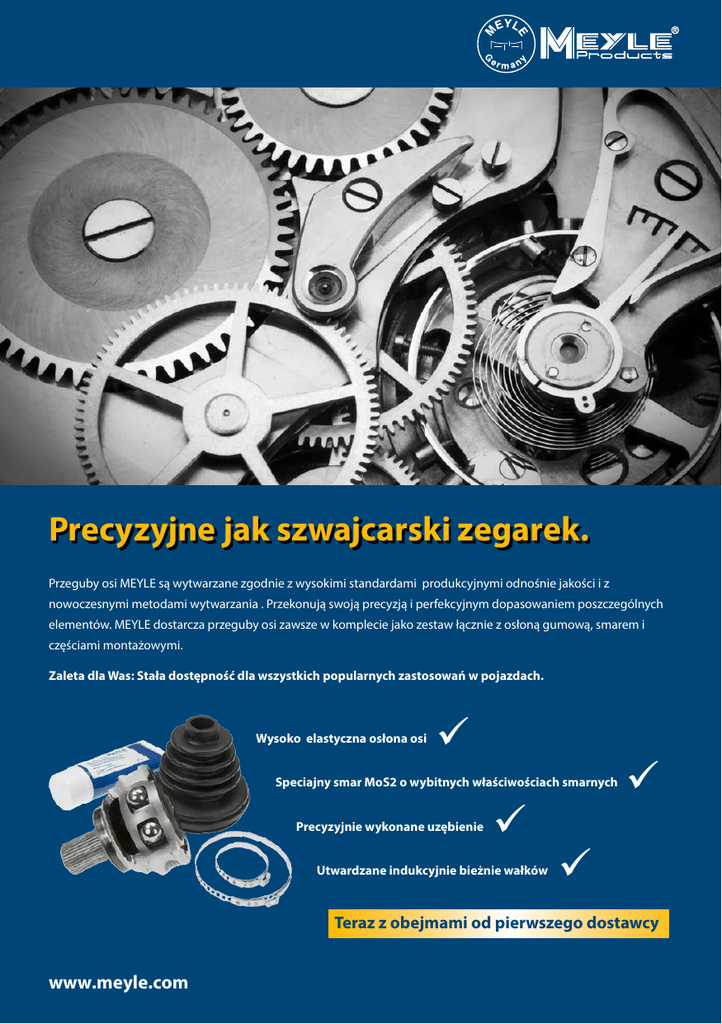 Precyzyjne jak szwajcarski zegarek. Przeguby osi MEYLE są wytwarzane zgodnie z wysokimi standardami produkcyjnymi odnośnie jakości i z nowoczesnymi metodami wytwarzania . Przekonują swoją precyzją i perfekcyjnym dopasowaniem poszczególnych elementów. MEYLE dostarcza przeguby osi zawsze w komplecie jako zestaw łącznie z osłoną gumową, smarem i częściami montażowymi. Zaleta dla Was: Stała dostępność dla wszystkich popularnych zastosowań w pojazdach. Wysoko elastyczna osłona osi Speciajny smar MoS2 o wybitnych właściwościach smarnych Precyzyjnie wykonane uzębienie Utwardzane indukcyjnie bieżnie wałków Teraz z obejmami od pierwszego dostawcy www.meyle.com