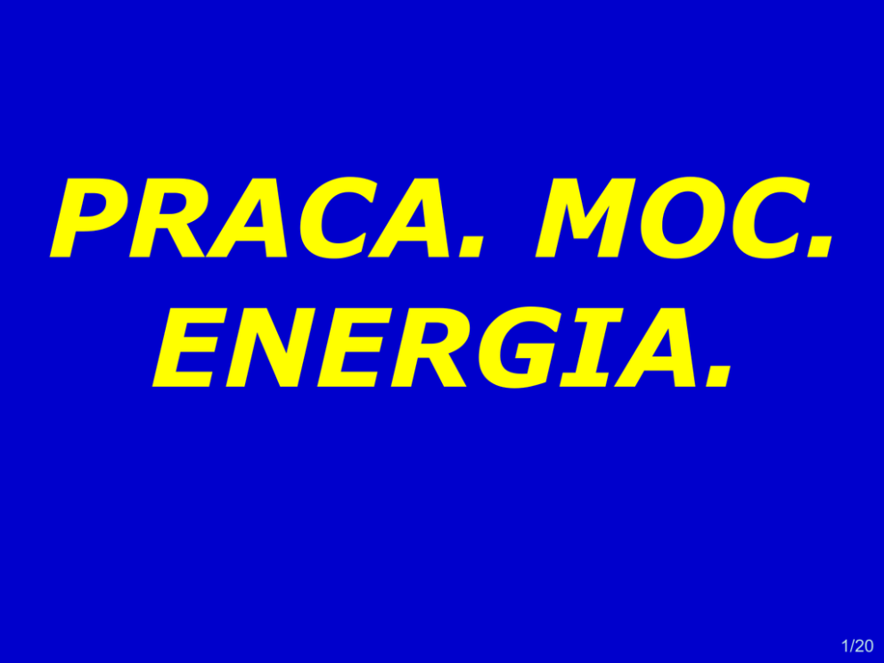PRACA. MOC. ENERGIA. 1/20 Czym jest energia? Większość zjawisk w przyrodzie związana jest z przemianami energii. Energia może zostać przekazana od jednego ciała do drugiego lub ulec przemianie z jednej formy w drugą. 2/20 Praca mechaniczna Siła działająca na ciało wykonuje pracę, gdy: − podczas działania tej siły następuje przemieszczenie ciała lub jego odkształcenie, − kierunki siły i przemieszczenia ciała nie są do siebie prostopadłe. 3/20 Definicja pracy mechanicznej Gdy ciało przesuwa się po linii prostej, pracą nazywamy iloczyn wartości siły działającej na ciało i wartości jego przemieszczenia: W F s Wzór ten możemy stosować, gdy: − Wartość działającej na ciało siły jest stała podczas jego przesuwania, − Zwrot siły jest zgodny ze zwrotem przemieszczenia. 4/20 Praca mechaniczna - wykres Wykres zależności wartości siły od wartości przemieszczenia. Pracę obliczamy jak pole żółtego prostokąta. 5/20 Praca mechaniczna jednostka W F s Jednostką pracy jest dżul [ J ]. 1J=1N1m Siła o kierunku prostopadłym do przemieszczenia nie wykonuje pracy. F s W 0 6/20 Moc Moc danego urządzenia informuje nas o tym, jaką pracę wykonuje ono w czasie 1 sekundy. Mocą urządzenia nazywamy iloraz pracy i czasu, w którym została ona wykonana: W P t Gdzie: P – moc W – praca t – czas 7/20 Moc - jednostka Jednostką mocy jest wat [ W ]. 1W 1J 1s Moc 1 W to w przybliżeniu moc naszych mięśni, jeśli podnosimy w czasie 1 s tabliczkę czekolady (100g) na wysokość 1 m. 8/20 Układ ciał. Układ ciał – dwa lub więcej oddziałujących wzajemnie ciał. Siły wewnętrzne układu – siły, którymi ciała tworzące układ działają na siebie wzajemnie. Siły zewnętrzne układu – siły pochodzące od ciał spoza układu. 9/20 Energia mechaniczna Mówimy, że układ ciał jest zdolny do wykonania pracy, jeżeli posiada on energie mechaniczną. Przyrost energii mechanicznej układu ΔE jest równy pracy sił zewnętrznych, wykonanej nad tym układem: ΔE = W Wracając do poprzedniego stanu, układ może (kosztem swojej energii) wykonać pracę o takiej samej wartości. Jednostką energii jest dżul [ J ]. 10/20 Energia mechaniczna Energię mechaniczną dzielimy na: − energię potencjalną (grawitacji i sprężystości), − energię kinetyczną. Energia potencjalna ciała zależy od jego położenia względem drugiego ciała, z którym oddziałuje. Energia potencjalna grawitacji zmienia się gdy zmienia się odległość ciała od Ziemi. Energia potencjalna sprężystości jest związana z odkształceniem ciała. 11/20 Energia potencjalna Energię potencjalną grawitacji ciała o masie m umieszczonego na wysokości h nad tzw. poziomem zerowym obliczamy za pomocą wzoru: Ep m g h g = 10 m/s2 - przyspieszenie ziemskie 12/20 Energia kinetyczna Energię kinetyczna związana jest z ruchem ciała. Każde ciało, które w danym układzie odniesienia jest w ruchu, posiada w tym układzie energię kinetyczną . Energię kinetyczna obliczamy ze wzoru: 1 2 Ek m v 2 m – masa ciała v – szybkość ciała 13/20 Energia kinetyczna Energia kinetyczna nie zależy od kierunku i zwrotu prędkości ciała. Ek ~ 2 v v 2 razy Ek 4 razy v 3 razy Ek 9 razy 14/20 Zasada zachowania energii Zasada zachowania energii: Jeśli ciała układu oddziałują na siebie tylko siłami grawitacyjnymi lub sprężystości, a siła zewnętrzna nie wykonuje nad nim pracy, to całkowita energia mechaniczna czyli suma energii potencjalnej i kinetycznej tego układu, nie ulega zmianie. EC E p Ek const 15/20 Zasada zachowania energii 1 2 1 2 mgh mgh1 mv1 mv 2 2 16/20 Sprawność Zasada zachowania energii mechanicznej nie jest w praktyce spełniona. Przyczyny: siły oporu i tarcie. Pojawia się inny rodzaj energii. Sprawność maszyny obliczamy ze wzoru: gdzie: W 100 % E – sprawność W – praca użyteczna wykonana przez maszynę E – energia dostarczona maszynie 17/20 Maszyny proste Maszyny proste – ułatwiają wykonywanie pracy przez zastąpienie jednej siły inną (o innej wartości, kierunku, zwrocie lub punkcie przyłożenia). 18/20 Dźwignia dwustronna Warunek równowagi dźwigni dwustronnej: r1 F1 F1 r1 F2 r2 r2 F2 r – długość ramienia siły F – działająca siła (ciężar ciała) DOŚWIADCZENIE OBOWIĄZKOWE: Wyznaczanie masy ciała za pomocą dźwigni dwustronnej, innego ciała o znanej masie i linijki. 19/20 Praca Praca wykonana za pomocą dźwigni jest taka sama jak bez jej użycia (działamy siłą o mniejszej wartości, ale na dłuższej drodze) 20/20