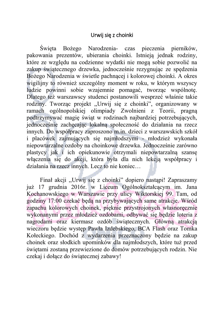 Urwij się z choinki Święta Bożego Narodzenia- czas pieczenia pierników, pakowania prezentów, ubierania choinki. Istnieją jednak rodziny, które ze względu na codzienne wydatki nie mogą sobie pozwolić na zakup świątecznego drzewka, jednocześnie rezygnując ze spędzenia Bożego Narodzenia w świetle pachnącej i kolorowej choinki. A okres wigilijny to również szczególny moment w roku, w którym wszyscy ludzie powinni sobie wzajemnie pomagać, tworząc wspólnotę. Dlatego też warszawscy studenci postanowili wesprzeć właśnie takie rodziny. Tworząc projekt ,,Urwij się z choinki”, organizowany w ramach ogólnopolskiej olimpiady Zwolnieni z Teorii, pragną podtrzymywać magię świąt w rodzinach najbardziej potrzebujących, jednocześnie zachęcając lokalną społeczność do działania na rzecz innych. Do współpracy zaproszono m.in. dzieci z warszawskich szkół i placówek zajmujących się najmłodszymi - młodzież wykonała niepowtarzalne ozdoby na choinkowe drzewka. Jednocześnie zarówno plastycy jak i ich opiekunowie otrzymali niepowtarzalną szansę włączenia się do akcji, która była dla nich lekcją współpracy i działania na rzecz innych. Lecz to nie koniec… Finał akcji ,,Urwij się z choinki” dopiero nastąpi! Zapraszamy już 17 grudnia 2016r. w Liceum Ogólnokształcącym im. Jana Kochanowskiego w Warszawie przy ulicy Wiktorskiej 99. Tam, od godziny 17:00 czekać będą na przybywających same atrakcje. Wśród zapachu kolorowych choinek, pięknie przystrojonych własnoręcznie wykonanymi przez młodzież ozdobami, odbywać się będzie loteria z nagrodami oraz kiermasz ozdób świątecznych. Główną atrakcją wieczoru będzie występ Pawła Izdebskiego, BCA Flash oraz Tomka Kołeckiego. Dochód z wydarzenia przeznaczony będzie na zakup choinek oraz słodkich upominków dla najmłodszych, które tuż przed świętami zostaną przewiezione do domów potrzebujących rodzin. Nie czekaj i dołącz do świątecznej zabawy!