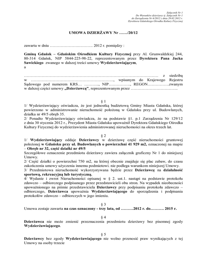 Załącznik Nr 1 Do Warunków dzierżawy tj. Załącznik Nr 1 do Zarządzenia Nr 6/2012 z dnia 29.02.2012 r. Dyrektora Gdańskiego Ośrodka Kultury Fizycznej UMOWA DZIERŻAWY Nr ……/20/12 zawarta w dniu ………………….………. 2012 r. pomiędzy : Gminą Gdańsk – Gdańskim Ośrodkiem Kultury Fizycznej przy Al. Grunwaldzkiej 244, 80-314 Gdańsk, NIP 5844-225-98-22, reprezentowanym przez Dyrektora Pana Jacka Sawickiego zwanego w dalszej treści umowy Wydzierżawiającym, a ……………………………………………………………………………………… z siedzibą w ……………………………………………………., wpisanym do Krajowego Rejestru Sądowego pod numerem KRS… ……….., NIP……………., REGON…………….zwanym w dalszej części umowy „Dzierżawcą”, reprezentowanym przez …………………………….. §1 1/ Wydzierżawiający oświadcza, że jest jednostką budżetową Gminy Miasta Gdańska, której powierzono w administrowanie nieruchomość położoną w Gdańsku przy ul. Budowlanych, działka nr 49/5 obręb 35. 2/ Ponadto Wydzierżawiający oświadcza, że na podstawie §1. p.1 Zarządzenia Nr 129/12 z dnia 30 stycznia 2012 r., Prezydent Miasta Gdańska upoważnił Dyrektora Gdańskiego Ośrodka Kultury Fizycznej do wydzierżawienia administrowanej nieruchomości na okres trzech lat. §2 1/ Wydzierżawiający oddaje Dzierżawcy w dzierżawę część nieruchomości gruntowej położonej w Gdańsku przy ul. Budowlanych o powierzchni 41 929 m2, oznaczonej na mapie – Obręb nr 32, część działki nr 49/5 Szczegółowe oznaczenie przedmiotu dzierżawy zawiera załącznik graficzny Nr 1 do niniejszej Umowy. 2/ Część działki o powierzchni 750 m2, na której obecnie znajduje się plac zabaw, do czasu zakończenia umowy użyczenia innemu podmiotowi. nie podlega warunkom niniejszej Umowy. 3/ Przedmiotowa nieruchomość wykorzystywana będzie przez Dzierżawcę na działalność sportową, rekreacyjną lub turystyczną. 4/ Wydanie i zwrot Nieruchomości opisanej w § 2. ust.1. nastąpi na podstawie protokołu zdawczo – odbiorczego podpisanego przez przedstawicieli obu stron. Na wypadek nieobecności upoważnionego na piśmie przedstawiciela Dzierżawcy przy podpisaniu protokołu zdawczo – odbiorczego, Dzierżawca upoważnia Wydzierżawiającego do sporządzenia i podpisania protokołów zdawczo – odbiorczych w jego imieniu. §3 Umowa zostaje zawarta na czas oznaczony - trzy lata, od ………2012 r. do………. 2015 r. §4 Dzierżawca nie może zmienić przeznaczenia przedmiotu dzierżawy bez pisemnej zgody Wydzierżawiającego. §5 Dzierżawcy bez zgody Wydzierżawiającego nie wolno przenosić praw wynikających z tej Umowy na osoby trzecie §6 1/ Dzierżawca zobowiązuje się w ramach prowadzonej działalności na terenie nieruchomości przeprowadzić tygodniowo 20 godzin zajęć sportowych dla dzieci i młodzieży do wieku juniora włącznie (do 19 roku życia) oraz dostarczyć Wydzierżawiającemu plan godzinowy tych zajęć w rozkładzie tygodniowym jak też jego kolejne aktualizacje. 2/ Na terenie nieruchomości znajduje się między innymi boisko z trawy syntetycznej, które posiada Regulamin korzystania z boiska. Dzierżawca oświadcza, że zapoznał się z obowiązującym Regulaminem, stanowiącym załącznik nr 2 do niniejszej Umowy i zobowiązuje się do zapoznania z nim wszystkich trenerów i zawodników, którzy zobowiązani są do bezwzględnego przestrzegania postanowień tego Regulaminu. 3/ Dzierżawca jest zobowiązany do niezwłocznego informowania Wydzierżawiającego o wszelkich nakładach ponoszonych w ramach prowadzonej działalności na terenie dzierżawionej nieruchomości, które podnoszą jej wartość. 4/ Dzierżawca jest zobowiązany do spełnienia wszelkich wymogów wynikających z ustawy o bezpieczeństwie imprez masowych z dnia 20 marca 2009 r. (Dz.U.Nr 62 poz. 504 z 2009 r.) 5/ Osobą odpowiedzialną za właściwe użytkowanie nieruchomości ze strony Dzierżawcy jest Pan ……………………………………………. §7 Wydzierżawiającemu przysługuje prawo kontroli przedmiotu dzierżawy w każdym czasie. §8 Wydzierżawiającemu służy prawo natychmiastowego rozwiązania Umowy w przypadku: 1) użytkowania przedmiotu dzierżawy w sposób sprzeczny z Umową lub przeznaczeniem, 2) zalegania przez Dzierżawcę z opłatą czynszu dzierżawnego za trzy okresy płatności, 3) przeniesienia praw z Umowy bez zgody Wydzierżawiającego. §9 Strony zastrzegają sobie prawo do wcześniejszego rozwiązania Umowy: 1/ Wydzierżawiający zastrzega sobie prawo do wcześniejszego rozwiązania Umowy za uprzednim 3 miesięcznym okresem wypowiedzenia ze skutkiem na koniec miesiąca kalendarzowego w przypadku zmiany planu zagospodarowania przestrzennego miasta lub przeznaczenia wydzierżawionego terenu dla realizacji innego celu publicznego miasta. 2/ Dzierżawca za uprzednim 3 miesięcznym okresem wypowiedzenia ze skutkiem na koniec miesiąca kalendarzowego, w przypadku braku możliwości realizacji celu, o którym mowa w § 2 Umowy. § 10 1/ Dzierżawca będzie płacił Wydzierżawiającemu czynsz dzierżawny w wysokości: Czynsz roczny netto 41 929 m2 x ………… zł/m2. Podatek VAT w wysokości 23% - zł. GOKF nie jest płatnikiem VAT, od momentu przejścia na płatnika VAT kwota zostanie podniesiona o podatek VAT. Ogółem: 41 929 m2 x ………. zł = ………………zł. Słownie: …………………………………zł …./100 2/ Czynsz płatny jest miesięcznie do 10-go dnia każdego miesiąca z góry, przy czym za datę zapłaty uważa się datę wpływu środków finansowych na konto Gdańskiego Ośrodka Kultury Fizycznej. Nr konta: 59 1240 1268 1111 0010 3857 7588. 3/ Miesięczne raty czynszu wynoszą następująco:…………………… 4/ Za opóźnienie w zapłacie należności Dzierżawca zobowiązany jest wobec Wydzierżawiającego do naliczania odset