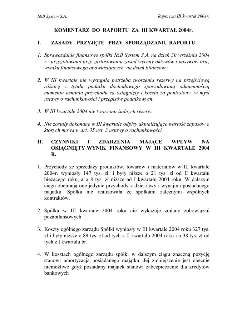 I&B System S.A. 5DSRUW]D,,,NZDUWDáU .20(17$5='25$32578=$,,,.:$57$àU I. =$6$'<35=<-7(35=<6325='=$1,85$32578 1. 6SUDZR]GDQLHILQDQVRZHVSyáNL,%6\VWHP6$QDG]LHZU]HQLD r. przygotowano przy zastosowaniu zasad wyceny aktywów i pasywów oraz wyniku finansowego oboZL]XMF\FKQDG]LHELODQVRZ\ 2. : ,,, NZDUWDOH QLH Z\VWSLáD SRWU]HED WZRU]HQLD UH]HUZ\ QD SU]HMFLRZ Uy*QLF ] W\WXáX SRGDWNX GRFKRGRZHJR VSRZRGRZDQ RGPLHQQRFL momenWX X]QDQLD SU]\FKRGX ]D RVLJQL W\ L NRV]WX ]D SRQLHVLRQ\ Z P\O ustawy o rachunkoZRFLLSU]HSLVyZSRGDWNRZ\FK 3. :,,,NZDUWDOHQLHWZRU]RQR*DGQ\FKUH]HUZ 4. 1LH]RVWDá\GRNRQDQHZ,,,NZDUWDOHRGSLV\DNWXDOL]XMFHZDUWRü]DSDVyZR NWyU\FKPRZDZDUWXVWXVWDZ\RUDFKXQNRZRFL II. &=<11,., , ='$5=(1,$ 0$-&( :3à<: NA OSI*1,7<:<1,.),1$162:<:,,,.:$57$/( R. 1. 3U]\FKRG\ ]H VSU]HGD*\ SURGXNWyZ WRZDUyZ L PDWHULDáyZ Z ,,, NZDUWDOH U Z\QLRVá\ W\V ]á L E\á\ QL*V]H R W\V ]á RG ,, NZDUWDáX ELH*FeJR URNX D R W\V ]á QL*V]H RG , NZDUWDáX 004 roku. W dalszym FLJXREHMPXMRQHMHG\QLHSU]\FKRG\]G]LHU*DZ\LZ\QDMPXSRVLDGDQHJR PDMtNX 6SyáND QLH UHDOL]RZDáD ]H VSyáNDPL ]DOH*Q\PL ZVSyOQ\FK kontraktów. 2. 6SyáND Z ,,, NZDUWDOH URNX QLH Z\ND]XMH ]PLDQ\ ]RERZL]D pozabilansowych. 3. Koszty RJyOQHJR]DU]GX6SyáNLZ\QLRVá\Z,,,NZDUWDOHURNXW\V ]áLE\á\QL*V]HRW\V]áRGW\FK],,NZDUWDáXURNXLRW\V]áRG W\FK],NZDUWDáXEU 4. : NRV]WDFK RJyOQHJR ]DU]GX VSyáNL Z GDOV]\P FLJX ]QDF]Q SR]\FM stanowi amortyzacja SRVLDGDQHJR PDMWNX -HM ]PQLHMV]HQLH MHVW REHFQLH niePR*OLZH JG\* SRVLDGDQ\ PDMWHN VWDQRZL ]DEH]SLHF]HQLH GOD NUHG\WyZ bankowych I&B System S.A. III. 5DSRUW]D,,,NZDUWDáU :<.$=1$-:$)1,(-6=<&+='$5=(L23,6'2.21$ 1. 6SyáNL]DOH*QHSRGSLVDá\ OXEUHDOL]XMNROHMQHNRQWUDNW\ ]NOLHQWDPL*UXSy I&B System w tym m.in. z: • MHGQRVWNDPL ZRMVNRZ\PL QD áF]Q NZRW RN W\V EUXWWR 3RGSLVDQH kontrakty dotyF]]DSURMHNWRZDQLDLZ\NRQDQLDVLHFLNRPSXWHURZ\FK0,//$1RUD]SUDF]ZL]DQ\FK]UR]EXGRZDV\VWHPyZEH]SLHF]HVWZD • PORR Polska S.A. z siedziE Z :DUV]DZLH QD Z\NRQDQLH LQVWDODFML okabloZDQLD VWUXNWXUDOQHJR RUD] RNDEORZDQLD SRG SR]RVWDáH V\VWHP\ VáDERSUGRZH L DXWRPDW\NL QD RELHNFLH 7HOHNRPXQLNDFML 3ROVNLHM Z :DUV]DZLHSU]\XO7ZDUGHM5HDOL]DFMDSUDFSODQRZDQDMHVWGRNRFD URNX :DUWRü ZV]\VWNLFK SUDF REM W\FK XPRZ Z\QRVL EUXWWRRN W\V ]á • ,]E 6NDUERZ Z .DWRZLFDFK QD Z\NRQDQLH SURMHNWX ZUD] ] UHDOL]DFM okaEORZDQLD WHOHGDF\MQHJR L ]DVLODMFHJR VLHFL NRPSXWHURZHM RUD] przystosoZDQLH VHUZHURZQL Z EXG\QNX 2URGND =DPLHMVFRZHJR ,zby Skarbowej w Bielsku-%LDáHMSU]\XO7UDXJXWWDD=DNUHVSUDFREHMPXMH ¾ ,QVWDODFM RNDEORZDQLD VWUXNWXUDOQHJR Z WHFKQRORJLL 1H[DQV GDZQLHM Alcatel) – [ 5- SXQNW\ G\VWU\EXF\MQH SRáF]HQLD SLRQRZH ZLaWáRZRGRZHLPLedziane) ¾ 'HG\NRZDQLQVWDODFM HOHNWU\F]Q– 218 x 3 x E ¾ 'RVWDZ LLQVWDODFM 836-ów ( 600W i 1540W) oraz klimatyzatora 14kW ¾ 6\VWHP .RQWUROL 'RVW SX REHMPXMF\ SRPLHV]F]HQLD LQIRUPDW\NyZ L serwerowni ¾ 6\VWHP 6\JQDOL]DFML :áDPDQLD L 1DSDGX REHMPXMF\ SRPLHV]F]HQLD informatyków i serwerowni ¾ :\NRQDQLH SRGáRJL HOHNWURVWDW\F]QHM REHMPXMFHM SRPLHV]F]HQLD informatyków i serwerowni ¾ 'RVWDZ LLQVWDODFM XU]G]HDNW\ZQ\FK =DZDUFLH XPRZ\ QDVWSLáR Z Z\QLNX Z\JUDQLD SU]H] ,19$5 ,QWHJUDFMH SU]HWDUJXQLHRJUDQLF]RQHJRR]DPyZLHQLHSXEOLF]QH:DUWRüXPRZ\EUXWWR RNW\V]á7HUPLQ]DNRF]HQLDSUDFSU]HZLG]LDQRQDG]LH • 0LWH[ 6$ QD Z\NRQDQLH LQVWDODFML VáDERSUGRZ\FK QD RELHNFLH JDUD*X pod]LHPQHJR QD WHUHQLH FDPSXVX 6**: Z :DUV]DZLH :DUWRü NRQWUDNWX wyQRVLEUXWWRRN]á3UDFHE G]DNRF]RQHGRNRFDZU]HQLDEU • )XQGXV]HP 6NáDGNRZ\P 8EH]SLHF]HQLD 6SRáHF]QHJR 5ROQLNyZ Z WarszaZLH QD GRVWDUF]HQLH L ]DLQVWDORZDQLH V\VWHPX QDJáRQLHQLD ]DJUR*HQLD SR*aURZHJR Z RELHNFLH VDQDWRULXP Z .RáREU]HJX =DZDUFLH I&B System S.A. 5DSRUW]D,,,NZDUWDáU XPRZ\ QDVWSLáR Z Z\Qiku wygrania przez Invar Integracje Sp. z o. o. przetargu nieograniczoQHJR:DUWRüXPRZ\WRNZRWDEUXWWRRNW\V]á - Ponadto : • ZDUWRü SU]HSURZDG]RQHM VSU]HGD*\ Z UDPDFK SXEOLF]QHM VXEVNU\SFML DNFML ]Z\Ná\FKQDRND]LFLHODVHULL-L.Z\QLRVáDáF]QLH]á:DUWRü VSU]HGD*\ DNFML VHULL - Z\QLRVáD ]á WM V]W DNFML ZDUWRüVSU]HGD*\DNFMLVHULL.Z\QLRVáD]áWMV]W DNFMLàF]QHNRV]W\]DOLF]RQHGRNRV]WyZHPLVMLZ\QRV]-]á]WHJR z W\WXáX SU]\JRWRZDQLD L SU]HSURZDG]HQLD RIHUW\ - ]á VSRU]G]HQLD prospektu emisyjnego 47 948,- ]á SURPRFML RIHUW\ - ]á UHGQL NRV]W SU]HSURZDG]HQLD VXEVNU\SFML SU]\SDGDMF\ QD MHGQRVWN SDSLHUX ZDUWRFLoZHJRZ\QRVL]á • VSyáNL ]DOH*QH SRLQIRUPRZDá\ R VSU]HGD*\ VZRLFK ZLHU]\WHOQRFL ZREHF ,%6\VWHP6$ZáF]QHMNZRFLH]á • 6G 5HMRQRZ\ GOD àRG]L UyGPLHFLD Z àRG]L ;; :\G]LDá .UDMRZHJR ReMHVWUX 6GRZHJRSRVWDQRZLHQLHP]GQLDVLHUSQLDUV\JVSUDZ\ LD.XX NS-RE-.56 GRNRQDá UHMHVWUDFML SRGZ\*V]HQLD kapitaáX ]DNáDGRZHJR GR Z\VRNRFL ]á SRSU]H] ]DUHMHVWURZDQLHV]WXNQRZHMHPLVMLDNFML]Z\Ná\FKQDRND]LFLHOD VHULL - R ZDUWRFL QRPLQDOQHM -]á ND*GD RUD] V]WXN QRZHM HPLVML DNFML ]Z\Ná\FK QD RND]LFLHOD VHULL . R ZDUWRFL QRPLQDOQHM ]á ND*GD =DUHMHVWURZDQH DNFMH ]RVWDá\ SRNU\WH ZNáDGDPL QLHSLHQL *Q\PL R áF]QHM ZDUWRFL ]á 2JyOQD OLF]ED JáRVyZ Z\QLNDMFD ]H wszystkich wyemitowanych akcji po zarejHVWURZDQLXSRGZ\*V]HQLDNDSLWDáX ]DNáDGRZHJRZ\Qosi 23.957.909 • ZU]HQLD URNX .UDMRZ\ 'HSR]\W 3DSLHUyZ :DUWRFLRZ\FK6$Z :DUV]DZLH8FKZDá1U]GQLDSU]\MáGR.'3: GZD PLOLRQ\ VWR V]HVQDFLH W\VL F\ RVLHPVHW G]LHZL üG]LHVLW GZD DNFMH ]Z\NáHQDRND]LFLHODVHULL-RZDUWRFL QRPLQDOQHM ]áMHGHQ]áRW\ND*GD R]QDF]DMF MH NRGHP 3/%5670 RUD] MHGHQ PLOLRQ dzieZL üVHW WU]\G]LHFL G]LHZL ü W\VL F\ GZLHFLH VLHGHPQDFLH DNFML ]Z\Ná\FK QD RND]LFLHOD VHULL . R ZDUWRFL QRPLQDOQHM ]á MHGHQ ]áRW\ ND*GDR]QDF]aMFMHNRGHP3/%5670 • ,QYDU%LXUR6\VWHP6$RWU]\PDá8FKZDá 1U=DU]GX*LHáG\ 3DSLHUyZ:DUWRFLRZ\FKZ:DUV]DZLH6$]GQLDZU]HQLDURNXR wprowadzeniu z dniem 21 wr]HQLDURNXZWU\ELH]Z\Ná\PGRREURWX JLHáGRZHJR QD U\QNX SRGVWDZRZ\P DNFML ]Z\Ná\FK QD RND]LFLHOD I&B System S.A. 5DSRUW]D,,,NZDUWDáU seULL$ %&L'RUD]DNFMLVHULL.:DUXQNLHPZHMFLDZ*\FLH poZ\*V]HM XFKZDá\ MHVW GRNRQDQLH SU]H] .UDMRZ\ 'HSR]\W 3DSLHUyZ WartoFLRZ\FK6$ZGQLXZU]HQLDDV\PLODFMLDNFMLVHULL$%& D i K oznaczonych kodami „PLBRSTM00056” i „PLBRSTM00098” z DNFMDPL E GF\PL Z REURFLH JLHáGRZ\P R]QDF]onymi kodem „PLBRSTM00015”.