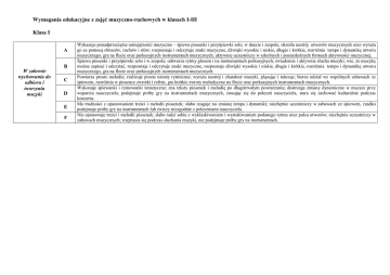 Wymagania edukacyjne z zajęć muzyczno-ruchowych w klasach I-III Klasa I A B W zakresie wychowania do odbioru i tworzenia muzyki C D E F Wykazuje ponadprzeciętne umiejętności muzyczne – śpiewa piosenki i przyśpiewki solo, w duecie i zespole, określa nastrój utworów muzycznych oraz wyraża go za pomocą obrazów, ruchów i słów; rozpoznaje i odczytuje znaki muzyczne, dźwięki wysokie i niskie, długie i krótkie, rozróżnia tempo i dynamikę utworu muzycznego; gra na flecie oraz perkusyjnych instrumentach muzycznych; aktywnie uczestniczy w szkolnych i pozaszkolnych formach aktywności muzycznej. Śpiewa piosenki i przyśpiewki solo i w zespole; odtwarza rytmy głosem i na instrumentach perkusyjnych; świadomie i aktywnie słucha muzyki; wie, że muzykę można zapisać i odczytać, rozpoznaje i odczytuje znaki muzyczne, rozpoznaje dźwięki wysokie i niskie, długie i krótkie, rozróżnia tempo i dynamikę utworu muzycznego, gra na flecie oraz perkusyjnych instrumentach muzycznych. Powtarza proste melodie; realizuje proste tematy rytmiczne; wyraża nastrój i charakter muzyki, pląsając i tańcząc; bierze udział we wspólnych zabawach ze śpiewem, rozróżnia w piosence zwrotki i refren, gra krótkie zwroty melodyczne na flecie oraz perkusyjnych instrumentach muzycznych. Wykonuje śpiewanki i rymowanki tematyczne; zna teksty piosenek i melodię po długotrwałym powtarzaniu; dostrzega zmiany dynamiczne w muzyce przy wsparciu nauczyciela; podejmuje próby gry na instrumentach muzycznych, stosując się do poleceń nauczyciela, stara się zachować kulturalnie podczas koncertu. Ma trudności z opanowaniem treści i melodii piosenek; słabo reaguje na zmianę tempa i dynamiki; niechętnie uczestniczy w zabawach ze śpiewem, rzadko podejmuje próby gry na instrumentach lub ćwiczy niezgodnie z poleceniami nauczyciela. Nie opanowuje treści i melodii piosenek; słabo radzi sobie z wyklaskiwaniem i wystukiwaniem podanego rytmu oraz pulsu utworów; niechętnie uczestniczy w zabawach muzycznych; rozprasza się podczas słuchania muzyki, nie podejmuje próby gry na instrumentach. Wymagania edukacyjne z zajęć muzyczno-ruchowych w klasach I-III Klasa II A B W zakresie wychowania do tworzenia muzyki C D E F Określa elementy muzyki: melodię, rytm, wysokość dźwięku, akompaniament, tempo, dynamikę utworów muzycznych, wyraża nastrój utworów muzycznych za pomocą obrazów, ruchów i słów; śpiewa piosenki i przyśpiewki solo, w duecie i zespole, rozpoznaje, potrafi zapisać i odczytać znaki muzyczne, gra na flecie oraz perkusyjnych instrumentach muzycznych; poprawnie stosuje terminy muzyczne, taktuje na dwa, trzy, cztery; aktywnie uczestniczy w szkolnych i pozaszkolnych formach aktywności muzycznej. Określa elementy muzyki: melodię, rytm, wysokość dźwięku, akompaniament, tempo, dynamikę utworów muzycznych, wyraża nastrój utworów muzycznych za pomocą obrazów, ruchów i słów; śpiewa piosenki i przyśpiewki w duecie i zespole, rozpoznaje, potrafi zapisać i odczytać znaki muzyczne, gra na flecie oraz perkusyjnych instrumentach muzycznych; poprawnie stosuje niektóre terminy muzyczne, taktuje na dwa, trzy, cztery. Powtarza proste melodie; realizuje proste tematy rytmiczne; wyraża nastrój i charakter muzyki, pląsając i tańcząc; bierze udział we wspólnych zabawach ze śpiewem, gra fragmenty piosenek i zwroty melodyczne na flecie oraz perkusyjnych instrumentach muzycznych, zna solmizacyjne nazwy dźwięków i wartości rytmicznych, wyraża nastrój i charakter muzyki, pląsając i tańcząc, odczytuje i zapisuje krótkie zwroty rytmiczne. Nie zawsze potrafi określić nastrój utworu muzycznego; próbuje wyrażać nastrój i charakter muzyki, pląsając i tańcząc; ma problem z rozpoznaniem i nazwaniem znaków notacji muzycznej, podejmuje próby gry na instrumentach muzycznych, stosując się do poleceń nauczyciela . Nie zawsze dostrzega różnice w charakterze słuchanej muzyki; niechętnie wyraża nastrój i charakter muzyki, pląsając i tańcząc, ma problem z rozpoznaniem i nazwaniem niektórych znaków notacji muzycznej, niechętnie uczestniczy w zabawach ze śpiewem, rzadko podejmuje próby gry na instrumentach lub ćwiczy niezgodnie z poleceniami nauczyciela. Często nie dostrzega różnic w charakterze słuchanej muzyki; rzadko wyraża nastrój i charakter muzyki, pląsając i tańcząc, nie potrafi rozpoznać i nazwać znaków notacji muzycznej, słabo radzi sobie z wyklaskiwaniem i wystukiwaniem rytmu utworów; niechętnie uczestniczy w zabawach muzycznych; rozprasza się podczas słuchania muzyki, nie podejmuje próby gry na instrumentach. Wymagania edukacyjne z zajęć muzyczno-ruchowych w klasach I-III Klasa III A B W zakresie odbioru muzyki. C D E F A B W zakresie tworzenia muzyki C D E F Wykazuje aktywność twórczą oraz szczególne zdolności muzyczne; umie śpiewać piosenki solo, w kanonie, tworzy rymowanki tematyczne , układa i realizuje rytmy i wzory rytmiczne na instrumentach perkusyjnych; gra na flecie oraz ewentualnie innych instrumentach muzycznych; rozpoznaje i reaguje ruchem na zmiany tempa, metrum i dynamiki; poprawnie stosuje terminy muzyczne, bezbłędnie rozpoznaje, potrafi zapisać i odczytać znaki muzyczne, zna i tańczy kroki i figury wybranych tańców ludowych; aktywnie słucha muzyki i odróżnia jej elementy (melodia, rytm, wysokość dźwięku, tempo); aktywnie uczestniczy w szkolnych i pozaszkolnych formach aktywności muzycznej, wyraża swoje opinie na temat wysłuchanych prezentacji muzycznych. Umie śpiewać indywidualnie i zespołowo poznane piosenki i przyśpiewki, odtwarza proste rytmy i wzory rytmiczne na instrumentach perkusyjnych, rozpoznaje niektóre rodzaje głosów ludzkich i brzmienie wybranych instrumentów muzycznych; gra proste melodie i akompaniamenty na flecie oraz perkusyjnych instrumentach; zna solmizacyjne i literowe nazwy dźwięków i wartości rytmicznych i ich pisownię, stosuje ter