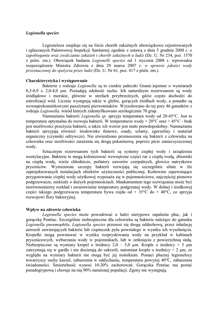 Legionella species Legioneloza znajduje się na liście chorób zakaźnych obowiązkowo rejestrowanych i zgłaszanych Państwowej Inspekcji Sanitarnej zgodnie z ustawą z dnia 5 grudnia 2008 r. o zapobieganiu oraz zwalczaniu zakaŜeń i chorób zakaźnych u ludzi (Dz. U. Nr 234, poz. 1570 z późn. zm.). Obowiązek badania Legionelli species od 1 stycznia 2008 r. wprowadza rozporządzenie Ministra Zdrowia z dnia 29 marca 2007 r. w sprawie jakości wody przeznaczonej do spoŜycia przez ludzi (Dz. U. Nr 61, poz. 417 z późn. zm.). Charakterystyka i występowanie Bakterie z rodzaju Legionella są to cienkie pałeczki Gram(-)ujemne o wymiarach 0,3-0,9 x 2,0-4,0 µm. Posiadają zdolność ruchu. Ich naturalnym rezerwuarem są wody śródlądowe i morskie, głównie w strefach przybrzeŜnych, gdzie często dochodzi do eutrofizacji wód. Licznie występują takŜe w glebie, gorących źródłach wody, a ponadto są wewnątrzkomórkowymi pasoŜytami pierwotniaków. Wyizolowano do tej pory 46 gatunków z rodzaju Legionella, wśród których zidentyfikowano serologicznie 70 grup. NamnaŜaniu bakterii Legionella sp. sprzyja temperatura wody od 20-45°C. Jest to temperatura optymalna do rozwoju bakterii. W temperaturze wody < 20°C oraz > 45°C - brak jest moŜliwości przeŜycia bakterii, a takŜe ich wzrost jest mało prawdopodobny. NamnaŜaniu bakterii sprzyjają równieŜ: środowisko tlenowe, osady, szlamy, zgorzeliny i materiał organiczny (czynniki odŜywcze). Nie stwierdzono przenoszenia się bakterii z człowieka na człowieka oraz moŜliwości zaraŜenia się drogą pokarmową, poprzez picie zanieczyszczonej wody. Sztucznym rezerwuarem tych bakterii są systemy ciepłej wody i urządzenia wentylacyjne. Bakterie te mogą kolonizować wewnętrzne części rur z ciepłą wodą, zbiorniki na ciepłą wodę, wieŜe chłodnicze, perlatory zaworów czerpalnych, głowice natryskowe pryszniców. Wymienione szczepy bakterii rozwijają się szczególnie silnie w źle zaprojektowanych instalacjach obiektów uŜyteczności publicznej. Kotłownie zapewniające przygotowanie ciepłej wody uŜytkowej wyposaŜa się w pojemnościowe, najczęściej pionowe podgrzewacze, niekiedy o duŜych pojemnościach. Mankamentem tego rozwiązania moŜe być nierównomierny rozkład i uwarstwienie temperatury podgrzanej wody. W dolnej i środkowej części takiego podgrzewacza temperatura bywa rzędu od + 35°C do + 40°C, co sprzyja rozwojowi flory bakteryjnej. Wpływ na zdrowie człowieka Legionella species moŜe powodować u ludzi nietypowe zapalenie płuc, jak i gorączkę Pontiac. Szczególnie niebezpieczne dla człowieka są bakterie naleŜące do gatunku Legionella pneumophila. Legionella species przenosi się drogą oddechową, przez inhalację aerozoli zawierających bakterie lub cząsteczek pyłu powstałego w wyniku ich wyschnięcia. Kropelki mogą powstawać w wyniku rozpryskiwania wody na przykład w kabinach prysznicowych, wzburzania wody w pojemnikach, lub w zetknięciu z powierzchnią stałą. Niebezpieczne są wymiary kropel o średnicy 2,0 – 5,0 µm. Krople o średnicy > 5 µm zatrzymują się w gardle i nie docierają do oskrzeli, natomiast krople o średnicy < 2 µm, ze względu na wymiary bakterii nie mogą być jej nośnikiem. Postaci płucnej legionelozy towarzyszy suchy kaszel, zaburzenia w oddychaniu, temperatura powyŜej 40°C, zaburzenia świadomości. Śmiertelność wynosi 10-20% zachorowań. Gorączka Pontiac ma postać pseudogrypową i choruje na nią 90% naraŜonej populacji. Zgony nie występują. Metody zapobiegania występowaniu i namnaŜaniu Jedną z podstawowych zasad dostosowania instalacji ciepłej wody do działań zmniejszających ryzyko zakaŜenia bakteriami Legionella jest zapewnienie stałego obiegu wody ciepłej oraz uzyskanie temperatury ciepłej wody uŜytkowej w punkcie czerpalnym nie niŜszej niŜ 55°C i nie wyŜszej niŜ 60°C. Instalacja taka powinna umoŜliwiać przeprowadzanie jej okresowej dezynfekcji termicznej przy temperaturze wody nie niŜszej niŜ 70°C - zgodnie z §120 ust. 1, 2 i 3 rozporządzenia Ministra Infrastruktury w sprawie warunków technicznych, jakim powinny odpowiadać budynki i ich usytuowanie (Dz. U. z 2002 r. Nr 75, poz. 690 z późn. zm.). NaleŜy nadmienić, Ŝe bakterie Legionella w temperaturach wyŜszych niŜ +60°C, nie tylko się nie namnaŜają, ale i szybko giną. Dezynfekcja termiczna polega na okresowym podwyŜszeniu temperatury wody ciepłej do 70-80°C (minimalna temperatura w odległych punktach 60°C). NamnaŜaniu bakterii Legionella species zapobiega równieŜ przeprowadzanie okresowej - chemicznej lub termicznej dezynfekcji instalacji ciepłej wody. Dezynfekcja chemiczna moŜe być prowadzona: - podchlorynem sodu (hiperchlorowanie szokowe - do otrzymania stęŜenia chloru wolnego między 20-50 mg/l, czas kontaktu: 1-2 godziny). - hiperchlorowanie ciągłe - do otrzymania w punktach uŜytkowania stałego stęŜenia wolnego chloru między 1-3 mg/l) albo dwutlenkiem chloru (do otrzymania stęŜenia dwutlenku chloru w instalacji między 0,2 – 0,4 mg/l). Konieczne jest takŜe dokonywanie przeglądu stanu instalacji ciepłej wody. Instalacja powinna być utrzymywana w czystości, naleŜy zlikwidować tzw. „ślepe odcinki instalacji”, aby nie dopuszczać do zastoin wody. Ponadto naleŜy zapobiegać procesom korozji i tworzenia się złogów oraz utrzymywać w czystości zawory, krany, natryski oraz prysznice itp. Wszystkie powyŜsze czynności mają charakter prewencyjny, zapobiegający namnaŜaniu się bakterii w instalacjach ciepłej wody. W celu monitorowania stanu instalacji wodnych naleŜy przeprowadzać systematyczne badania polegające na wykrywaniu bakterii z rodzaju Legionella. Pobieranie, przechowywanie i transport próbek wody do badań Próbki wody mogą być pobierane wyłącznie przez personel przeszkolony w zakresie pobierania i postępowania z próbkami wody. Pobieranie próbek gorącej wody naleŜy wykonywać 