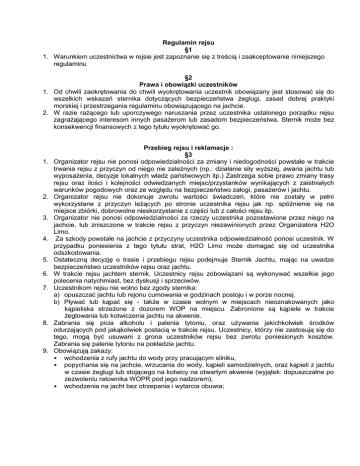 Regulamin rejsu §1 1. Warunkiem uczestnictwa w rejsie jest zapoznanie się z treścią i zaakceptowanie niniejszego regulaminu §2 Prawa i obowiązki uczestników 1. Od chwili zaokrętowania do chwili wyokrętowania uczestnik obowiązany jest stosować się do wszelkich wskazań sternika dotyczących bezpieczeństwa żeglugi, zasad dobrej praktyki morskiej i przestrzegania regulaminu obowiązującego na jachcie. 2. W razie rażącego lub uporczywego naruszania przez uczestnika ustalonego porządku rejsu zagrażającego interesom innych pasażerom lub zasadom bezpieczeństwa, Sternik może bez konsekwencji finansowych z tego tytułu wyokrętować go. 1. 2. 3. 4. 5. 6. 7. 8. 9. Przebieg rejsu i reklamacje : §3 Organizator rejsu nie ponosi odpowiedzialności za zmiany i niedogodności powstałe w trakcie trwania rejsu z przyczyn od niego nie zależnych (np.: działanie siły wyższej, awaria jachtu lub wyposażenia, decyzje lokalnych władz państwowych itp.) Zastrzega sobie prawo zmiany trasy rejsu oraz ilości i kolejności odwiedzanych miejsc/przystanków wynikających z zaistniałych warunków pogodowych oraz ze względu na bezpieczeństwo załogi, pasażerów i jachtu. Organizator rejsu nie dokonuje zwrotu wartości świadczeń, które nie zostały w pełni wykorzystane z przyczyn leżących po stronie uczestnika rejsu jak np. spóźnienie się na miejsce zbiórki, dobrowolne nieskorzystanie z części lub z całości rejsu itp. Organizator nie ponosi odpowiedzialności za rzeczy uczestnika pozostawione przez niego na jachcie, lub zniszczone w trakcie rejsu z przyczyn niezawinionych przez Organizatora H2O Limo. Za szkody powstałe na jachcie z przyczyny uczestnika odpowiedzialność ponosi uczestnik. W przypadku poniesienia z tego tytułu strat, H2O Limo może domagać się od uczestnika odszkodowania. Ostateczną decyzję o trasie i przebiegu rejsu podejmuje Sternik Jachtu, mając na uwadze bezpieczeństwo uczestników rejsu oraz jachtu. W trakcie rejsu jachtem sternik. Uczestnicy rejsu zobowiązani są wykonywać wszelkie jego polecenia natychmiast, bez dyskusji i sprzeciwów. Uczestnikom rejsu nie wolno bez zgody sternika: a) opuszczać jachtu lub rejonu cumowania w godzinach postoju i w porze nocnej. b) Pływać lub kąpać się - także w czasie wolnym w miejscach nieoznakowanych jako kąpieliska strzeżone z dozorem WOP na miejscu. Zabronione są kąpiele w trakcie żeglowania lub kotwiczenia jachtu na akwenie. Zabrania się picia alkoholu i palenia tytoniu, oraz używania jakichkolwiek środków odurzających pod jakąkolwiek postacią w trakcie rejsu. Uczestnicy, którzy nie zastosują się do tego, mogą być usuwani z grona uczestników rejsu bez zwrotu poniesionych kosztów. Zabrania się palenie tytoniu na pokładzie jachtu. Obowiązują zakazy: • wchodzenia z rufy jachtu do wody przy pracującym silniku, • popychania się na jachcie, wrzucania do wody, kąpieli samodzielnych, oraz kąpieli z jachtu w czasie żeglugi lub stojącego na kotwicy na otwartym akwenie (wyjątek: dopuszczalne po zezwoleniu ratownika WOPR pod jego nadzorem), • wchodzenia na jacht bez otrzepania i wytarcia obuwia;