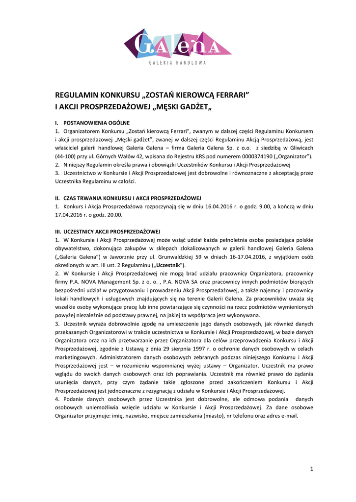 REGULAMIN KONKURSU „ZOSTAŃ KIEROWCĄ FERRARI” I AKCJI PROSPRZEDAŻOWEJ „MĘSKI GADŻET„ I. POSTANOWIENIA OGÓLNE 1. Organizatorem Konkursu „Zostań kierowcą Ferrari”, zwanym w dalszej części Regulaminu Konkursem i akcji prosprzedazowej „Męski gadżet”, zwanej w dalszej części Regulaminu Akcją Prosprzedażową, jest właściciel galerii handlowej Galeria Galena – firma Galeria Galena Sp. z o.o. z siedzibą w Gliwicach (44-100) przy ul. Górnych Wałów 42, wpisana do Rejestru KRS pod numerem 0000374190 („Organizator”). 2. Niniejszy Regulamin określa prawa i obowiązki Uczestników Konkursu i Akcji Prosprzedażowej 3. Uczestnictwo w Konkursie i Akcji Prosprzedażowej jest dobrowolne i równoznaczne z akceptacją przez Uczestnika Regulaminu w całości. II. CZAS TRWANIA KONKURSU I AKCJI PROSPRZEDAŻOWEJ 1. Konkurs i Akcja Prosprzedażowa rozpoczynają się w dniu 16.04.2016 r. o godz. 9.00, a kończą w dniu 17.04.2016 r. o godz. 20.00. III. UCZESTNICY AKCJI PROSPRZEDAŻOWEJ 1. W Konkursie i Akcji Prosprzedażowej może wziąć udział każda pełnoletnia osoba posiadająca polskie obywatelstwo, dokonująca zakupów w sklepach zlokalizowanych w galerii handlowej Galeria Galena („Galeria Galena”) w Jaworznie przy ul. Grunwaldzkiej 59 w dniach 16-17.04.2016, z wyjątkiem osób określonych w art. III ust. 2 Regulaminu („Uczestnik”). 2. W Konkursie i Akcji Prosprzedażowej nie mogą brać udziału pracownicy Organizatora, pracownicy firmy P.A. NOVA Management Sp. z o. o. , P.A. NOVA SA oraz pracownicy innych podmiotów biorących bezpośredni udział w przygotowaniu i prowadzeniu Akcji Prosprzedażowej, a także najemcy i pracownicy lokali handlowych i usługowych znajdujących się na terenie Galerii Galena. Za pracowników uważa się wszelkie osoby wykonujące pracę lub inne powtarzające się czynności na rzecz podmiotów wymienionych powyżej niezależnie od podstawy prawnej, na jakiej ta współpraca jest wykonywana. 3. Uczestnik wyraża dobrowolnie zgodę na umieszczenie jego danych osobowych, jak również danych przekazanych Organizatorowi w trakcie uczestnictwa w Konkursie i Akcji Prosprzedażowej, w bazie danych Organizatora oraz na ich przetwarzanie przez Organizatora dla celów przeprowadzenia Konkursu i Akcji Prosprzedażowej, zgodnie z Ustawą z dnia 29 sierpnia 1997 r. o ochronie danych osobowych w celach marketingowych. Administratorem danych osobowych zebranych podczas niniejszego Konkursu i Akcji Prosprzedażowej jest – w rozumieniu wspomnianej wyżej ustawy – Organizator. Uczestnik ma prawo wglądu do swoich danych osobowych oraz ich poprawiania. Uczestnik ma również prawo do żądania usunięcia danych, przy czym żądanie takie zgłoszone przed zakończeniem Konkursu i Akcji Prosprzedażowej jest jednoznaczne z rezygnacją z udziału w Konkursie i Akcji Prosprzedażowej. 4. Podanie danych osobowych przez Uczestnika jest dobrowolne, ale odmowa podania danych osobowych uniemożliwia wzięcie udziału w Konkursie i Akcji Prosprzedażowej. Za dane osobowe Organizator przyjmuje: imię, nazwisko, miejsce zamieszkania (miasto), nr telefonu oraz adres e-mail. 1 IV. ZASADY I PRZEBIEG PLEBISCYTU I KONKURSU 1. Aby wziąć udział w Konkursie i Akcji Prosprzedażowej należy dokonać w dniach 16-17.04.2016 na terenie Galerii Galena zakupów za min. 100 zł przy możliwości łączenia maksymalnie 2 paragonów potwierdzających zakupy w dniach 16-17.04.2016. W przypadku łączenia paragonów tylko jeden z nich może pochodzić z hipermarketu Carrefour. Na podstawie tych samych paragonów Uczestnicy mogą wziąć udział zarówno w Konkursie, jak w Akcji Prosprzedażowej. 2. Przez dokonanie zakupu rozumie się zakup towarów lub usług dokonany w formie płatności gotówką lub kartą płatniczą wydaną przez bank. W Plebiscycie i Konkursie mogą brać udział tylko paragony dokumentujące zakup dokonany gotówką lub kartą płatniczą wydaną przez bank. W Konkursie i Akcji Prosprzedażowej nie mogą brać udziału paragony dokumentujące zakup dokonany kartą podarunkową lub bonem podarunkowym. 3. Paragony podlegają zgłoszeniu w wyznaczonym na terenie Galerii Galena Punkcie Konkursowym („Punkt”), który czynny jest w terminie 16.04.2016, godz. 9.00-21.00 oraz 17.04.2016, godz. 10.00-20.00. Punkt zlokalizowany jest na pasażu obok wejścia głównego do galerii. Przedstawione przez Uczestników paragony zostaną opieczętowane. 4. Akcja Prosprzedażowa: a) 1000 osób, które jako pierwsze zgłoszą się do Punktu w czasie trwania Akcji Prosprzedażowej otrzyma upominki. Podczas trwania Akcji Prosprzedażowej zostanie rozdanych 1000 upominków. b) Każdy Uczestnik może otrzymać tylko jeden upominek. c) Przy odbiorze upominku Uczestnik zobowiązuje się do wypełnienia Oświadczenia. Treść Oświadczenia stanowi Załącznik nr 1 do niniejszego Regulaminu. 5. Konkurs „Zostań kierowcą Ferrari”. a) Aby wziąć udział w Konkursie należy dokonać w dniach 16-17.04.2016 na terenie Galerii Galena zakupów za min. 100 zł przy możliwości łączenia maksymalnie 2 paragonów. W przypadku łączenia paragonów tylko jeden z nich może pochodzić z hipermarketu Carrefour. b) Za każde wydane 100 zł (na maksymalnie 2 paragonach) Uczestnik otrzymuje w Punkcie Konkursowym, o którym mowa w punkcie 3 jeden Kupon Konkursowy, zwany w dalszej części Regulaminu Kuponem. Przedstawione paragony zostaną opieczętowane. c) Zadanie konkursowe polega na uzupełnieniu zdania: „to ja powinienem zostać kierowcą Ferrari, ponieważ…” d) Miejsce, gdzie należy wpisać zadanie konkursowe znajduje się na Kuponie, o którym mowa w punkcie 5b. e) W Konkursie biorą udział tylko Kupony czytelnie i prawidłowo wypełnione. Przez prawidłowo wypełniony Kupon rozumie się wypełnienie wszystkich pól znajdujących się na Kuponie. f) Zadanie konkursowe będzie oceniane przez Komisję Konkursową według kryteriów pomysłowości, oryginalnoś