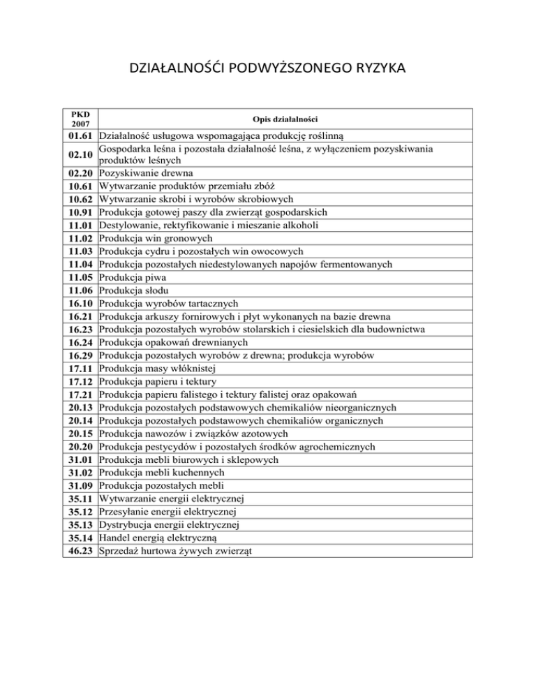 DZIAŁALNOŚĆI PODWYŻSZONEGO RYZYKA PKD 2007 Opis działalności 01.61 Działalność usługowa wspomagająca produkcję roślinną Gospodarka leśna i pozostała działalność leśna, z wyłączeniem pozyskiwania 02.10 produktów leśnych 02.20 Pozyskiwanie drewna 10.61 Wytwarzanie produktów przemiału zbóż 10.62 Wytwarzanie skrobi i wyrobów skrobiowych 10.91 Produkcja gotowej paszy dla zwierząt gospodarskich 11.01 Destylowanie, rektyfikowanie i mieszanie alkoholi 11.02 Produkcja win gronowych 11.03 Produkcja cydru i pozostałych win owocowych 11.04 Produkcja pozostałych niedestylowanych napojów fermentowanych 11.05 Produkcja piwa 11.06 Produkcja słodu 16.10 Produkcja wyrobów tartacznych 16.21 Produkcja arkuszy fornirowych i płyt wykonanych na bazie drewna 16.23 Produkcja pozostałych wyrobów stolarskich i ciesielskich dla budownictwa 16.24 Produkcja opakowań drewnianych 16.29 Produkcja pozostałych wyrobów z drewna; produkcja wyrobów 17.11 Produkcja masy włóknistej 17.12 Produkcja papieru i tektury 17.21 Produkcja papieru falistego i tektury falistej oraz opakowań 20.13 Produkcja pozostałych podstawowych chemikaliów nieorganicznych 20.14 Produkcja pozostałych podstawowych chemikaliów organicznych 20.15 Produkcja nawozów i związków azotowych 20.20 Produkcja pestycydów i pozostałych środków agrochemicznych 31.01 Produkcja mebli biurowych i sklepowych 31.02 Produkcja mebli kuchennych 31.09 Produkcja pozostałych mebli 35.11 Wytwarzanie energii elektrycznej 35.12 Przesyłanie energii elektrycznej 35.13 Dystrybucja energii elektrycznej 35.14 Handel energią elektryczną 46.23 Sprzedaż hurtowa żywych zwierząt