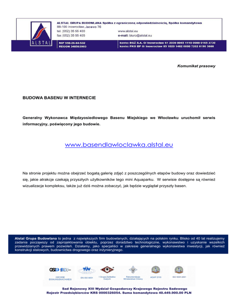 Komunikat prasowy BUDOWA BASENU W INTERNECIE Generalny Wykonawca Międzyosiedlowego Basenu Miejskiego we Włocławku uruchomił serwis informacyjny, poświęcony jego budowie. www.basendlawloclawka.alstal.eu Na stronie projektu można obejrzeć bogatą galerię zdjęć z poszczególnych etapów budowy oraz dowiedzieć się, jakie atrakcje czekają przyszłych użytkowników tego mini Aquaparku. W serwisie dostępne są również wizualizacje kompleksu, także już dziś można zobaczyć, jak będzie wyglądał przyszły basen. Alstal Grupa Budowlana to jedna z największych firm budowlanych, działających na polskim rynku. Blisko od 40 lat realizujemy zadania począwszy od zaprojektowania obiektu, poprzez doradztwo technologiczne, wykonawstwo i uzyskanie wszelkich przewidzianych prawem pozwoleń. Działamy, jako specjaliści w zakresie generalnego wykonawstwa inwestycji, jak również konstrukcji stalowych, budownictwa drogowego oraz inżynieryjnego. Sad Rejonowy XIII Wydział Gospodarczy Krajowego Rejestru Sadowego Rejestr Przedsiębiorców KRS 0000326054. Suma komandytowa 40.449.900.00 PLN