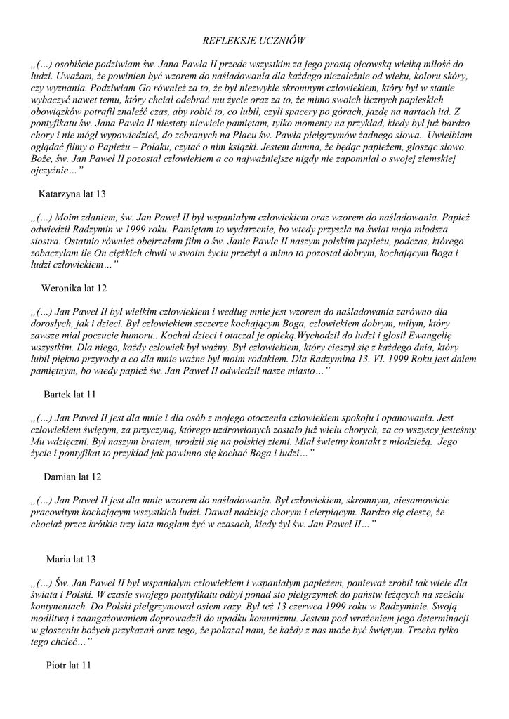REFLEKSJE UCZNIÓW „(…) osobiście podziwiam św. Jana Pawła II przede wszystkim za jego prostą ojcowską wielką miłość do ludzi. Uważam, że powinien być wzorem do naśladowania dla każdego niezależnie od wieku, koloru skóry, czy wyznania. Podziwiam Go również za to, że był niezwykle skromnym człowiekiem, który był w stanie wybaczyć nawet temu, który chciał odebrać mu życie oraz za to, że mimo swoich licznych papieskich obowiązków potrafił znaleźć czas, aby robić to, co lubił, czyli spacery po górach, jazdę na nartach itd. Z pontyfikatu św. Jana Pawła II niestety niewiele pamiętam, tylko momenty na przykład, kiedy był już bardzo chory i nie mógł wypowiedzieć, do zebranych na Placu św. Pawła pielgrzymów żadnego słowa.. Uwielbiam oglądać filmy o Papieżu – Polaku, czytać o nim ksiązki. Jestem dumna, że będąc papieżem, głosząc słowo Boże, św. Jan Paweł II pozostał człowiekiem a co najważniejsze nigdy nie zapomniał o swojej ziemskiej ojczyźnie…” Katarzyna lat 13 „(…) Moim zdaniem, św. Jan Paweł II był wspaniałym człowiekiem oraz wzorem do naśladowania. Papież odwiedził Radzymin w 1999 roku. Pamiętam to wydarzenie, bo wtedy przyszła na świat moja młodsza siostra. Ostatnio również obejrzałam film o św. Janie Pawle II naszym polskim papieżu, podczas, którego zobaczyłam ile On ciężkich chwil w swoim życiu przeżył a mimo to pozostał dobrym, kochającym Boga i ludzi człowiekiem…” Weronika lat 12 „(…) Jan Paweł II był wielkim człowiekiem i według mnie jest wzorem do naśladowania zarówno dla dorosłych, jak i dzieci. Był człowiekiem szczerze kochającym Boga, człowiekiem dobrym, miłym, który zawsze miał poczucie humoru.. Kochał dzieci i otaczał je opieką.Wychodził do ludzi i głosił Ewangelię wszystkim. Dla niego, każdy człowiek był ważny. Był człowiekiem, który cieszył się z każdego dnia, który lubił piękno przyrody a co dla mnie ważne był moim rodakiem. Dla Radzymina 13. VI. 1999 Roku jest dniem pamiętnym, bo wtedy papież św. Jan Paweł II odwiedził nasze miasto…” Bartek lat 11 „(…) Jan Paweł II jest dla mnie i dla osób z mojego otoczenia człowiekiem spokoju i opanowania. Jest człowiekiem świętym, za przyczyną, którego uzdrowionych zostało już wielu chorych, za co wszyscy jesteśmy Mu wdzięczni. Był naszym bratem, urodził się na polskiej ziemi. Miał świetny kontakt z młodzieżą. Jego życie i pontyfikat to przykład jak powinno się kochać Boga i ludzi…” Damian lat 12 „(…) Jan Paweł II jest dla mnie wzorem do naśladowania. Był człowiekiem, skromnym, niesamowicie pracowitym kochającym wszystkich ludzi. Dawał nadzieję chorym i cierpiącym. Bardzo się cieszę, że chociaż przez krótkie trzy lata mogłam żyć w czasach, kiedy żył św. Jan Paweł II…” Maria lat 13 „(…) Św. Jan Paweł II był wspaniałym człowiekiem i wspaniałym papieżem, ponieważ zrobił tak wiele dla świata i Polski. W czasie swojego pontyfikatu odbył ponad sto pielgrzymek do państw leżących na sześciu kontynentach. Do Polski pielgrzymował osiem razy. Był też 13 czerwca 1999 roku w Radzyminie. Swoją modlitwą i zaangażowaniem doprowadził do upadku komunizmu. Jestem pod wrażeniem jego determinacji w głoszeniu bożych przykazań oraz tego, że pokazał nam, że każdy z nas może być świętym. Trzeba tylko tego chcieć…” Piotr lat 11