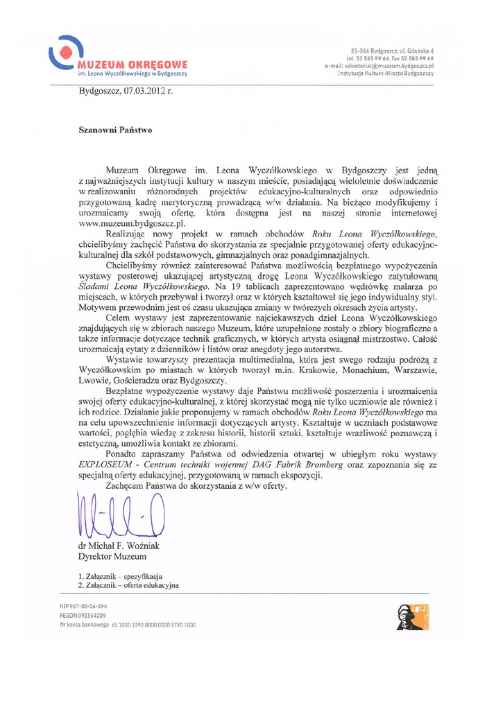 Załącznik nr 1 – Specyfikacja Wystawa posterowa „Śladami Leona Wyczółkowskiego” foto. Wojciech Woźniak 1. Wystawa posterowa składa się z 19 plansz o wymiarach 100 cm x 120 cm. 2. Stelaż: konstrukcja ścianek wykonana z profili aluminiowych anodowanych (kolor srebrny mat) - profil okrągły wypełnienie ścianek - płyta PVC 4mm podstawy stabilizujące - kręgi ścianki można ustawiać w linii prostej lub łączyć je pod kątem 90° można je łączyć w moduły wysokość stelażu 200 cm 3. Wypożyczenie wystawy jest bezpłatne. 4. Transport - we własnym zakresie (istnieje możliwość transportu przez Muzeum – koszt indywidualny, uzależniony od km) 5. Montaż, demontaż - Muzeum Okręgowe 6. Płyta cd lub dvd z prezentacją multimedialną Szczegółowe informacje uzyskacie Państwo pod numerem telefonu tel. 52 58 59 913 Monika Leśniak-Skocka asystent [email protected] Załącznik 2 – Oferta edukacyjna dla szkół 1. Rok Leona Wyczółkowskiego W związku z trwającym Rokiem Leona Wyczółkowskiego Muzeum Okręgowe przygotowało specjalny program edukacyjny dla przedszkoli i szkół. Oferta obejmuje różne zagadnienia i tematy związane z postacią Leona Wyczółkowskiego oraz epoką w której żył i tworzył ten niezwykły artysta. W marcu, obok stałych propozycji lekcji poświęconych wybitnemu polskiemu malarzowi i grafikowi, zapraszamy Państwa na zajęcia na temat impresjonizmu – nurtu w sztuce, który odegrał istotna rolę w kształtowaniu się stylu malarskiego Leona Wyczółkowskiego. W ramach wspomnianej ofert zapraszamy Państwa na następujące tematy lekcyjne: Dla przedszkoli oraz szkół podstawowych (klasy I – III) Z wizytą u Leona Dla szkół podstawowych (klasy IV – VI) W pracowni mistrza Dla gimnazjów oraz szkół ponadgimnazjalnych Malowane światłem – rewolucja impresjonizmu Leon Wyczółkowski – malarstwo, rysunek i grafika Istnieje również możliwość zwiedzenia wraz z przewodnikiem ekspozycji „Twórczość Leona Wyczółkowskiego”. W kolejnych miesiącach zaprosimy Państwa na nowe tematy lekcji muzealnych ukazujące sylwetkę Leona Wyczółkowskiego w kontekście przemian w polskiej i europejskiej sztuki. 2. Wystawa stała: Od Starego Rynku do placu Wolności. Spacer ulicami międzywojennej Bydgoszczy Zapraszamy również na nową ofertę edukacyjna przygotowaną w ramach ekspozycji historycznej: Dla szkół podstawowych (klasy IV – VI) Z szafy naszych babć i prababć. Moda bydgoska lat 20-tych i 30-tych XX w. Od Starego Rynku do placu Wolności. Spacer ulicami międzywojennej Bydgoszczy Miasto nad Brdą. Handel i transport wodny w Bydgoszczy Dla gimnazjów oraz szkół ponadgimnazjalnych Od Starego Rynku do placu Wolności. Spacer ulicami międzywojennej Bydgoszczy Międzywojenna Bydgoszcz miastem wielu kultur Więcej informacji na temat lekcji na stronie internetowej Muzeum: www.muzeum.bydgoszcz.pl Zajęcia muzealne można zamówić osobiście lub telefonicznie z dwutygodniowym wyprzedzeniem w Dziale Edukacji i Promocji przy ul. Mennica 4 w Bydgoszczy, od poniedziałku do piątku w godzinach od 8.00-16.00, tel. 052 58 59 910 lub 911 lub 914. Prosimy o precyzyjne podawanie: tematu lekcji, terminu zajęć, informacji o liczebności grupy (nie powinna przekraczać 25 osób), rodzaju szkoły, nazwiska nauczyciela lub opiekuna, z którym przybędzie grupa, telefonu kontaktowego. Opłata za lekcję obejmuje: 20 zł + bilet wstępu od każdego uczestnika. Opiekunowie wchodzą bezpłatnie, ale mają obowiązek pozostawać z grupą przez cały czas pobytu w Muzeum i biorą odpowiedzialność za dyscyplinę uczniów podczas zajęć. 3. Wystawa stała: Exploseum - Centrum techniki wojennej DAG Fabrik Bromberg To kompleks siedmiu budynków pofabrycznych, połączonych siecią wąskich tuneli i korytarzy usytuowanych w Puszczy Bydgoskiej. Już same budynki i ich surowe wnętrza snują mroczną opowieść o niewolniczej pracy przymusowej ok. 40 tys. robotników, jeńców wojennych oraz więźniów. Nowoczesne środki przekazu, oparte o ikonografię, multimedia i rozwiązania interaktywne, tworzą opowieść o fabryce DAG Bromberg, produkcji niebezpiecznej nitrogliceryny, konspiracji oraz sabotażu. Zgromadzone materiały z bogatych zbiorów i archiwów własnych i obcych, jak również wstrząsające wspomnienia byłych pracowników wykorzystane w multimediach, posłużyły jako punkt wyjścia do stworzenia szczegółowego scenariusza oraz koncepcji wizualnej ekspozycji. Nowoczesne środki przekazu, oparte o ikonografię, multimedia i rozwiązania interaktywne, tworzą opowieść o fabryce DAG Bromberg, produkcji nitrogliceryny, konspiracji oraz sabotażu. Uczniowie (od 10 roku życia) szkół podstawowych, gimnazjalnych i ponadgimnazjalnych mogą skorzystać z promocyjnej ceny biletu – 8 zł od osoby. Grupa z własnym transportem, powinna liczyć od 20 do 25 osób. Zwiedzanie z przewodnikiem odbywa się od środy do piątku w godzinach od 9.00 do 17.00. Przed wizytą należy zarezerwować miejsce pod numerem telefonu 883 366 056. Opłatę za oprowadzanie wnosi się w kasie mieszczącej się w budynku Exploseum. Szczegóły na stronie www.exploseum.pl. W ramach ekspozycji zostały przygotowane następujące tematy lekcji muzealnych: Dla szkół podstawowych (klasy IV – VI), gimnazjów oraz szkół ponadgimnazjalnych: Alfred Nobel i jego dziedzictwo Rycerz i muszkieter, czyli czym dawniej walczono? Walka konspiracyjna na Pomorzu i Kujawach podczas II wojny światowej Dla gimnazjów oraz szkół ponadgimnazjalnych: Praca przymusowa podczas II wojny światowej Wyzwolenie czy zniewolenie, czyli Armia Czerwona w Polsce Opłata za lekcję obejmuje: 20 zł + bilet wstępu od każdego uczestnika. Opiekunowie wchodzą bezpłatnie, ale mają obowiązek pozostawać z grupą przez cały czas pobytu w Muzeum i biorą odpowiedzialność za dyscyplinę uczniów podczas zajęć. ZAPRASZAMY DO MUZEUM
