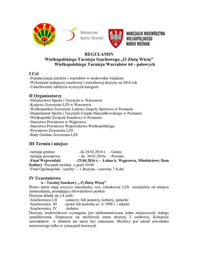REGULAMIN Wielkopolskiego Turnieju Szachowego „O Złotą Wieżę” Wielkopolskiego Turnieju Warcabów 64 - polowych I Cel -Popularyzacja szachów i warcabów w środowisku wiejskim -Wyłonienie najlepszej szachowej i warcabowej drużyny na 2016 rok -Umożliwienie zdobycia wyższych kategorii II Organizatorzy -Ministerstwo Sportu i Turystyki w Warszawie -Krajowe Zrzeszenie LZS w Warszawie -Wielkopolskie Zrzeszenie Ludowe Zespoły Sportowe w Poznaniu -Departament Sportu i Turystyki Urzędu Marszałkowskiego w Poznaniu -Wielkopolski Związek Szachowy w Poznaniu -Starostwo Powiatowe w Wągrowcu -Starostwa Powiatowe Województwa Wielkopolskiego -Powiatowe Zrzeszenia LZS -Rady Gminne Zrzeszenia LZS III Termin i miejsce -turnieje gminne - do 28.02.2016 r. - Gminy -turnieje powiatowe - do. 30.03.2016r. – Powiaty -Finał Wojewódzki -23.04.2016 r. – Łekno k. Wągrowca, Młodzieżowy Dom Kultury. Początek turnieju o godz.10:00 -Finał Ogólnopolski /szachy/ - 1 drużyna - czerwiec 7-8 dni IV Uczestnictwo A - Turniej Szachowy „ O Złotą Wieżę” Prawo startu mają wszyscy mieszkańcy wsi, członkowie LZS niezależnie od miejsca zamieszkania, posiadający obywatelstwo polskie Drużyna składa się z 4 osób: -Szachownica I-II -seniorzy /lub juniorzy, kobiety, juniorki/ -Szachownica III -junior lub juniorka ur. w 1998 r. i młodsi -Szachownica IV -kobieta Drużyny środowiskowe wymagana jest udokumentowana jedna miejscowość stałego zameldowania. Dopuszcza się możliwość startu drużyny 3 osobowej. Kolejność zawodników w składzie nie może być zmieniana. Możliwy jest udział zawodnika rezerwowego tylko w sytuacjach losowych. B – Turniej Warcabów 64 - polowych Prawo startu mają wszyscy mieszkańcy wsi, członkowie LZS /niezależnie od miejsca zamieszkania/. Drużyna składa się z 4 osób: -Plansza I-III -mężczyźni /brak kategorii wiekowej/ -Plansza IV -kobieta /brak kategorii wiekowej/ W turnieju każdego mężczyznę może zastąpić kobieta. Drużyny środowiskowe wymagana jest udokumentowana jedna miejscowość stałego zameldowania. Dopuszcza się możliwość startu drużyny 3 osobowej. V Sposób przeprowadzenia Na wszystkich szczeblach rozgrywek drużyny grają systemem „każdy z każdym”, a w przypadku dużej ilości startujących drużyn systemem „szwajcarskim” z uwzględnieniem czasu gry. Gminę reprezentuje jedna drużyna na zawodach powiatowych. Powiat reprezentuje jedna drużyna na Finale Wojewódzkim. VI Nagrody Sześć najlepszych drużyn otrzymuje pamiątkowe puchary. VII Zasady finansowania Koszty organizacyjne i nagród na zawodach wojewódzkich pokrywają organizatorzy. Koszty przejazdów i organizacji imprez gminnych i powiatowych pokrywają zainteresowane gminy i powiaty. VIII Zgłoszenia Zgłoszenia drużyn reprezentujących powiaty na zawodach wojewódzkich przyjmowane są w WZ LZS w Poznaniu ul. Os. Tysiąclecia 4 61-255 Poznań tel.61 8760-020 mail:[email protected] w nieprzekraczalnym terminie do 18.04.2016 roku. IX Uwagi końcowe Najlepsza drużyna Finału Wojewódzkiego reprezentuje Województwo Wielkopolskie na turnieju centralnym „Złotej Wieży” w czerwcu 2016 roku. Wszelkie sprawy sporne i nie ujęte w niniejszym regulaminie rozstrzygają organizatorzy. Wszyscy uczestnicy rozgrywek obowiązani są posiadać aktualne badania lekarskie. Uczestnicy imprezy, członkowie LZS objęci są ubezpieczeniem zbiorowym zawartym przez Wielkopolskie Zrzeszenie LZS w Poznaniu. Za aktualne badania lekarskie odpowiedzialni są kierownicy ekip. Każda drużyna zabiera ze sobą dwa komplety szachów + zegary i dwa komplety