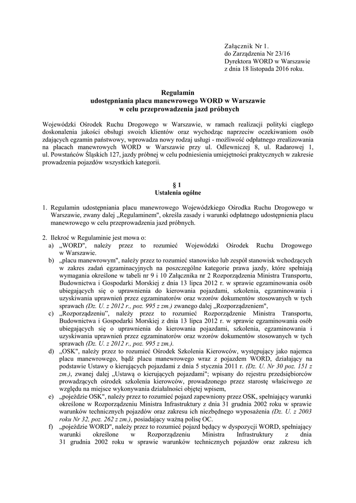 Załącznik Nr 1. do Zarządzenia Nr 23/16 Dyrektora WORD w Warszawie z dnia 18 listopada 2016 roku. Regulamin udostępniania placu manewrowego WORD w Warszawie w celu przeprowadzenia jazd próbnych Wojewódzki Ośrodek Ruchu Drogowego w Warszawie, w ramach realizacji polityki ciągłego doskonalenia jakości obsługi swoich klientów oraz wychodząc naprzeciw oczekiwaniom osób zdających egzamin państwowy, wprowadza nowy rodzaj usługi - możliwość odpłatnego zrealizowania na placach manewrowych WORD w Warszawie przy ul. Odlewniczej 8, ul. Radarowej 1, ul. Powstańców Śląskich 127, jazdy próbnej w celu podniesienia umiejętności praktycznych w zakresie prowadzenia pojazdów wszystkich kategorii. §1 Ustalenia ogólne 1. Regulamin udostępniania placu manewrowego Wojewódzkiego Ośrodka Ruchu Drogowego w Warszawie, zwany dalej „Regulaminem", określa zasady i warunki odpłatnego udostępnienia placu manewrowego w celu przeprowadzenia jazd próbnych. 2. Ilekroć w Regulaminie jest mowa o: a) „WORD", należy przez to rozumieć Wojewódzki Ośrodek Ruchu Drogowego w Warszawie. b) „placu manewrowym", należy przez to rozumieć stanowisko lub zespół stanowisk wchodzących w zakres zadań egzaminacyjnych na poszczególne kategorie prawa jazdy, które spełniają wymagania określone w tabeli nr 9 i 10 Załącznika nr 2 Rozporządzenia Ministra Transportu, Budownictwa i Gospodarki Morskiej z dnia 13 lipca 2012 r. w sprawie egzaminowania osób ubiegających się o uprawnienia do kierowania pojazdami, szkolenia, egzaminowania i uzyskiwania uprawnień przez egzaminatorów oraz wzorów dokumentów stosowanych w tych sprawach (Dz. U. z 2012 r., poz. 995 z zm.) zwanego dalej „Rozporządzeniem", c) „Rozporządzeniu”, należy przez to rozumieć Rozporządzenie Ministra Transportu, Budownictwa i Gospodarki Morskiej z dnia 13 lipca 2012 r. w sprawie egzaminowania osób ubiegających się o uprawnienia do kierowania pojazdami, szkolenia, egzaminowania i uzyskiwania uprawnień przez egzaminatorów oraz wzorów dokumentów stosowanych w tych sprawach (Dz. U. z 2012 r., poz. 995 z zm.). d) „OSK", należy przez to rozumieć Ośrodek Szkolenia Kierowców, występujący jako najemca placu manewrowego, bądź placu manewrowego wraz z pojazdem WORD, działający na podstawie Ustawy o kierujących pojazdami z dnia 5 stycznia 2011 r. (Dz. U. Nr 30 poz. 151 z zm.), zwanej dalej „Ustawą o kierujących pojazdami"; wpisany do rejestru przedsiębiorców prowadzących ośrodek szkolenia kierowców, prowadzonego przez starostę właściwego ze względu na miejsce wykonywania działalności objętej wpisem, e) „pojeździe OSK", należy przez to rozumieć pojazd zapewniony przez OSK, spełniający warunki określone w Rozporządzeniu Ministra Infrastruktury z dnia 31 grudnia 2002 roku w sprawie warunków technicznych pojazdów oraz zakresu ich niezbędnego wyposażenia (Dz. U. z 2003 roku Nr 32, poz. 262 z zm.), posiadający ważną polisę OC. f) „pojeździe WORD", należy przez to rozumieć pojazd będący w dyspozycji WORD, spełniający warunki określone w Rozporządzeniu Ministra Infrastruktury z dnia 31 grudnia 2002 roku w sprawie warunków technicznych pojazdów oraz zakresu ich niezbędnego wyposażenia (Dz. U. z 2003 roku Nr 32, poz. 262 z zm.), posiadający ważną polisę OC. g) „jeździe próbnej" lub „usłudze”, należy przez to rozumieć prowadzenie pojazdu przez osobę określoną w art. 49 ust. 1 - 4 Ustawy o kierujących pojazdami, mającą na celu podniesienie umiejętności praktycznych w zakresie prowadzenia pojazdów, przeprowadzaną przez i pod nadzorem instruktora OSK, h) „Instruktorze", należy przez to rozumieć osobę, która reprezentuje OSK i sprawuje nadzór nad osobą korzystającą z placu manewrowego, posiadającą uprawnienia instruktora nauki jazdy w zakresie kategorii prawa jazdy, w ramach której przeprowadzana jest jazda próbna, wpisaną do ewidencji instruktorów prowadzonej przez starostę właściwego ze względu na miejsce jej zamieszkania, i) „Osobie realizującej jazdę próbną", należy przez to rozumieć osoby określone w art. 49 ust. 1 - 4 Ustawy o kierujących pojazdami, które realizują jazdę próbną przeprowadzaną przez i pod nadzorem instruktora OSK. j) „ME”, należy przez to rozumieć Miejsca Egzaminowania WORD przy ul. Odlewniczej 8 lub ul. Radarowej 1 lub ul. Powstańców Śląskich 127. 3. WORD może odpłatnie udostępniać plac manewrowy, w celu przeprowadzania jazd próbnych pojazdem OSK, w zakresie wykonania zadań przewidzianych dla poszczególnych kategorii prawa jazdy wynikających z Rozporządzenia. 4. WORD może odpłatnie udostępniać plac manewrowy wraz z pojazdem WORD do przeprowadzania jazd próbnych, w celu wykonania zadań przewidzianych dla poszczególnych kategorii prawa jazdy wynikających z Rozporządzenia. 5. Instruktorzy, deklarujący chęć odpłatnego korzystania z usług, o których mowa w ust. 3 lub ust. 4, zobowiązani są do przestrzegania postanowień niniejszego Regulaminu, co potwierdzone zostaje w Karcie zgłoszenia, stanowiącej załącznik nr 2 do Regulaminu 6. Plac manewrowy WORD udostępniany jest odpłatnie z wyłączeniem stanowiska na którym realizuje się zadanie egzaminacyjne pn. „ruszanie z miejsca do przodu na wzniesieniu", zwane dalej „Wzniesieniem", które udostępniane jest bezpłatnie. Cennik opłat za udostępnianie placu manewrowego stanowi załącznik nr 1 do Regulaminu. 7. Usługa, o której mowa w ust.3 lub ust. 4 może zostać udostępniona, z zachowaniem postanowień § 5 pkt 2 Rozporządzenia. 8. O datach i godzinach udostępnienia placu manewrowego w Miejscu Egzaminowania każdorazowo decyduje Kierownik Wydziału Szkoleń i Bezpieczeństwa WORD. 9. Udostępnienie placu manewrowego może zostać zawieszone przez osobę określoną w ust. 8, w dowolnym czasie, o czym informuje się na oficjalnej stronie WORD www.word.waw.pl. 10. Udostępnienie placu manewrowe