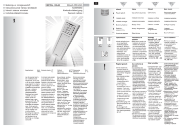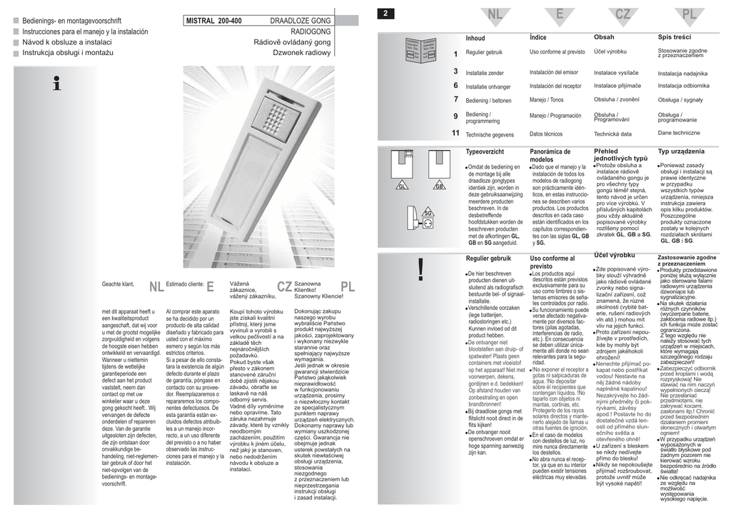 MISTRAL 200-400 DRAADLOZE GONG RADIOGONG Installation Operatio n Tech. Da t. Rádiovì ovládaný gong Dzwonek radiowy Návod k obsluze a instalaci Instrukcja obs³ugi i monta¿u Xxx Xxx xxX xxX GL GB SG NL met dit apparaat heeft u een kwaliteitsproduct aangeschaft, dat wij voor u met de grootst mogelijke zorgvuldigheid en volgens de hoogste eisen hebben ontwikkeld en vervaardigd. Wanneer u niettemin tijdens de wettelijke garantieperiode een defect aan het product vaststelt, neem dan contact op met uw winkelier waar u deze gong gekocht heeft.. Wij vervangen de defecte onderdelen of repareren deze. Van de garantie uitgesloten zijn defecten, die zijn ontstaan door onvakkundige behandeling, niet-reglementair gebruik of door het niet-opvolgen van de bedienings- en montagevoorschrift. Estimado cliente: E Al comprar este aparato se ha decidido por un producto de alta calidad diseñado y fabricado para usted con el máximo esmero y según los más estrictos criterios. Si a pesar de ello constatara la existencia de algún defecto durante el plazo de garantía, póngase en contacto con su proveedor. Reemplazaremos o repararemos los componentes defectuosos. De esta garantía están excluidos defectos atribuibles a un manejo incorrecto, a un uso diferente del previsto o a no haber observado las instrucciones para el manejo y la instalación. Váená zákaznice, váený zákazníku, CZ Koupí tohoto výrobku jste získali kvalitní pøístroj, který jsme vyvinuli a vyrobili s velkou peèlivostí a na základì tìch nejnároènìjších poadavkù. Pokud byste však pøesto v zákonem stanovené záruèní dobì zjistili nìjakou závadu, obrate se laskavì na náš odborný servis. Vadné díly vymìníme nebo opravíme. Tato záruka nezahrnuje závady, které by vznikly neodborným zacházením, pouitím výrobku k jiném úèelu, ne jaký je stanoven, nebo nedodrením návodu k obsluze a instalaci. Szanowna Klientko! Szanowny Kliencie! PL Dokonuj¹c zakupu naszego wyrobu wybraliœcie Pañstwo produkt najwy¿szej jakoœci, zaprojektowany i wykonany niezwykle starannie oraz spe³niaj¹cy najwy¿sze wymagania. Jeœli jednak w okresie gwarancji stwierdzicie Pañstwo jak¹kolwiek nieprawid³owoœæ w funkcjonowaniu urz¹dzenia, prosimy o niezw³oczny kontakt ze specjalistycznym punktem naprawy urz¹dzeñ elektrycznych. Dokonamy naprawy lub wymiany uszkodzonej czêœci. Gwarancja nie obejmuje jednak usterek powsta³ych na skutek niew³aœciwej obs³ugi urz¹dzenia, stosowania niezgodnego z przeznaczeniem lub nieprzestrzegania instrukcji obs³ugi i zasad instalacji. ! CZ PL Inhoud Índice Obsah Spis treœci 1 Regulier gebruik Uso conforme al previsto Úèel výrobku Stosowanie zgodne z przeznaczeniem 3 Installatie zender Instalación del emisor Instalace vysílaèe Instalacja nadajnika 6 Installatie ontvanger Instalación del receptor Instalace pøijímaèe Instalacja odbiornika 7 Bediening / beltonen Manejo / Tonos Obsluha / zvonìní Obs³uga / sygna³y 9 Bediening / programmering Manejo / Programación Obsluha / Programování Obs³uga / programowanie Technische gegevens Datos técnicos Technická data Dane techniczne Typeoverzicht Pøehled jednotlivých typù Typ urz¹dzenia ! Omdat de bediening en de montage bij alle draadloze gongtypes identiek zijn, worden in deze gebruiksaanwijzing meerdere producten beschreven. In de desbetreffende hoofdstukken worden de beschreven producten met de afkortingen GL, GB en SG aangeduid. Panorámica de modelos ! Poniewa¿ zasady !Dado que el manejo y la ! Protoe obsluha a obs³ugi i instalacji s¹ instalace rádiovì instalación de todos los prawie identyczne ovládaného gongu je modelos de radiogong w przypadku pro všechny typy son prácticamente idénwszystkich typów gongù témìø stejná, ticos, en estas instruccio- tento návod je urèen urz¹dzenia, niniejsza nes se describen varios instrukcja zawiera pro více výrobkù. V productos. Los productos pøíslušných kapitolách opis kilku produktów. descritos en cada caso Poszczególne jsou vdy aktuálnì produkty oznaczone están identificados en los popisované výrobky zosta³y w kolejnych rozlišeny pomocí capítulos correspondientes con las siglas GL, GB zkratek GL, GB a SG. rozdzia³ach skrótami GL, GB i SG. y SG. Regulier gebruik Uso conforme al previsto Úèel výrobku Installation n Operatio t. Tech. Da 11 Geachte klant, E NL 2 Bedienings- en montagevoorschrift Instrucciones para el manejo y la instalación ! De hier beschreven producten dienen uitsluitend als radiografisch bestuurde bel- of signaalinstallatie. ! Verschillende oorzaken (lege batterijen, radiostoringen etc.) Kunnen invloed od dit product hebben. !De ontvanger niet blootstellen aan druip- of spatwater! Plaats geen containers met vloeistof op het apparaat! Niet met voorwerpen, dekens, gordijnen e.d. bedekken! Op afstand houden van zonbestraling en open brandbronnen! ! Bij draadlose gongs met flitslicht nooit direct in de flits kijken! ! De ontvanger nooit openschroeven omdat er hoge spanning aanwezig zijn kan. ! Los productos aquí descritos están previstos exclusivamente para su uso como timbres o sistemas emisores de señales controlados por radio. ! Su funcionamiento puede verse afectado negativamente por diversos factores (pilas agotadas, interferencias de radio, etc.). En consecuencia se deben utilizar únicamente allí donde no sean relevantes para la seguridad. !!No exponer el receptor a gotas ni salpicaduras de agua. !No depositar sobre él recipientes que contengan líquidos. !No taparlo con objetos ni mantas, cortinas, etc. Protegerlo de los rayos solares directos y mantenerlo alejado de llamas u otras fuentes de ignición. ! En el caso de modelos con destellos de luz, no mire nunca directamente los destellos. ! No abra nunca el receptor, ya que en su interior pueden existir tensiones eléctricas muy elevadas. Zastosowanie zgodne z przeznaczeniem ! Zde popisované výro- ! Produkty przedstawione bky slouí výhradnì po
