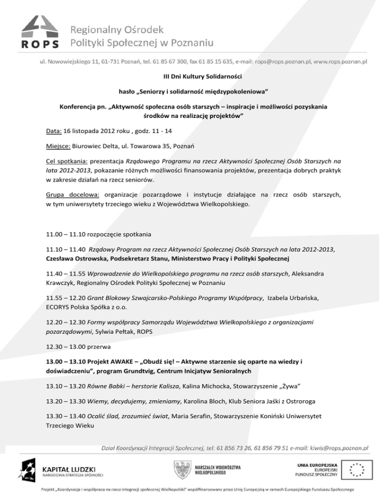 III Dni Kultury Solidarności hasło „Seniorzy i solidarność międzypokoleniowa” Konferencja pn. „Aktywność społeczna osób starszych – inspiracje i możliwości pozyskania środków na realizację projektów” Data: 16 listopada 2012 roku , godz. 11 - 14 Miejsce: Biurowiec Delta, ul. Towarowa 35, Poznań Cel spotkania: prezentacja Rządowego Programu na rzecz Aktywności Społecznej Osób Starszych na lata 2012-2013, pokazanie różnych możliwości finansowania projektów, prezentacja dobrych praktyk w zakresie działań na rzecz seniorów. Grupa docelowa: organizacje pozarządowe i instytucje działające na rzecz osób starszych, w tym uniwersytety trzeciego wieku z Województwa Wielkopolskiego. 11.00 – 11.10 rozpoczęcie spotkania 11.10 – 11.40 Rządowy Program na rzecz Aktywności Społecznej Osób Starszych na lata 2012-2013, Czesława Ostrowska, Podsekretarz Stanu, Ministerstwo Pracy i Polityki Społecznej 11.40 – 11.55 Wprowadzenie do Wielkopolskiego programu na rzecz osób starszych, Aleksandra Krawczyk, Regionalny Ośrodek Polityki Społecznej w Poznaniu 11.55 – 12.20 Grant Blokowy Szwajcarsko-Polskiego Programy Współpracy, Izabela Urbańska, ECORYS Polska Spółka z o.o. 12.20 – 12.30 Formy współpracy Samorządu Województwa Wielkopolskiego z organizacjami pozarządowymi, Sylwia Pełtak, ROPS 12.30 – 13.00 przerwa 13.00 – 13.10 Projekt AWAKE – „Obudź się! – Aktywne starzenie się oparte na wiedzy i doświadczeniu”, program Grundtvig, Centrum Inicjatyw Senioralnych 13.10 – 13.20 Równe Babki – herstorie Kalisza, Kalina Michocka, Stowarzyszenie „Żywa” 13.20 – 13.30 Wiemy, decydujemy, zmieniamy, Karolina Bloch, Klub Seniora Jaśki z Ostroroga 13.30 – 13.40 Ocalić ślad, zrozumieć świat, Maria Serafin, Stowarzyszenie Koniński Uniwersytet Trzeciego Wieku 13.40 – 14.00 Dyskusja i podsumowanie konferencji