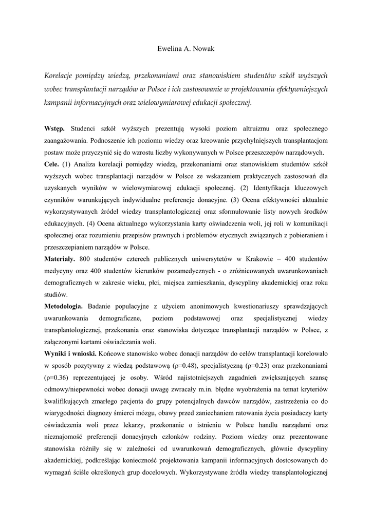 Ewelina A. Nowak Korelacje pomiędzy wiedzą, przekonaniami oraz stanowiskiem studentów szkół wyższych wobec transplantacji narządów w Polsce i ich zastosowanie w projektowaniu efektywniejszych kampanii informacyjnych oraz wielowymiarowej edukacji społecznej. Wstęp. Studenci szkół wyższych prezentują wysoki poziom altruizmu oraz społecznego zaangażowania. Podnoszenie ich poziomu wiedzy oraz kreowanie przychylniejszych transplantacjom postaw może przyczynić się do wzrostu liczby wykonywanych w Polsce przeszczepów narządowych. Cele. (1) Analiza korelacji pomiędzy wiedzą, przekonaniami oraz stanowiskiem studentów szkół wyższych wobec transplantacji narządów w Polsce ze wskazaniem praktycznych zastosowań dla uzyskanych wyników w wielowymiarowej edukacji społecznej. (2) Identyfikacja kluczowych czynników warunkujących indywidualne preferencje donacyjne. (3) Ocena efektywności aktualnie wykorzystywanych źródeł wiedzy transplantologicznej oraz sformułowanie listy nowych środków edukacyjnych. (4) Ocena aktualnego wykorzystania karty oświadczenia woli, jej roli w komunikacji społecznej oraz rozumieniu przepisów prawnych i problemów etycznych związanych z pobieraniem i przeszczepianiem narządów w Polsce. Materiały. 800 studentów czterech publicznych uniwersytetów w Krakowie – 400 studentów medycyny oraz 400 studentów kierunków pozamedycznych - o zróżnicowanych uwarunkowaniach demograficznych w zakresie wieku, płci, miejsca zamieszkania, dyscypliny akademickiej oraz roku studiów. Metodologia. Badanie populacyjne z użyciem anonimowych kwestionariuszy sprawdzających uwarunkowania demograficzne, poziom podstawowej oraz specjalistycznej wiedzy transplantologicznej, przekonania oraz stanowiska dotyczące transplantacji narządów w Polsce, z załączonymi kartami oświadczania woli. Wyniki i wnioski. Końcowe stanowisko wobec donacji narządów do celów transplantacji korelowało w sposób pozytywny z wiedzą podstawową (ρ=0.48), specjalistyczną (ρ=0.23) oraz przekonaniami (ρ=0.36) reprezentującej je osoby. Wśród najistotniejszych zagadnień zwiększających szansę odmowy/niepewności wobec donacji uwagę zwracały m.in. błędne wyobrażenia na temat kryteriów kwalifikujących zmarłego pacjenta do grupy potencjalnych dawców narządów, zastrzeżenia co do wiarygodności diagnozy śmierci mózgu, obawy przed zaniechaniem ratowania życia posiadaczy karty oświadczenia woli przez lekarzy, przekonanie o istnieniu w Polsce handlu narządami oraz nieznajomość preferencji donacyjnych członków rodziny. Poziom wiedzy oraz prezentowane stanowiska różniły się w zależności od uwarunkowań demograficznych, głównie dyscypliny akademickiej, podkreślając konieczność projektowania kampanii informacyjnych dostosowanych do wymagań ściśle określonych grup docelowych. Wykorzystywane źródła wiedzy transplantologicznej powiązano z indywidualnymi preferencjami donacyjnymi oceniwszy aktualną edukację przedakademicką jako nieadekwatną, w przeciwieństwie do edukacji zapewnianej przez media oraz przez pracowników służby zdrowia. Pomimo dominującego pozytywnego stanowiska wobec idei transplantacji w badanej grupie respondentów, poziom wiedzy studentów kierunków pozamedycznych pozostaje relatywnie niski, wskazując na potrzebę dodatkowej edukacji w tej grupie, zwłaszcza w zakresie tematyki, której znajomość oceniono jako szczególnie niezadowalającą: istnienia w Polsce zgody domniemanej, roli śmierci mózgu jako diagnozy niezbędnej do kwalifikacji zmarłego do grupy dawców narządów, braku szkodliwości zdrowotnej żywych donacji, aktualnego zapotrzebowania na przeszczepy narządowe oraz zasad ich przyznawania oczekującym biorcom, a także realnego stanowiska wobec idei transplantacji autorytetów religijnych. Studenci medycyny prezentowali istotnie wyższy poziom wiedzy oraz przychylniejsze transplantacjom stanowiska niż studenci kierunków pozamedycznych, potwierdzając przewagę sformalizowanych programów edukacyjnych nad łatwiej dostępnymi, aczkolwiek mniej wiarygodnymi źródłami wiedzy. Wypieranie nierzetelnych informacji ze środków masowego przekazu, promowanie pozytywnych aspektów transplantacji, aktywizacja polskich duchownych oraz wprowadzenie transplantologii do szkół powinny przyczynić się do istotnego wzrostu poziomu wiedzy młodego społeczeństwa oraz zaowocować jego jeszcze przychylniejszym transplantacjom stanowiskiem, kreując sprzyjające warunki do zastąpienia zgody domniemanej zgodą świadomą. 41.4% studentów posiada kartę oświadczenia woli, a zdecydowana większość osób nieposiadających karty jest zainteresowana jej podpisaniem. Główne przyczyny braku karty nie wynikają z negatywnego stanowiska wobec transplantacji i mają charakter modyfikowalny. 83% posiadaczy karty zdaje sobie sprawę z jej wartości etycznej, nie zaś mocy prawnej, a trzech na czterech poinformowało o jej podpisaniu swoją rodzinę, potwierdzając skuteczność karty oświadczenia woli w komunikowaniu indywidualnych preferencji donacyjnych. Rzeczywisty posiadacz karty, w porównaniu do posiadacza potencjalnego, prezentował istotnie wyższy poziom wiedzy transplantologicznej oraz bardziej zdecydowane stanowisko poparcia dla idei transplantacji. Poparcie dla zgody świadomej było szczególnie zaznaczone wśród studentów reprezentujących najwyższy poziom świadomości transplantologicznej – z dobrym bądź bardzo dobrym poziomem wiedzy, zdecydowanie pozytywnym stanowiskiem, posiadających kartę oświadczenia woli oraz użytkujących ją prawidłowo – nadając tejże decyzji status w pełni świadomego i przemyślanego wyboru. ***