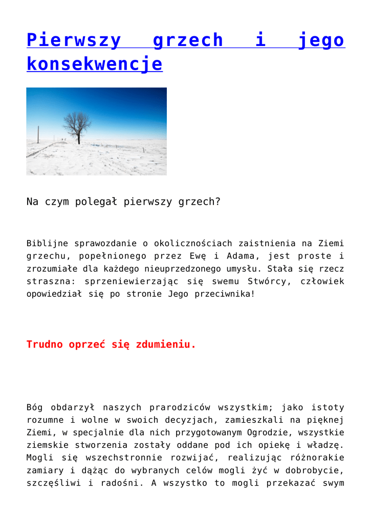 Pierwszy grzech konsekwencje i jego Na czym polegał pierwszy grzech? Biblijne sprawozdanie o okolicznościach zaistnienia na Ziemi grzechu, popełnionego przez Ewę i Adama, jest proste i zrozumiałe dla każdego nieuprzedzonego umysłu. Stała się rzecz straszna: sprzeniewierzając się swemu Stwórcy, człowiek opowiedział się po stronie Jego przeciwnika! Trudno oprzeć się zdumieniu. Bóg obdarzył naszych prarodziców wszystkim; jako istoty rozumne i wolne w swoich decyzjach, zamieszkali na pięknej Ziemi, w specjalnie dla nich przygotowanym Ogrodzie, wszystkie ziemskie stworzenia zostały oddane pod ich opiekę i władzę. Mogli się wszechstronnie rozwijać, realizując różnorakie zamiary i dążąc do wybranych celów mogli żyć w dobrobycie, szczęśliwi i radośni. A wszystko to mogli przekazać swym dzieciom i kolejnym szczęśliwym pokoleniom szlachetnych ludzi! Mogli… Ale gdy znienacka pojawił się fałszywy przyjaciel, gdy kłamliwie i podstępnie, udając zatroskanego o ich dobro, oskarżył ich Stwórcę i Dobroczyńcę – pozwolili by trucizna jego kłamstwa i podstępu wniknęła do ich umysłów. Trudno to zrozumieć! On im nic nie dał, w żaden sposób się przed nimi nie uwiarygodnił, a sama forma kontaktu, jaką wybrał – używając węża jako medium – sygnalizowała, że coś tu nie jest w porządku. Na dodatek zakwestionował prawdę słów Dobrego Boga, i jawnie zachęcał do złamania Bożego zakazu spożywania owoców z Drzewa Poznania Dobra i Zła. Ale to właśnie jego usłuchała nasza pramatka Ewa, i otumaniona perspektywami, jakie przed nią roztoczył, widząc, „że drzewo to ma owoce dobre do jedzenia, i że były miłe dla oczu i godne pożądania dla zdobycia mądrości”, niepomna na Boże ostrzeżenie, , sięgnęła po zakazany owoc, a potem „dała też mężowi swemu, który był z nią, i on też jadł” (1 Mjż 3,6)! Relacja biblijna o pierwszym grzechu, podobnie zresztą jak inne biblijne sprawozdania z początków naszej ziemskiej historii, jest przyjmowana w różny sposób. Ludzie głęboko wierzący, którzy poznali i doświadczyli prawdy i mocy Słowa Bożego, Biblii, darzą ją pełnym zaufaniem. Inni powątpiewają, a jeszcze inni drwią. Powstało wiele domorosłych historii na ten temat. Jedna z popularniejszych głosi, że pierwszym grzechem było współżycie seksualne pierwszej pary ludzkiej, do którego zachęcił ich szatan. Zupełny bezsens. Bóg stworzył człowieka jako istotę seksualną, nie tylko zdolną ale i powołaną do współżycia i prokreacji. Bogu i Pismu Świętemu od samego początku obca jest jakakolwiek pruderia w tym względzie; współżycie mężczyzny z kobietą w związku małżeńskim było i jest czymś całkowicie naturalnym, czystym i godziwym, dającym radość i potęgującym bliskość poślubionej pary. Sam fakt, że pierwszą uroczystość zaślubin celebrował sam Pan Bóg, nadaje małżeństwu wysoką godność: „I błogosławił im Bóg, i rzekł do nich Bóg: Rozradzajcie się i rozmnażajcie się, i napełniajcie ziemię…” (1 Mjż 1,28)! Powstawanie takich niepoważnych teorii na temat pierwszego grzechu wynika między innymi z niezrozumienia tego, co się wtedy naprawdę stało. Że tak jest świadczy pełne zdziwienia pytanie: „To Bóg ukarał ich za zjedzenie jakiegoś jabłka?”… Pozwólcie, że posłużę się historią, jaką opowiedziała mi jedna z nieżyjących już sióstr, która jako młoda dziewczyna w okresie II wojny światowej została wywieziona na roboty do Niemiec. – „Trafiłam do dobrych Niemców, którzy przyjęli mnie życzliwie. Miałam sprzątać dom i całe obejście oraz pomagać w kuchni. W kilka dni po przyjeździe, kiedy sprzątałam sypialnię, w kącie za nogą łóżka dostrzegłam jakiś papier, okazało się, że był to stumarkowy banknot. Oczywiście oddałam go zaraz moim gospodarzom. I dopiero po dłuższym czasie, kiedy zżyłam się z nimi, dowiedziałam się, że te pieniądze oni mi zwyczajnie „podłożyli”! Chcieli się w ten sposób dowiedzieć, kto znalazł się w ich domu. Cieszę się, że zdałam ten egzamin. A moi gospodarze polubili mnie, i przez cały czas traktowali niemal jak córkę!” Niestety, nasi prarodzice nie zdali testu wierności Bogu! Sprzymierzając się z szatanem, sięgnęli po to, co do nich nie należało, zdradzili Boga i zawiedli Jego zaufanie. Zamiast iść drogą Bożą, zeszli na drogę samowoli i grzechu, na której odtąd mieli ulegać zgubnym skłonnościom, popadając coraz bardziej w niewolę niezdrowych pragnień i rozpasanych zmysłów. Tamten pierwszy grzech ma jeszcze inny, ważny wymiar. Stwórca oddał człowiekowi we władanie całą ziemię: „… napełniajcie ziemię, i czyńcie ją sobie poddaną; panujcie nad rybami morskimi i nad ptactwem niebios, i nad wszelkimi zwierzętami, które się poruszają po ziemi” (1 Mjż 1,28). Zastrzegł jednak, że jedno z drzew Ogrodu zostało wyjęte spod tej władzy, że po owoc tego drzewa człowiekowi nie wolno sięgnąć. Było więc to drzewo znakiem Bożego panowania i poddaństwa człowieka względem Stwórcy, znakiem zależności od Niego. W tym kontekście zerwanie i spożycie zakazanego owocu, równało się odrzuceniu Bożego panowania, było wypowiedzeniem przez człowieka stosunku poddaństwa – wyrazem zuchwałego buntu wobec Stwórcy! Popełniony w Edenie grzech, tragicznie zmienił wszystko! W następstwie upadku naszych prarodziców przekleństwo spadło na ziemię, na nich samych, i na cały rodzaj ludzki – na wszystkie pokolenia ich potomków. Wygnani z Ogrodu, skazani na ciężką pracę, w pocie i mozole, w bólu i zgryzocie mieli odtąd pracować na ziemi rodzącej ciernie i osty, która w końcu miała się stać ich grobem (1 Mjż 3,7-24)! Ważne pytanie: Kto zawinił? Fakt, że człowiek zgrzeszył, mógł dowodzić jednej z dwóch ewentualności: 1. Człowiek został stworzony zbyt słabym, i musi