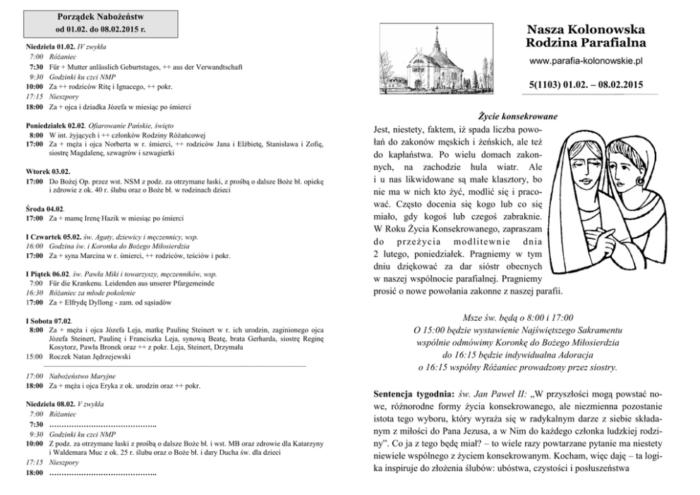 Porządek Nabożeństw od 01.02. do 08.02.2015 r. Niedziela 01.02. IV zwykła 7:00 Różaniec 7:30 Für + Mutter anlässlich Geburtstages, ++ aus der Verwandtschaft 9:30 Godzinki ku czci NMP 10:00 Za ++ rodziców Ritę i Ignacego, ++ pokr. 17:15 Nieszpory 18:00 Za + ojca i dziadka Józefa w miesiąc po śmierci Poniedziałek 02.02. Ofiarowanie Pańskie, święto 8:00 W int. żyjących i ++ członków Rodziny Różańcowej 17:00 Za + męża i ojca Norberta w r. śmierci, ++ rodziców Jana i Elżbietę, Stanisława i Zofię, siostrę Magdalenę, szwagrów i szwagierki Wtorek 03.02. 17:00 Do Bożej Op. przez wst. NSM z podz. za otrzymane łaski, z prośbą o dalsze Boże bł. opiekę i zdrowie z ok. 40 r. ślubu oraz o Boże bł. w rodzinach dzieci Środa 04.02. 17:00 Za + mamę Irenę Hazik w miesiąc po śmierci I Czwartek 05.02. św. Agaty, dziewicy i męczennicy, wsp. 16:00 Godzina św. i Koronka do Bożego Miłosierdzia 17:00 Za + syna Marcina w r. śmierci, ++ rodziców, teściów i pokr. I Piątek 06.02. św. Pawła Miki i towarzyszy, męczenników, wsp. 7:00 Für die Krankenu. Leidenden aus unserer Pfargemeinde 16:30 Różaniec za młode pokolenie 17:00 Za + Elfrydę Dyllong - zam. od sąsiadów I Sobota 07.02. 8:00 Za + męża i ojca Józefa Leja, matkę Paulinę Steinert w r. ich urodzin, zaginionego ojca Józefa Steinert, Paulinę i Franciszka Leja, synową Beatę, brata Gerharda, siostrę Reginę Kosytorz, Pawła Bronek oraz ++ z pokr. Leja, Steinert, Drzymała 15:00 Roczek Natan Jędrzejewski ————————–—–——————————————–——————————— 17:00 Nabożeństwo Maryjne 18:00 Za + męża i ojca Eryka z ok. urodzin oraz ++ pokr. Niedziela 08.02. V zwykła 7:00 Różaniec 7:30 …………………………………….. 9:30 Godzinki ku czci NMP 10:00 Z podz. za otrzymane łaski z prośbą o dalsze Boże bł. i wst. MB oraz zdrowie dla Katarzyny i Waldemara Muc z ok. 25 r. ślubu oraz o Boże bł. i dary Ducha św. dla dzieci 17:15 Nieszpory 18:00 …………………………………….. Nasza Kolonowska Rodzina Parafialna www.parafia-kolonowskie.pl 5(1103) 01.02. – 08.02.2015 Życie konsekrowane Jest, niestety, faktem, iż spada liczba powołań do zakonów męskich i żeńskich, ale też do kapłaństwa. Po wielu domach zakonnych, na zachodzie hula wiatr. Ale i u nas likwidowane są małe klasztory, bo nie ma w nich kto żyć, modlić się i pracować. Często docenia się kogo lub co się miało, gdy kogoś lub czegoś zabraknie. W Roku Życia Konsekrowanego, zapraszam do p r ze życ ia mo d li tew n ie dn ia 2 lutego, poniedziałek. Pragniemy w tym dniu dziękować za dar sióstr obecnych w naszej wspólnocie parafialnej. Pragniemy prosić o nowe powołania zakonne z naszej parafii. Msze św. będą o 8:00 i 17:00 O 15:00 będzie wystawienie Najświętszego Sakramentu wspólnie odmówimy Koronkę do Bożego Miłosierdzia do 16:15 będzie indywidualna Adoracja o 16:15 wspólny Różaniec prowadzony przez siostry. Sentencja tygodnia: św. Jan Paweł II: „W przyszłości mogą powstać nowe, różnorodne formy życia konsekrowanego, ale niezmienna pozostanie istota tego wyboru, który wyraża się w radykalnym darze z siebie składanym z miłości do Pana Jezusa, a w Nim do każdego członka ludzkiej rodziny”. Co ja z tego będę miał? – to wiele razy powtarzane pytanie ma niestety niewiele wspólnego z życiem konsekrowanym. Kocham, więc daję – ta logika inspiruje do złożenia ślubów: ubóstwa, czystości i posłuszeństwa 5/2015 Biblioteka parafialna: Oferuje książki oraz płyty DVD z filmami. Filmy można wypożyczać w kancelarii po Mszy św. niedzielnej o 7:30, książki i filmy w salce po Mszy św. niedzielnej o 10:00. Prośba, aby filmy wypożyczać na czas jednego tygodnia. Oto tytuły filmów do wypożyczenia: 1. Droga życia 2. Historia św. Antoniego 3. Wielka cisza 4. Ludzie Boga 5. Passion 6. Karol papież , który ozostał człowiekiem 7. Skazani na Shawshenk 8. Rasmus i włóczęga 9. 20.000 mil podmorskiej żeglugi 10. List w butelce 11. Życie jest piękne 12. Ja Jestem 13. Brat przyjaciel papieża 14. Matka 24 h. 15. Jak powstało Pismo św. 16. Józef z Nazaretu 17. Apokalipsa św. Jana 18. Historia św. Franciszka 19. Faustyna 20. Historia ukryta w czekoladzie 21. Przed sklepem jubilera 22. Brat naszego Boga 23. Ojciec miłosierdzia 24. Jezus 25. Fatima 26. św. Jan Bosko 27. Cud w Kostaryce 28. Ojciec Pio 29. Bakhita 30. Historia św. Rity 31. Dzieci z Bullerbyn 32. Biblia dla dzieci 33 i 34 Choć goni nas czas. Marzyciel 35. Brat papieża 36. Purpura i czerń 37. bł. Matka Teresa 39. Siostra Pascalina 40. Jan XXIII 41. św. Maria Magdalena 42. Judasz z Kariotu 43. św. Tomasz Apostoł 44. Dawid król Izraela 45. Mądry król Salomon 46. Śluby. bł. Anny Emmerick 47. św. Jan Bosko 48. bł. Jan Duns Szkot 49. Apostoł Piotr i ostatnia wieczerza 50. Celestyn V 51. Tajemnica św. Charbala 52. Abraham 53. Jabłka Adama 54. Największy z cudów 55. Jan Paweł I 56. MB z Guadalupe 57. św. Rita 58. Lourdes 59. Prorok Jeremiasz 60. Barabasz 61. Księga Rut 62. św. Klara i św. Franciszek 63. Samson i Dalila 64. Bella 65. Królowa Estera 66. św. Paweł z Tarsu 67. Mojżesz 68. św. Joanna Darc 69. św. Barbara z Nikomedii 70. Genesis, księga Rodzaju 71. Całun, tajemnice płótna z Turynu 72. Historia św. Rity 73. Kto nigdy nie żył 74. Niebo istnieje naprawdę 75. św. Józef Moscati, lekarz ubogich 76. Andriej Rublow 77. Historia św. Franciszka 78. św. Graal, historia i legenda 79. Teresa od Jezusa 1 i 2 część 80. Paweł VI – papież burzliwych czasów 81. św. Maria Goretti 82. Mojżesz Prawodawca 1 i 2 część 83. Ziemia Mary ————————–—————–—————————————— PAPIESKA INTENCJA OGÓLNA Aby więźniowie mieli możliwość ułożenia sobie na nowo godnego życia PAPIESKA INTENCJA MISYJNA Aby małżonkowie, którzy
