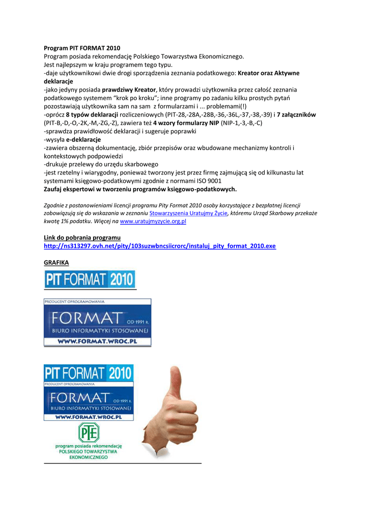 Program PIT FORMAT 2010 Program posiada rekomendację Polskiego Towarzystwa Ekonomicznego. Jest najlepszym w kraju programem tego typu. -daje użytkownikowi dwie drogi sporządzenia zeznania podatkowego: Kreator oraz Aktywne deklaracje -jako jedyny posiada prawdziwy Kreator, który prowadzi użytkownika przez całośd zeznania podatkowego systemem “krok po kroku”; inne programy po zadaniu kilku prostych pytao pozostawiają użytkownika sam na sam z formularzami i ... problemami(!) -oprócz 8 typów deklaracji rozliczeniowych (PIT-28,-28A,-28B,-36,-36L,-37,-38,-39) i 7 załączników (PIT-B,-D,-O,-2K,-M,-ZG,-Z), zawiera też 4 wzory formularzy NIP (NIP-1,-3,-B,-C) -sprawdza prawidłowośd deklaracji i sugeruje poprawki -wysyła e-deklaracje -zawiera obszerną dokumentację, zbiór przepisów oraz wbudowane mechanizmy kontroli i kontekstowych podpowiedzi -drukuje przelewy do urzędu skarbowego -jest rzetelny i wiarygodny, ponieważ tworzony jest przez firmę zajmującą się od kilkunastu lat systemami księgowo-podatkowymi zgodnie z normami ISO 9001 Zaufaj ekspertowi w tworzeniu programów księgowo-podatkowych. Zgodnie z postanowieniami licencji programu Pity Format 2010 osoby korzystające z bezpłatnej licencji zobowiązują się do wskazania w zeznaniu Stowarzyszenia Uratujmy Życie, któremu Urząd Skarbowy przekaże kwotę 1% podatku. Więcej na www.uratujmyzycie.org.pl Link do pobrania programu http://ns313297.ovh.net/pity/103suzwbncsiicrorc/instaluj_pity_format_2010.exe GRAFIKA BANNERY Kod bannera do wklejenia na stronę: <A HREF="http://ns313297.ovh.net/pity/103suzwbncsiicrorc/instaluj_pity_format_2010.exe"><IMG SRC="http://www.uratujmyzycie.org.pl/images/stories/videos/banners/banner-stayczny729x90.jpg/bannerstayczny729x90.jpg" border=0 width=728 height=90 ></a> Kod do wklejenia na stronę: <A target = "_blank" HREF="http://ns313297.ovh.net/pity/103suzwbncsiicrorc/instaluj_pity_format_2010.exe"><IMG SRC="http://www.uratujmyzycie.org.pl/images/stories/videos/banners/banner-statyczny125x125.jpg/bannerstatyczny125x125.jpg" border=0 width=125 height=125 ></a> Kod do wklejenia na stronę: <A target = "_blank" HREF="http://ns313297.ovh.net/pity/103suzwbncsiicrorc/instaluj_pity_format_2010.exe"><IMG SRC="http://www.uratujmyzycie.org.pl/images/stories/videos/banners/banner-statyczny160x600.jpg/bannerstatyczny160x600.jpg" border=0 width=160 height=600 ></a>