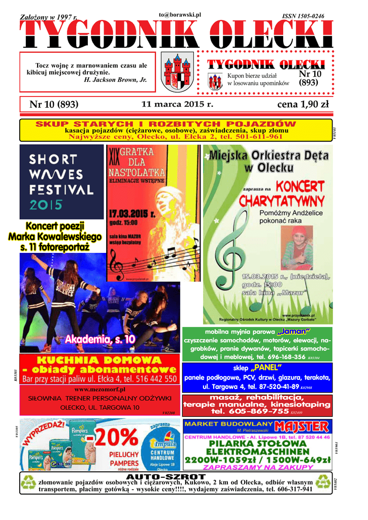 Tocz wojnę z marnowaniem czasu ale kibicuj miejscowej drużynie. H. Jackson Brown, Jr. Nr 10 (893) ISSN 1505-0246 Kupon bierze udział w losowaniu upominków 11 marca 2015 r. Nr 10 (893) cena 1,90 zł SKUP STARYCH I ROZBITYCH POJAZDÓW kasacja pojazdów (ciężarowe, osobowe), zaświadczenia, skup złomu Najwyższe ceny, Olecko, ul. Ełcka 2, tel. 501-611-961 V05103 [email protected] Założony w 1997 r. Koncert poezji Marka Kowalewskiego s. 11 fotoreportaż mobilna myjnia parowa „Jaman” czyszczenie samochodów, motorów, elewacji, nagrobków, pranie dywanów, tapicerki samochodowej i meblowej, tel. 696-168-356 K03304 K03303 Akademia, s. 10 www.mezomorf.pl SIŁOWNIA TRENER PERSONALNY ODŻYWKI OLECKO, UL. TARGOWA 10 masaż, rehabilitacja, terapie manualne, kinesiotaping tel. 605-869-755 K02409 AUTO-SZROT złomowanie pojazdów osobowych i ciężarowych, Kukowo, 2 km od Olecka, odbiór własnym transportem, płacimy gotówką - wysokie ceny!!!!, wydajemy zaświadczenia, tel. 606-317-941 V05402 V05901 V03305 V02208 sklep „PANEL” panele podłogowe, PCV, drzwi, glazura, terakota, ul. Targowa 4, tel. 87-520-41-89 K02908 2 [email protected] Archiwum „Tygodnika oleckiego” znajdziesz V02507 Tygodnik olecki 10/893 - r. 2015 ZAJĘCIA SPORTOWE DLA NIEPEŁNOSPRAWNYCH Moja córka, Ania jest osobą niepełnosprawną w stopniu znacznym. Od czerwca ubiegłego roku uczęszcza na zajęcia sportowe prowadzone nieodpłatnie w hali,,LEGA” oraz na innych obiektach sportowych MOSiR. Na początku miałam obawy, czy moja córeczka poradzi sobie, czy będzie chciała uczestniczyć w zajęciach? Dzieci i młodzież ,,sprawni inaczej” mają swoje specyficzne zahamowania i często nie da się im niczego wytłumaczyć. Nawet dorośli są ,,dużymi dziećmi”. Wszyscy: mali i duzi, mają potrzebę ruchu, którą umiejętnie trzeba wydobyć. Pragną akceptacji, zainteresowania, poczucia spełnienia i sukcesu. Tego wszystkiego może doświadczyć moje dziecko uczestnicząc w zajęciach sportowych. Wymaga to od nas, rodziców wysiłku, zaangażowania, czasu i dobrych chęci. Opłaca się! Dziecko należy doprowadzić, dowieźć na czas, towarzyszyć, w zależności od stopnia niepełnosprawności, wspomagać, odebrać. Ten czas nie jest stracony. Wystarczy spojrzeć na szczęśliwe miny naszych pociech. Poza efektami psychicznymi: umiejętność współzawod- nictwa w zespole, akceptacja rywali, pomoc słabszym, mniej sprawnym, są wymierne efekty fizyczne i zdrowotne: poprawa koordynacji ruchowej, zwiększenie wydolności organizmu, poznanie podstaw i zasad konkurencji sportowych. Organizatorem projektu jest Podlaskie Stowarzyszenie Sportowe Osób Niepełnosprawnych START w Białymstoku w projekcie ,,Prowadzenie zajęć grupowych w sekcjach sportowych”. Sekcje to: piłka siatkowa, lekka atletyka, boccia, tenis stołowy, pływanie, tenis ziemny oraz możliwość korzystania z siłowni. Brzmi to poważnie, ale zajęcia są ciekawe, dostosowane do możliwości i umiejętności uczestników. Panuje miła atmosfera – wielka frajda i zabawa, ponieważ prowadzone są przez znanych i lubianych przez młodzież trenerów. Koordynatorem zajęć na terenie naszego miasta jest Mariusz Niewiarowski. Jesteśmy wielką sportową rodziną i nam się chce. Jadwiga Wasilewska MSZE I NABOŻEŃSTWA Parafia pw. Krzyża Świętego, ul. Zamkowa Msze Święte: Dni powszednie: 7.30; 18.00 Niedziele i święta: 8.00; 10.00; 12.00 dla dzieci; 17.00 Koronka do Miłosierdzia Bożego – codziennie o godz. 15.00 w kaplicy Krzyża Parafia pw. Najświętszej Maryi Panny Królowej Polski, Plac Wolności Dni powszednie: 6.30; 7.00; 18.00 Uroczystości i święta: 6.30; 10.00; 16.00 dla dzieci; 18.00 Niedziela: 7.00; 8.30; 10.00; 11.30 dla dzieci; 13.00 dla młodzieży; 18.00 GRÜNLAND Centrum Roślin Ozdobnych najnowsza kolekcja bylin Olecko, ul. Produkcyjna 11, tel. (87) 523-90-09 V05003 V02408 Parafia pw. Świętej Rodziny, Osiedle Siejnik I Dni powszednie: 18.00 Niedziele i święta: 8.30; 11.00; 18.00 na stronie internetowej www.olecko.info (w pliku *.pdf) KRONIKA PO¯ARNICZA 3 marca od 9.50 jeden zastęp JRG PSP usuwał na szosie Świętajno skutki kolizji drogowej. Zderzenie samochodu fiat i opel. informacji udzielił aspirant sztabowy Mariusz Domin 5 marca od 14.25 jeden zastęp OSP Kowale Oleckie usuwał wodę z zalenej posesji w Dorszach. informacji udzieliła młodsza ogniomistrz Katarzyna Jeglińska Burmistrz Olecka ... zaprasza wszystkie małżeństwa obchodzące w 2015 roku Złote Gody o zgłaszanie się do Urzędu Stanu Cywilnego w Olecku plac Wolności 1, pok. nr 4, tel. 87 520 26 58, celem potwierdzenia chęci uczestniczenia w uroczystościach odznaczenia medalami Prezydenta Rzeczypospolitej Polskiej za długoletnie pożycie małżeńskie newsletter UM. ZAPRASZAMY DO UDZIAŁU W KONKURSIE PIOSENKI „Gratka dla nastolatka” – XIX edycja Konkurs skierowany jest do dzieci i młodzieży szkół podstawowych, gimnazjów i średnich powiatu oleckiego, a odbywać się będzie w trzech kategoriach wiekowych: (I kategoria: klasy I-IV , II kategoria: klasy V-VI oraz I-II gimnazjum, III kategoria: klasa III gimnazjum. Regulamin i karta zgłoszenia na stronie www.przystanek.pl Dom Kultury w Gołdapi zaprasza Państwa do wzięcia udziału w kiermaszu wielkanocnym „Jajeczko z rzeżuszką” Kiermasz odbędzie się w sali widowiskowej Domu Kultury w Gołdapi w niedzielę 29 marca 2015 r. Początek o godz. 10.00. Uczestnicy proszeni są o przybycie najpóźniej do 9.30. Wystawcom zapewniamy, stolik, krzesła. Udział w kiermaszu jest bezpłatny. Ilość miejsc ograniczona! Uczestnicy Kiermaszu mają możliwość wyeksponowania i sprzedaży swoich wyrobów takich jak:palmy, pisanki, baranki, zajączki z ciasta, z cukru, ze słomy itp., stroiki wielkanocne, rękodzieło ludowe – wyroby hafciarskie, tkackie, wikliniarskie, domowe wypieki (ciasta bez mas i kremów),półprodukty (np. przetwory, marynaty, miód, chrzan). NAJTANIEJ 