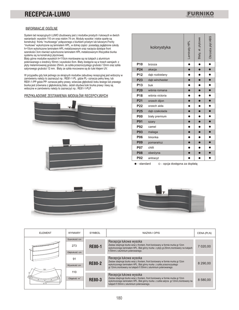 RECEPCJA-LUMO P10 brzoza P24 akacja W przypadku gdy bok jednego ze skrajnych modu³ów zabudowy recepcyjnej jest widoczny w zamówieniu nale¿y to zaznaczyæ np.: RE81-1-PL gdzie PL- oznacza pe³ny lewy, lub RE81-1-PP gdzie PP- oznacza pe³ny prawy, wówczas g³êbokoœæ boku lewego lub prawego biurka jest zrównana z g³êbokoœci¹ blatu. Je¿eli obydwa boki biurka prawy i lewy s¹ widoczne w zamówieniu nale¿y to zaznaczyæ np.: RE81-1-PLP. P12 d¹b rozbielany P23 d¹b winchester P13 buk P20 wiœnia romana PRZYK£ADOWE ZESTAWIENIA MODU£ÓW RECEPCYJNYCH P18 wiœnia victoria P21 orzech dijon P22 orzech aida P25 d¹b czekolada P00 bia³y premium P91 szary P92 camel P93 malaga P06 limonka P09 pomarañcz P07 chilli P08 ober¿yna P02 antracyt standard ELEMENT WYMIARY SYMBOL Szerokoœæ cm 273 NAZWA I OPIS CENA (PLN) Zestaw obejmuje biurko wraz z frontem, front boniowany w formie murka gr.12cm wykoñczonego laminatem HPL. Blat górny murka z p³yty gr.25mm,montowany na tulejach fi 50mm z aluminium polerowanego. 7 020,00 Recepcja ³ukowa wysoka 91 RE80-2 110 Objêtoœæ m 3 opcja dostêpna za dop³at¹ Recepcja ³ukowa wysoka RE80-1 G³êbokoœæ cm Wysokoœæ cm Obrze¿a p³yt ABS kolorystyka Laminaty HPL System lad recepcyjnych LUMO zbudowany jest z modu³ów prostych i ³ukowych w dwóch wariantach: wysokim 110 cm oraz niskim 74 cm. Modu³y wysokie i niskie oparte s¹ konstrukcji frontu “murkowego” po³¹czonego z biurkiem prostym lub ³ukowym.Fronty “murkowe” wykoñczone s¹ laminatem HPL, w dolnej czêœci posiadaj¹ zag³êbione coko³y h=10cm wykoñczone laminatem HPL metalizowanym oraz naciêcia dziel¹ce front szerokoœci 3cm równie¿ wykoñczone laminatem HPL metalizowanym.Wszystkie biurka systemu s¹ na konstrukcji p³ycinowej. Blaty górne modu³ów wysokich h=110cm montowane s¹ na tulejach z aluminium polerowanego o œrednicy 50mm i wysokoœci 6cm. Blaty dostêpne s¹ w trzech wersjach: z p³yty melaminowanej gruboœci 25mm, ze szk³a przezroczystego gruboœci 12mm oraz szk³a satynowego gruboœci 12 mm. Blaty ze szk³a mocowane s¹ do tulei klejem UV. Blaty, el. p³ytowe INFORMACJE OGÓLNE Zestaw obejmuje biurko wraz z frontem, front boniowany w formie murka gr.12cm wykoñczonego laminatem HPL. Blat górny murka z szk³a przezroczystego gr.12mm,montowany na tulejach fi 50mm z aluminium polerowanego. 8 290,00 Recepcja ³ukowa wysoka RE80-3 Zestaw obejmuje biurko wraz z frontem, front boniowany w formie murka gr.12cm wykoñczonego laminatem HPL. Blat górny murka z szk³a satyna gr.12mm,montowany na tulejach fi 50mm z aluminium polerowanego. 180 8 580,00 RECEPCJA-LUMO ELEMENT WYMIARY SYMBOL Szerokoœæ cm Recepcja prosta wysoka RE81-1 120 G³êbokoœæ cm Zestaw obejmuje biurko wraz z frontem, front boniowany w formie murka gr.12cm wykoñczonego laminatem HPL. Blat górny murka z p³yty gr.25mm, montowany na tulejach fi 50mm w kolorze aluminium. Recepcja prosta wysoka 91 Wysokoœæ cm RE81-2 110 Objêtoœæ m NAZWA I OPIS Zestaw obejmuje biurko wraz z frontem, front boniowany w formie murka gr.12cm wykoñczonego laminatem HPL. Blat górny murka ze szk³a przezroczystego gr.12mm, montowany na tulejach fi 50mm z aluminium polerowanego przyklejanych UV. Recepcja prosta wysoka 3 RE81-3 Szerokoœæ cm 140 Recepcja prosta wysoka RE82-1 G³êbokoœæ cm RE82-2 110 Objêtoœæ m 3 RE83-1 RE83-2 110 RE83-3 RE84-1 RE84-2 110 Zestaw obejmuje biurko wraz z frontem, front boniowany w formie murka gr.12cm wykoñczonego laminatem HPL. Blat górny murka z p³yty gr.25mm, montowany na tulejach fi 50mm w kolorze aluminium. Recepcja prosta wysoka 91 RE85-2 110 Objêtoœæ m 3 Zestaw obejmuje biurko wraz z frontem, front boniowany w formie murka gr.12cm wykoñczonego laminatem HPL. Blat górny murka ze szk³a satyna gr.12mm,montowany na tulejach fi 50mm z aluminium polerowanego przyklejanych UV. Recepcja prosta wysoka RE85-1 G³êbokoœæ cm Wysokoœæ cm Zestaw obejmuje biurko wraz z frontem, front boniowany w formie murka gr.12cm wykoñczonego laminatem HPL. Blat górny murka ze szk³a przezroczystego gr.12mm, montowany na tulejach fi 50mm z aluminium polerowanego przyklejanych UV. Recepcja prosta wysoka RE84-3 Szerokoœæ cm 200 Zestaw obejmuje biurko wraz z frontem, front boniowany w formie murka gr.12cm wykoñczonego laminatem HPL. Blat górny murka z p³yty gr.25mm, montowany na tulejach fi 50mm w kolorze aluminium. Recepcja prosta wysoka 91 Objêtoœæ m 3 Zestaw obejmuje biurko wraz z frontem, front boniowany w formie murka gr.12cm wykoñczonego laminatem HPL. Blat górny murka ze szk³a satyna gr.12mm,montowany na tulejach fi 50mm z aluminium polerowanego przyklejanych UV. Recepcja prosta wysoka G³êbokoœæ cm Wysokoœæ cm Zestaw obejmuje biurko wraz z frontem, front boniowany w formie murka gr.12cm wykoñczonego laminatem HPL. Blat górny murka ze szk³a przezroczystego gr.12mm, montowany na tulejach fi 50mm z aluminium polerowanego przyklejanych UV. Recepcja prosta wysoka Szerokoœæ cm 180 Zestaw obejmuje biurko wraz z frontem, front boniowany w formie murka gr.12cm wykoñczonego laminatem HPL. Blat górny murka z p³yty gr.25mm, montowany na tulejach fi 50mm w kolorze aluminium. Recepcja prosta wysoka 91 Objêtoœæ m 3 Zestaw obejmuje biurko wraz z frontem, front boniowany w formie murka gr.12cm wykoñczonego laminatem HPL. Blat górny murka ze szk³a satyna gr.12mm,montowany na tulejach fi 50mm z aluminium polerowanego przyklejanych UV. Recepcja prosta wysoka G³êbokoœæ cm Wysokoœæ cm Zestaw obejmuje biurko wraz z frontem, front boniowany w formie murka gr.12cm wykoñczonego laminatem HPL. Blat górny murka ze szk³a przezroczystego gr.12mm, montowany na tulejach fi 50mm z aluminium polerowanego przyklejanych UV. Recepcja prosta wysoka RE82-3 Szerokoœæ cm 160 Zestaw obejmuje biurko wraz z frontem, front boniowany w formie murka gr.12cm wykoñczonego laminatem HPL. Blat górny murka z p³yty gr.25mm, montowany na tulejach fi 50mm w kolorze aluminium. Recepcja pros