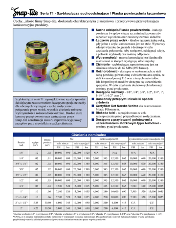 Seria 71 - Szybkoz`a˛cza suchoodcinaja˛ce / P`aska powierzchnia `a˛czeniowa Cechy...jakość firmy Snap-tite, doskona`a charakterystyka ciśnieniowa i przep`ywowa przewyższaja˛ca konkurencyjne produkty. Szybkoz`a˛cza serii 71 zaprojektowane sa˛ aby sprostać dzisiejszym zastosowaniom `a˛cza˛cym specjalne cechy dla obecnych wymagań - suche roz`a˛czanie, po`a˛czenie przez wcisk, wysokie ciśnienie robocze, wytrzyma`ość i różnorodność odmian. Bardzo duże komory przep`ywowe oraz zastrzeżona przez Snap-tite konstrukcja zaworu zapewnia wyja˛tkowy przep`yw przy niewielkim spadku ciśnienia. Suche odcie˛cie/P`aska powierzchnia - inkluzja powietrza i wyp`yw cieczy sa˛ zminimalizowane aby zapobiec wyciekom oraz zanieczyszczeniu uk`adów. La˛czenie przez wcisk - idealne `a˛czenie jedna˛ re˛ka˛, gdy jedna z cze˛ści zamocowana jest na sta`e. Wystarczy w`ożyć wtyczke˛ do gniazda i docisna˛ć w celu uzyskania po`a˛czenia. Aby roz`a˛czyć, odcia˛gna˛ć tuleje˛, a po`ówki szybkoz`a˛cza zostana˛ od`a˛czone. Wytrzyma`ość - mocna konstrukcja jest idealna dla zastosowań w których wyste˛puja˛ silne impulsy. Ciśnienie - szybkoz`a˛cze zaprojektowane jest na ciśnienia robocze do 69 MPa (690 barów). Różnorodność - doste˛pne w wykonaniach ze stali żó`ta˛ pow`oka˛ galwaniczna˛ z dwuchromianu cynku, ze stali kwasoodpornej 316 oraz z innych materia`ów. Dla k`opotliwych mediów doste˛pne sa˛ uszczelnienia specjalne; W celu uzyskania dodatkowych informacji prosimy pytać producenta. Doste˛pne rozmiary - 1/8", 1/4", 3/8", 1/2", 3/4", 1", 1-1/4", 1-1/2" oraz 2". Doskona`y przep`yw i niewielki spadek ciśnienia Certyfikat Det Norske Veritas dla zastosowań na Morzu Pó`nocnym. Blokada tulei - zaprojektowana w celu zabezpieczenia przed przypadkowym roz`a˛czeniem. Doste˛pne z przy`a˛czami gwintowymi z uszczelnieniem stożkowym typu Autoclave prosimy pytać producenta. Ciśnienia nominalne Rozmiar (cal) 1 wyp`yw (cm3) inkluzja powietrza (cm3) Stal maks. robocze stal kwasoodporna 316 min. rozrywaja˛ce* maks. robocze PSI bar PSI bar PSI bar wysokociśnieniowa stal kwasoodporna 316 min. rozrywaja˛ce* PSI bar N/A maks. robocze PSI bar N/A min. rozrywaja˛ce* PSI bar 1/8˝ .12 .02 10,000 690 22,000 1520 N/A N/A 1/4˝ .02 .01 10,000 690 20,000 1380 5,000 345 12,500 865 10,000 690 20,000 1380 3/8˝ x 1/4˝1 .02 .02 10,000 690 20,000 1380 5,000 345 12,500 865 10,000 690 20,000 1380 3/8˝ .02 .02 10,000 690 20,000 1380 5,000 345 12,500 865 10,000 690 20,000 1380 3/8˝ x 1/2˝2 .02 .02 10,000 690 20,000 1380 5,000 345 12,500 865 10,000 690 20,000 1380 1/2˝ .03 .03 10,000 690 20,000 1380 5,000 345 12,500 865 10,000 690 20,000 1380 3/4˝ .06 .04 7,500 520 15,000 1035 5,000 345 12,500 865 7,500 520 15,000 1035 1˝ .10 .06 7,500 520 15,000 1035 4,000 280 10,000 690 7,500 520 15,000 1035 1˝ x 1-1/4˝3 .10 .06 7,500 520 15,000 1035 4,000 280 10,000 690 7,500 520 15,000 1035 2˝ x 1-1/2˝4 5.25 30.50 5,000 345 10,000 690 3,000 210 6,000 415 C.F. C.F. 2˝ 5.25 30.50 5,000 345 10,000 690 3,000 210 6,000 415 C.F. C.F. z`a˛czka wielkości 3/8" z przy`a˛czem 1/4". 2z`a˛czka wielkości 3/8" z przy`a˛czem 1/2", 3z`a˛czka 1" z przy`a˛czem 1-1/4" oraz 4z`a˛czka 2" z przy`a˛czem 1-1/2", *UWAGA: Ciśnienia nominalne zosta`y określone w warunkach ciśnienia statycznego. Dla zastosowań o silnych pulsacjach należy w celu uzyskania przybliżonej wartości ciśnień przemnożyć powyższe ciśnienia nominalne przez wspó`czynnik 0,6. Informacja techniczna i wymiary 1/8˝ †† Wykresy przep`ywu 1.51 (38.35) .59 (14.99) † D`ugość po po`a˛czeniu średn 75.70 113.55 18.93 22.71 26.50 30.28 34.07 37.85 15.14 7.57 11.36 1.90 2.27 2.65 3.03 3.41 3.80 1.51 100 90 80 70 60 50 6.90 6.21 5.52 4.83 4.14 3.45 40 2.76 30 2.07 20 1.38 10 .69 hex hex 1.14 13.79 .1 od 1/4˝ do 1-1/4˝ †† 20.69 200 20 .94 2.12 (23.88) (53.85) 27.59 30 .81 (20.57) 300 1135.50 .69 (17.53) 400 5 1/8˝ X 1/4˝ 3.04 (mm) (77.22) 500 6 7 8 9 10 .59 (14.99) 4 1.55 (39.37) 3 .94 1.75 (23.88) (44.45) 8" .81 (20.57) 1/ .69 (17.53) 68.97 62.07 55.17 48.28 41.38 34.48 Maksymalne zalecane nate˛żenie przep`ywu 2 2.71 (68.83) 1000 900 800 700 600 .6 .7 .8 .9 1.0 G .5 F .4 E .2 D (średn.) .3 B (HEX)* C (HEX)* Spadek ciśnienia (psi) 1/8˝ (mm) A† 206.90 137.93 Spadek ciśnienia (bar) Rozmiar 3000 2000 757.00 Po`a˛czenie .76 .38 Nate˛żenie przep`ywu (l/min) Nate˛żenie przep`ywu p`ynu hydraulicznego (gpm) 5.60 1.88 2.25 (142.24) (47.75) (57.15) 2.63 (66.80) 3.32 (84.33) 3.23 (82.04) 0.95 (24.13) 1-1/4˝ (mm) 6.22 2.00 2.25 (157.99) (50.80) (57.15) 2.63 (66.80) 3.67 (93.22) 3.50 (88.90) 0.95 (24.13) 1.38 .69 .62 .55 .48 .41 .34 227.10 265.00 302.80 340.70 378.50 189.30 113.60 75.70 18.93 22.71 26.50 30.28 34.07 37.85 15.14 11.36 4 .27 3 .21 2 .14 1 .07 300 1˝ (mm) 200 0.88 (22.35) 4" 2.96 (75.18) 1/ 3.05 (77.47) 1 2.25 (57.15) & 5.13 1.75 1.75 (130.30) (44.45) (44.45) 1 3/4˝ (mm) 10 9 8 7 6 5 40 0.72 (18.29) 2.07 Maksymalne zalecane nate˛żenie przep`ywu 50 60 70 80 90 100 2.38 (60.45) 4˝ 2.77 (70.36) 30 1.88 (47.75) 20 3/ 4.43 1.50 1.50 (112.52) (38.10) (38.10) 2.76 30 2" 1/2˝ (mm) 40 20 0.68 (17.27) 1/ 2.32 (58.93) 8" 2.36 (59.95) 3/ 1.56 (39.62) 4" 4.00 1.00 1.19 (101.60) (25.40) (30.23) 6.90 6.21 5.52 4.83 4.14 3.45 1/ 3/8˝ (mm) 100 90 80 70 60 50 5 6 7 8 9 10 0.53 (13.46) 4 G 1.84 (46.74) 3 F 1.96 (49.78) 13.79 2 E 1.19 (30.23) 7.57 3.79 D (średn.) 0.81 0.94 (20.57) (23.88) 20.69 200 1 B (HEX)* C (HEX)* 3.27 (83.06) Spadek ciśnienia (psi) A 1/4˝ (mm) 300 Spadek ciśnienia (bar) Rozmiar 151.40 Nate˛żenie przep`ywu (l/min) po`a˛czenie Nate˛żenie przep`ywu p`ynu hydraulicznego (gpm) 1-1/2˝ i 2˝ †† 11355.00 7570.00 2271.00 2649.50 3028.50 3406.50 3785.00 1892.50 1514.00 1135.50 757.00 189.30 227.10 265.00 302.80 340.70 378.50 151.40 113.60 75.70 2" & 2" 1/ .69 .62 .55 .48 .41 .34 .27 3 .21 2 .14 1 .07 Nate˛żenie przep`ywu p`ynu hydraulicznego (gpm) Galonów na minute˛ (gpm) w galona