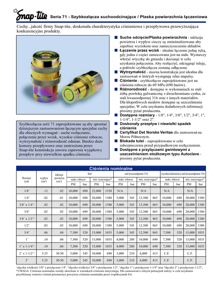 Cechy...jakosc firmy Snap-tite, doskona`a charakterystyka