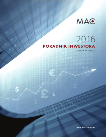 2016 PORADNIK INWESTORA EDYCJA PIERWSZA WWW.MACAUDITOR.PL PORADNIK INWESTORA WI TA J W P ORADNIKU INW E STOR A 2016 PORADNIK INWESTORA MAC AUDITOR Mac Auditor Sp. z o.o. działa na rynku od 1994 roku i specjalizuje się w outsourcingu usług księgowych oraz kadrowo-płacowych. Mac Auditor jest podmiotem uprawnionym do badania sprawozdań finansowych wpisanym na listę prowadzoną przez Krajową Izbę Biegłych Rewidentów pod numerem 244 oraz wpisanym do rejestru prowadzonego przez amerykańską organizację nadzoru PCAOB pod numerem 1920. Chcesz dowiedzieć się więcej o naszych usługach - skontaktuj się z nami: Mac Auditor Sp. z o.o., 02-691 Warszawa ul. Obrzeżna 5, VIII piętro tel. +48 (22) 649 27 65 kom: +48 530 189 966 email: [email protected] www.macauditor.pl WWW.MACAUDITOR.PL PORADNIK INWESTORA 1 POD STAWOWE DANE M A KR OE KON OM I CZN E Populacja (2014) 38 496 000 osób Produkt Krajowy Brutto (2014) wg GUS 1 728 677 000 000 PLN Produkt Krajowy Brutto per capita (2014) wg GUS 44 919 PLN Nominalny Produkt Krajowy Brutto (2014) w USD wg CIA Factbook 546 600 000 000 USD Produkt Krajowy Brutto ważony parytetem siły nabywczej (2014) wg CIA Factbook 954 500 000 000 USD Produkt Krajowy Brutto ważony parytetem siły nabywczej per capita (2014) wg CIA Factbook 25 100 USD Stopa bezrobocia (wrzesień 2015) 9,7% Ilość osób aktywnych zawodowo (2014) wg GUS 17 427 000 osób Procent osób pracujących z wyższym wykształceniem (IV kwartał 2014) wg GUS 32,5% Przeciętne wynagrodzenie brutto w trzecim kwartale 2015 3 895,33 PLN / 1 031,77 USD / 919,01 EUR Minimalne wynagrodzenie od 1 stycznia 2016 1 850,00 PLN / 490,01 USD / 436,46 EUR Kurs walut na dzień 1 października 2015 3,8005 USD / 4,2437 EUR / 5,7592 GBP / 3,8890 CHF Referencyjna stopa procentowa na dzień 30 września 2015 1,50 % WIBOR (Warsaw Interbank Offered Rate) 3 miesięczny na 30 września 2015 1,73% Wskaźnik inflacji Consumer Price Index wrzesień 2015/wrzesień 2014 99,2 Giełda Papierów Wartościowych w Warszawie Rynek główny GPW SA, 479 spółek, kapitalizacja 1 124 450 560 000 PLN (wrzesień 2015) Rynek alternatywny NewConnect, 431 spółek, kapitalizacja 9 054 350 000 PLN (wrzesień 2015) Rynek obligacji Catalyst, 195 emitentów, wartość wszystkich emisji 617 686 000 000 PLN 2 FO R MY PROWADZE NIA DZI A ŁA LN OŚCI G OSP ODA R CZE J FORMA PRAWNA CHARAKTERYSTYKA osoba fizyczna wykonująca we własnym imieniu i na własny rachunek działalność gospodarczą (np. działalność wytwórczą, budowlaną, handlową, usługową), brak szczególnych wymagań kapitałowych, Osoba fizyczna prowadząca działalność gospodarczą we własnym imieniu możliwość wyboru metody opodatkowania dochodów z działalności (PIT): - podatek liniowy według stawki 19%, - opodatkowanie na zasadach ogólnych (wg skali 18%/32%) możliwość wyboru uproszczonych form opodatkowania w przypadku wykonywania czynności określonych w przepisach (ryczałt od przychodów ewidencjonowanych, karta podatkowa) obowiązek rejestracji w Centralnej Ewidencji i Informacji o Działalności Gospodarczej (CEIDG) spółka osobowa, prowadzi przedsiębiorstwo pod własną firmą, posiada zdolność prawną, nie posiada osobowości prawnej, Spółka jawna (sp. j.) każdy wspólnik odpowiada za zobowiązania spółki bez ograniczenia całym swoim majątkiem solidarnie z pozostałymi wspólnikami oraz ze spółką, brak szczególnych wymagań kapitałowych, dochody wspólników opodatkowanie podatkiem dochodowym od osób fizycznych (PIT) – liniowo (19%) lub na zasadach ogólnych (wg skali 18%/32%), a w przypadku wspólników w formie sp. z o.o., S.A. lub S.K.A. – opodatkowane CIT (liniowo, 19%) obowiązek rejestracji w Krajowym Rejestrze Sądowym (KRS) WWW.MACAUDITOR.PL PORADNIK INWESTORA FORMA PRAWNA CHARAKTERYSTYKA spółka osobowa, utworzona przez wspólników (partnerów) w celu wykonywania wolnego zawodu w spółce prowadzącej przedsiębiorstwo pod własną firmą, posiada zdolność prawną, nie posiada osobowości prawnej, Spółka partnerska (sp. p.) każdy wspólnik (partner) odpowiada za zobowiązania spółki bez ograniczenia całym swoim majątkiem solidarnie z pozostałymi wspólnikami oraz ze spółką, przy czym partner nie ponosi odpowiedzialności za zobowiązania spółki powstałe w związku z wykonywaniem przez pozostałych partnerów wolnego zawodu w spółce, jak również za zobowiązania spółki będące następstwem działań lub zaniechań osób zatrudnionych przez spółkę na podstawie umowy o pracę lub innego stosunku prawnego, które podlegały kierownictwu innego partnera przy świadczeniu usług związanych z przedmiotem działalności spółki, brak szczególnych wymagań kapitałowych, dochody wspólników opodatkowanie podatkiem dochodowym od osób fizycznych (PIT), obowiązek rejestracji w Krajowym Rejestrze Sądowym (KRS) spółka osobowa, prowadzi przedsiębiorstwo pod własną firmą, posiada zdolność prawną, nie posiada osobowości prawnej, Spółka komandytowa (sp. k.) co najmniej jeden wspólnik (komplementariusz) odpowiada bez ograniczenia wobec wierzycieli za zobowiązania spółki, a odpowiedzialność co najmniej jednego wspólnika (komandytariusza) jest ograniczona, brak szczególnych wymagań kapitałowych, dochody wspólników od osób fizycznych opodatkowanie podatkiem dochodowym (PIT) – liniowo (19%) lub na zasadach ogólnych (wg skali 18%/32%), a w przypadku wspólników w formie sp. z o.o., S.A. lub S.K.A. – opodatkowane CIT (liniowo, 19%), obowiązek rejestracji w Krajowym Rejestrze Sądowym (KRS) spółka osobowa, prowadzi przedsiębiorstwo pod własną firmą, posiada zdolność prawną, nie posiada osobowości prawnej, Spółka komandytowo-akcyjna (S.K.A.) co najmniej jeden wspólnik (komplementariusz) odpowiada bez ograniczenia wobec wierzycieli za zobowiązania spółki, a co najmniej jeden wspólnik jest akcjonariuszem; akcjonariusz jest obowiązany jedynie do świadczeń okr