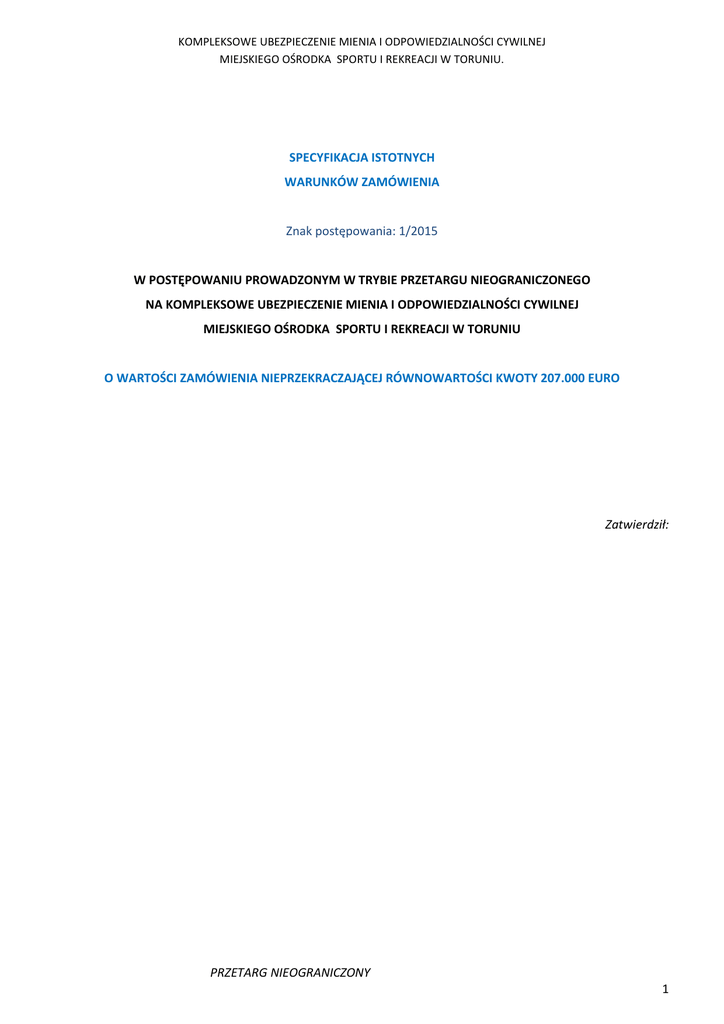 KOMPLEKSOWE UBEZPIECZENIE MIENIA I ODPOWIEDZIALNOŚCI CYWILNEJ MIEJSKIEGO OŚRODKA SPORTU I REKREACJI W TORUNIU. SPECYFIKACJA ISTOTNYCH WARUNKÓW ZAMÓWIENIA Znak postępowania: 1/2015 W POSTĘPOWANIU PROWADZONYM W TRYBIE PRZETARGU NIEOGRANICZONEGO NA KOMPLEKSOWE UBEZPIECZENIE MIENIA I ODPOWIEDZIALNOŚCI CYWILNEJ MIEJSKIEGO OŚRODKA SPORTU I REKREACJI W TORUNIU O WARTOŚCI ZAMÓWIENIA NIEPRZEKRACZAJĄCEJ RÓWNOWARTOŚCI KWOTY 207.000 EURO Zatwierdził: PRZETARG NIEOGRANICZONY 1 KOMPLEKSOWE UBEZPIECZENIE MIENIA I ODPOWIEDZIALNOŚCI CYWILNEJ MIEJSKIEGO OŚRODKA SPORTU I REKREACJI W TORUNIU I. INFORMACJE OGÓLNE 1. Wykonawca winien zapoznać się z niniejszą Specyfikacją Istotnych Warunków Zamówienia, zwaną dalej SIWZ, przed przystąpieniem do sporządzania oferty. 2. Oferty składane przez Wykonawców powinny odpowiadać postanowieniom SIWZ. 3. Oferty niezgodne z ustawą PZP lub takie, których treść nie odpowiada treści SIWZ zostaną odrzucone, a spośród tych, które nie podlegają odrzuceniu, w tym Wykonawca nie został wykluczony, zostanie wybrana oferta najkorzystniejsza. 4. Wszystkie formularze zawarte w SIWZ Wykonawca winien wypełnić ściśle według wskazówek zawartych w niniejszej SIWZ. W przypadku, gdy jakakolwiek część dokumentu nie dotyczy Wykonawcy – należy wpisać „nie dotyczy”. 5. Wielkość załączonych do SIWZ wzorów formularzy może zostać przez Wykonawcę zmieniona, jednak układ graficzny i opis poszczególnych kolumn i wierszy musi pozostać nie zmieniony. 6. Wykonawca poniesie wszelkie koszty związane z przygotowaniem i złożeniem oferty. 7. Umowa ubezpieczenia realizowana będzie przy udziale i za pośrednictwem brokera ubezpieczeniowego Nord Partner sp. z o.o. z siedzibą w Toruniu, który jest brokerem ubezpieczeniowym obsługującym Zamawiającego. II. NAZWA ORAZ ADRES ZAMAWIAJĄCEGO Nazwa zamawiającego: Miejski Ośrodek Sportu i Rekreacji w Toruniu Adres zamawiającego: ul. Bema 23/29 Kod Miejscowość: 87-100 Toruń Telefon/Fax: 056 622 67 00 NIP 965-20-98-641 REGON 8711670507 III. TRYB UDZIELENIA ZAMÓWIENIA Postępowanie o udzielenie zamówienia publicznego na „KOMPLEKSOWE UBEZPIECZENIE MIENIA I ODPOWIEDZIALNOŚCI CYWILNEJ MIEJSKIEGO OŚRODKA SPORTU I REKREACJI W TORUNIU.” prowadzone jest w trybie przetargu nieograniczonego na podstawie art. 39 i następne ustawy z dnia 29 stycznia 2004 roku Prawo zamówień publicznych (tekst jedn. Dz.U. 2013 poz. 907 z późn. zm.) zwana dalej ustawą PZP o wartości szacunkowej poniżej progów ustalonych na podstawie art. 11 ust.8 ustawy PZP. IV. OPIS PRZEDMIOTU ZAMÓWIENIA Rodzaj zamówienia: usługi CPV główne: 66.51.00.00-8 usługi ubezpieczenia V. TERMIN WYKONANIA ZAMÓWIENIA Przewidywany okres ubezpieczenia: 01.02.2015 – 31.01.2017 (24 miesiące) VI. OPIS WARUNKÓW UDZIAŁU W POSTĘPOWANIU 1. OPIS WARUNKÓW UDZIAŁU W POSTĘPOWANIU: a) Wykonawca nie może podlegać wykluczeniu z ubiegania się o zamówienie publiczne na podstawie art. 24 ust. 1 ustawy. b) W przypadku Wykonawców składających wspólną ofertę, warunki określone w pkt. a) musi spełniać każdy z Wykonawców składających wspólną ofertę. c) Wykonawca musi spełniać wymogi określone w art. 22 ust. 1 ustawy w zakresie niezbędnym do realizacji przedmiotu zamówienia. PRZETARG NIEOGRANICZONY 2 KOMPLEKSOWE UBEZPIECZENIE MIENIA I ODPOWIEDZIALNOŚCI CYWILNEJ MIEJSKIEGO OŚRODKA SPORTU I REKREACJI W TORUNIU d) e) Zamawiający wymaga, aby Wykonawca posiadał uprawnienia do prowadzenia działalności ubezpieczeniowej na terenie Polski we wszystkich grupach ryzyk, których dotyczy przedmiot zamówienia, zgodnie z ustawą o działalności ubezpieczeniowej (t.jedn. Dz.U. 2013 poz. 950 z późniejszymi zmianami). Wykonawca w celu wykazania spełnienia warunków, o których mowa powyżej (z wyłączeniem ppkt. d) może polegać odpowiednio na wiedzy i doświadczeniu, potencjale technicznym, potencjale kadrowym lub zdolnościach finansowych innych podmiotów niezależnie od charakteru prawnego łączących go z nimi stosunków. 2. OPIS SPOSOBU DOKONYWANIA OCENY SPEŁNIANIA WARUNKÓW Zamawiający dokona oceny spełniania wymagań stawianych Wykonawcom na podstawie przedłożonych dokumentów oraz w oparciu o oświadczenia stanowiące Załącznik nr 2 i 3 do SIWZ, na zasadzie „spełnia” lub „nie spełnia” wymaganego warunku. 1) Zamawiający uzna, że Wykonawca spełnia warunek dotyczący posiadania uprawnień do wykonywania działalności, jeżeli przedstawi aktualne zezwolenie na prowadzenie działalności ubezpieczeniowej wydane przez organ nadzoru zgodnie z przepisami ustawy o działalności ubezpieczeniowej lub inny dokument potwierdzający prowadzenie działalności ubezpieczeniowej na terenie Polski w zakresie nie mniejszym niż to wynika z przedmiotu zamówienia. 2) Zamawiający uzna, że Wykonawca spełnia warunek dotyczący posiadania wiedzy i doświadczenia niezbędnych do wykonywania przedmiotowego zamówienia na podstawie oświadczenia o spełnianiu warunków udziału w postępowaniu 3) Zamawiający uzna, że Wykonawca spełnia warunek dotyczący dysponowania potencjałem technicznym i osobami zdolnymi do wykonania zamówienia, na podstawie oświadczenia o spełnieniu warunków udziału w postępowaniu 4) Zamawiający uzna, że Wykonawca spełnia warunek dotyczący sytuacji ekonomicznej i finansowej, na podstawie oświadczenia o spełnieniu warunków udziału w postępowaniu Wykonawcy mogą wspólnie ubiegać się o udzielenie zamówienia publicznego, w tym celu powinni ustanowić pełnomocnika reprezentowania ich w postępowaniu o udzielenie zamówienia publicznego albo reprezentowania ich i zawarcia umowy w sprawie zamówienia publicznego. W przypadku Wykonawców ubiegających się wspólnie o zamówienie w odniesieniu do warunków określonych w: • Pkt 2 ppkt 1, - warunek ten musi spełnić każdy wykonawca, • Pozostałe warunki wykonawcy mogą spełnić łącznie. Zamawiający dokona oceny spełni