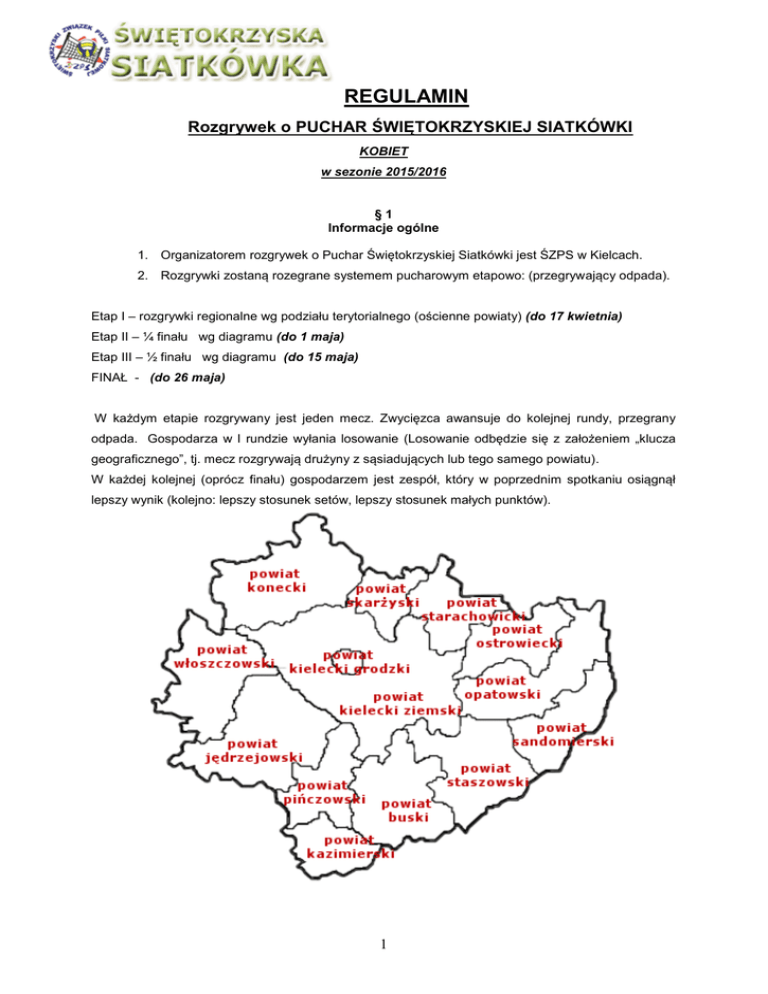 REGULAMIN Rozgrywek o PUCHAR ŚWIĘTOKRZYSKIEJ SIATKÓWKI KOBIET w sezonie 2015/2016 §1 Informacje ogólne 1. Organizatorem rozgrywek o Puchar Świętokrzyskiej Siatkówki jest ŚZPS w Kielcach. 2. Rozgrywki zostaną rozegrane systemem pucharowym etapowo: (przegrywający odpada). Etap I – rozgrywki regionalne wg podziału terytorialnego (ościenne powiaty) (do 17 kwietnia) Etap II – ¼ finału wg diagramu (do 1 maja) Etap III – ½ finału wg diagramu (do 15 maja) FINAŁ - (do 26 maja) W każdym etapie rozgrywany jest jeden mecz. Zwycięzca awansuje do kolejnej rundy, przegrany odpada. Gospodarza w I rundzie wyłania losowanie (Losowanie odbędzie się z założeniem „klucza geograficznego”, tj. mecz rozgrywają drużyny z sąsiadujących lub tego samego powiatu). W każdej kolejnej (oprócz finału) gospodarzem jest zespół, który w poprzednim spotkaniu osiągnął lepszy wynik (kolejno: lepszy stosunek setów, lepszy stosunek małych punktów). 1 §2 Organizacja. Warunki uczestnictwa 1. W rozgrywkach mogą uczestniczyć tylko zawodniczki nie posiadające licencji zawodniczej PZPS, PLPS ani innego wojewódzkiego związku piłki siatkowej na dany sezon. 2. Warunkiem uczestnictwa w rozgrywkach przesłanie jest na adres: [email protected] zgłoszenia drużyny (w formie elektronicznej) na formularzu F-02 (dostępny na stronie internetowej ŚZPS): dane zawodniczek oraz miejsce i termin rozgrywania meczu we własnej hali (nie inny jednak niż: poniedziałek – piątek od godz. 18, sobota – niedziela - dowolna godzina). Należy obowiązkowo podać adres e-mail. Komunikaty będą wysyłane do kierowników drużyn wyłącznie drogą elektroniczną !!! Termin składania zgłoszeń upływa 20 marca 2016 r. UWAGA: Zawodniczki uczestniczą w rozgrywkach dobrowolnie i na własną odpowiedzialność. Za wszelkie wypadki i kontuzje zaistniałe w czasie zawodów Organizator nie odpowiada!!! Zawodniczki nie mające ukończonych 18 lat winny dołączyć do formularza zgłoszeniowego pisemną zgodę rodziców lub opiekunów na udział w rozgrywkach (druk dostępny na stronie internetowej ŚZPS). Każda drużyna musi posiadać pełnoletniego opiekuna – trenera, który odpowiada za wszystkie zawodniczki swojej drużyny). 3. Nie są możliwe żadne zmiany składu podczas trwania rozgrywek. 4. Nagrody dla uczestników: Zwycięzca rozgrywek otrzyma Puchar Świętokrzyskiej Siatkówki Najlepsze zawodniczki finału otrzymają nagrody rzeczowe (w miarę dostępnych środków) §3 Zasady przeprowadzania zawodów 5. Mecze będą rozgrywane zgodnie z terminarzem rozgrywek wyłącznie w obiektach zamkniętych – salach gimnastycznych. Wysokość siatki: 224 cm; 6. Gospodarz spotkania jest zobowiązany co najmniej na 10 dni przed terminem granicznym danego etapu rozgrywek (podane w diagramie) podać adres hali oraz dokładny termin meczu drużynie przeciwnej oraz WRiD ŚZPS (e-mail: [email protected]). Powyższe nie dotyczy meczu finałowego – termin i miejsce finału wyznacza ŚZPS w konkursie ofert. 7. Koszty organizacji meczu we własnej hali (w tym wypłata delegacji sędziowskiej) pokrywa gospodarz. Koszty dojazdów na mecze wyjazdowe – drużyny pokrywają we własnym zakresie. 8 . Sędziego na mecze deleguje Świętokrzyski Związek Piłki Siatkowej. Wyznaczony sędzia winien mieć zapewnioną zamykaną szatnię lub pomieszczenie w celu przygotowania się do prowadzenia zawodów. Przed rozpoczęciem spotkania gospodarz wypłaca sędziemu ekwiwalent sędziowski. (Wysokość ekwiwalentu oraz sposób rozliczenia regulują przepisy ŚZPS w Kielcach (zostaną podane w oddzielnym komunikacie). 2 9. Do obowiązków gospodarza (w terminarzu umieszczony na pierwszym miejscu) należy przygotowanie sali do gry (siatki, antenek, stanowiska sędziowskiego, piłki do gry (MOLTEN V5M5000), zamykanej szatni dla drużyny gości oraz dla sędziego, tablicy wyników – może być bardzo prowizoryczna). Piłki do rozgrzewki drużyny zapewniają sobie we własnym zakresie. Gospodarz zabezpiecza także sekretarza zawodów - czyli osobę piszącą protokół. Osobie tej należy dać instrukcję wypełniania protokołu – (załącznik do protokołu). W gestii gospodarza jest także zapewnienie druku protokołu oraz kartek na ustawienie (R-5) dla obu zespołów. Obowiązuje protokół uproszczony lub oficjalny protokół PZPS. Sędzia ma obowiązek dostarczyć skan (zdjęcie) protokołu do WRiD niezwłocznie po 10. zakończeniu spotkania e-miałem na adres [email protected] . 11. Mecze będą rozgrywane zgodnie z obowiązującymi przepisami PZPS. 12. Zawody zostaną zweryfikowane jako walkower, jeżeli zespół: Odmówi gry pomimo wezwania sędziego Nie stawi się na boisku w wyznaczonym terminie bez uzasadnionego usprawiedliwienia, przy czym za niestawiennictwo uznaje się również spóźnienie przekraczające 15 minut. Przed rozpoczęciem spotkania liczy mniej niż 6 zawodników (zdekompletowanie zespołu) Rozegrał spotkanie mając w swym składzie zawodnika nieuprawnionego do gry 13. Ponadto zespół będący gospodarzem spotkania przegrywa walkowerem, gdy: Nie zapewnia sali do rozgrywania meczu i odpowiednich warunków do gry (siatka, antenki, piłka meczowa), przy czym niezwłoczne usunięcie uchybień przed rozpoczęciem spotkania nie powoduje przegranej walkowerem. nie zapewnia zamykanej szatni zespołowi gości oraz sędziemu nie zapewnia przed, w czasie i po zakończeniu spotkania porządku i bezpieczeństwa zawodnikom obu drużyn i sędziom. Nie zapewnia osoby do pisania protokołu, lub w razie nieobecności sędziego wyznaczonego – osoby mającej go zastąpić. Mecz nie może być rozegrany bez sędziego. O powyższym świadczy wyłącznie wpis do protokołu w rubryce UWAGI ! 14. We wszystkich sprawach nie ujętych w Regulaminie – decyduje Organizator. 15. ŚZPS zastrzega sobie prawo zmian w niniejszym Regulaminie. Wszelkich informacji na temat rozgrywek udziela Organizator: Adres do korespondencj