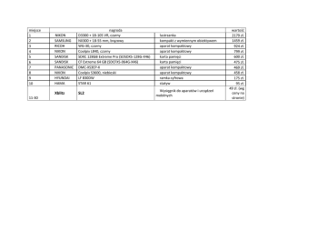 miejsce 1 2 3 4 5 6 7 8 9 10 11-30 NIKON SAMSUNG RICOH NIKON SANDISK SANDISK PANASONIC NIKON HYUNDAI HAMA nagroda D3300 + 18-105 VR, czarny NX300 + 18-55 mm, brązowy WG-30, czarny Coolpix L840, czarny SDXC 128GB Extreme Pro (SDSDXS-128G-X46) CF Extreme 64 GB (SDCFXS-064G-X46) DMC-XS3EP-K Coolpix S3600, niebieski LF 830DW STAR 61 Xblitz SL2 lustrzanka kompakt z wymiennym obiektywem aparat kompaktowy aparat kompaktowy karta pamięci karta pamięci aparat kompaktowy aparat kompaktowy ramka cyfrowa statyw Wysięgnik do aparatów i urządzeń mobilnych wartość 2179 zł. 1459 zł. 924 zł. 799 zł. 600 zł. 475 zł. 469 zł. 458 zł. 175 zł. 95 zł. 49 zł. (wg ceny na stronie)