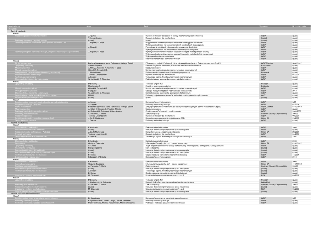 Etykiety wierszy Autor Tytuł Wydawca Nr dopuszczenia T4(ZSM) Technik mechanik Klasa 1 Pracownia podstaw konstrukcji maszyn Podstawy sterowania i regulacji maszyn Technologia obróbki skrawaniem spec. operator obrabiarek CNC J.Figurski T. Lewandowski, (puste) J. Figurski, S. Popis Rysunek techniczny zawodowy w branży mechanicznej i samochodowej Rysunek techniczny dla mechaników (puste) Przygotowanie konwencjonalnych obrabiarek skrawających do obróbki. Wykonywanie obróbki na konwencjonalnych obrabiarkach skrawających. Przygotowanie obrabiarek sterowanych numerycznie do obróbki. Wykonywanie obróbki na obrabiarkach sterowanych numerycznie. Wykonywanie elementów maszyn, urządzeń i narzędzi metodą obróbki ręcznej Wykonywanie elementów maszyn, urządzeń i narzędzi metodą obróbki maszynowej Wykonywanie połączen materiałów Naprawa i konserwacja elementów maszyn WSiP (puste) (puste) WSiP WSiP WSiP WSiP WSiP WSiP WSiP WSiP (puste) (puste) (puste) (puste) (puste) (puste) (puste) (puste) (puste) (puste) (puste) Barbara Sagnowska, Maria Fiałkowska, Jadwiga Salach Sabrina Sopranzi A.Miller, J. Kijewski, K. Pawlicki. T. Szolc Górecki A.Grzegórski Z. J. Musiałkiewicz Tadeusz Lewandowski A.Górecki W. Jabłoński, G. Płoszajski Z fizyką w przyszłość. Podręcznik dla szkół ponadgimnazjalnych. Zakres rozszerzony. Część 1 Flash on English for Mechanics, Electronics and Technical Assistance Maszynoznawstwo Montaż,naprawa ieksloatacja maszyn i urządzeń przemysłowych Podejmowanie i prowadzenie działalności gospodarczej. Rysunek techniczny dla mechaników Technologia ogólna. Podstawy technologii mechanicznych Elektrotechnika z automatyką- podręcznik dla technikum WSiP/ZamKor ESP Series WSiP WSiP Ekonomik WSiP WSiP WSiP 548/1/2012 (puste) (puste) (puste) (puste) 04/2007 (puste) (puste) D.Bonamy Myszkowska B. Górecki A.Grzegórski Z. S.Legutko W. Jabłoński, G. Płoszajski M.Feld (puste) Technical English 1,2 English in a car repair workshop Montaż,naprawa ieksloatacja maszyn i urządzeń przemysłowych Obsługa maszyn i urządzeń. Podręcznik do nauki zawodu Elektrotechnika z automatyką- podręcznik dla technikum Podstawy projektowania procesów technologicznych typowych części maszyn. (puste) Pearson Edukacja WSiP WSiP WSiP WNT (puste) (puste) (puste) (puste) 2013 (puste) (puste) (puste) A.Hensen S. Legutko Barbara Sagnowska, Maria Fiałkowska, Jadwiga Salach A. Miller, J. Kijewski, K. Pawlicki. T.Szolc A. RutkowskiA. Rutkowski,A Stępniewska A. Pacewicz, T. Merta Tadeusz Lewandowski J.Bis, R.Markiewicz J.Zawora Bezpieczeństwo i higiena pracy Podstawy eksploatacji maszyn Z fizyką w przyszłość. Podręcznik dla szkół ponadgimnazjalnych. Zakres rozszerzony. Część 2 Maszynoznawstwo Części maszynZbiór zadań z części maszyn Z ekonomią na ty Rysunek techniczny dla mechaników Komputerowe wspomaganie projektowania CAD Podstawy technologii maszyn WSiP WSiP WSiP/ZamKor WSiP WSiP Centrum Edukacji Obywatelskiej WSiP Helion SA WSiP 5/75 02/2004 548/2/2013 (puste) 2009,2008 390/03 09/2007 29/2007 (puste) E.Kurdziela (puste) J.Bis, R.Markiewicz Tadeusz Lewandowski A.Górecki Elektrotechnika i elektronika Instrukcje do ćwiczeń przygotowane przeznauczyciela Komputerowe wspomaganieprojektowania Rysunek techniczny dla mechaników Technologia ogólna. Podstawy technologii mechanicznych WSiP WSiP Helion SA WSiP WSiP 2008 (puste) 29/2007 04/2004 1991 E.Kurdziela Grażyna Zawadzka S. Chadaj brak podręcznika (puste) (puste) B. Kozak K.Szczęch, W.Bukała Elektrotechnika i elektronika Informatyka Europejczyka cz.1 - zakres rozszerzony Język angielski zawodowy w branży elektronicznej, informatycznej i elektrycznej – zeszyt ćwiczeń brak podręcznika Instrukcje do ćwiczeń przygotowane przeznauczyciela Instrukcje do ćwiczeń przygotowane przez nauczyciela Części maszyn z elementami mechaniki technicznej Bezpieczeństwo i higiena pracy WSiP Helion SA WSiP (puste) (puste) (puste) WSiP WSiP 2008 410/1/2012 (puste) (puste) (puste) (puste) 17/2004 2013 E.Kurdziela Grażyna Zawadzka A. Pacewicz, T. Merta (puste) A.Górecki B. Kozak M. Olszewski Elektrotechnika i elektronika Informatyka Europejczyka cz.1 - zakres rozszerzony Z ekonomią na ty Instrukcje do ćwiczeń przygotowane przez nauczyciela Technologia ogólna. Podstawy technologii mechanicznych Części maszyn z elementami mechaniki technicznej Urządzenia i systemy mechatronicznecz.1 i cz.2 WSiP Helion SA Centrum Edukacji Obywatelskiej (puste) (puste) (puste) REA 2008 410/1/2012 390/03 (puste) (puste) (puste) 03/2009 D.Bonamy J. Kucharczyk, M. Rolbiecka A. Pacewicz, T. Merta (puste) M. Olszewski (puste) Technical English 1,2 Detusch für Profis – zeszyty zawodowe branża mechaniczna Z ekonomią na ty Instrukcje do ćwiczeń przygotowane przez nauczyciela Urządzenia i systemy mechatronicznecz.1 i cz.2 Instrukcje do ćwiczeń przygotowane przeznauczyciela Pearson LektorKlett Centrum Edukacji Obywatelskiej (puste) REA (puste) (puste) (puste) 390/03 (puste) 03/2009 (puste) D. Stępniewski Krzysztof Grzelak, Janusz Telaga, Janusz Torzewski Piotr Fundowicz, Mariusz Radzimierski, Marcin Wieczorek Bezpieczeństwo pracy w warsztacie samochodowym Podstawy konstrukcji maszyn Podwozia i nadwozia pojazdów samochodowych WSiP WSiP WSiP 5/75 (puste) (puste) J. Figurski Technologia napraw elementów maszyn, urządzeń i narzędzispec. spawalnictwo Klasa 2 Fizyka rozszerzona Język obcy zawodowy Maszynoznawstwo Montaż maszyn i urządzeń Podejmowanie i prowadzenie działalności gospodarczej Pracownia rysunku technicznego Technologia mechaniczna Elektrotechnika, elektronika i automatyka Klasa 3 Język obcy zawodowy Montaż maszyn i urządzeń Obsługa maszyn i urządzeń Elektrotechnika, elektronika i automatyka Organizacja procesów produkcji maszyn i urządzeń Projektowanie procesów produkcji Klasa 4 Bezpieczeństwo pracy, ochrona środowiska, zarządzanie jakością Eksploatacja maszyn i urządzeń Fizyka rozsze