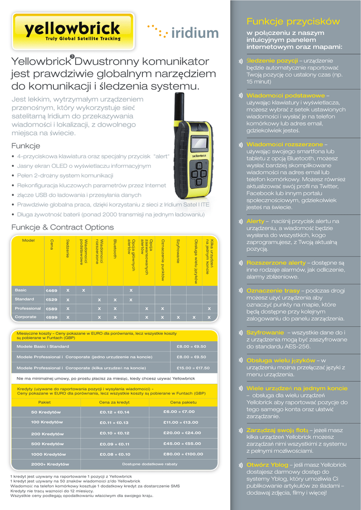 Funkcje przycisków w połączeniu z naszym intuicyjnym panelem internetowym oraz mapami: 3 Yellowbrick Dwustronny komunikator jest prawdziwie globalnym narzędziem do komunikacji i śledzenia systemu. Śledzenie pozycji – urządzenie będzie automatycznie raportować Twoją pozycję co ustalony czas (np. 15 minut) Wiadomości podstawowe – używając klawiatury i wyświetlacza, możesz wybrać z setek ustawionych wiadomości i wysłać je na telefon komórkowy lub adres email, gdziekolwiek jesteś. Jest lekkim, wytrzymałym urządzeniem przenośnym, który wykorzystuje sieć satelitarną Iridium do przekazywania wiadomości i lokalizacji, z dowolnego miejsca na świecie. Funkcje s4-przyciskowa klawiatura oraz specjalny przycisk "alert" sJasny ekran OLED o wyświetlaczu informacyjnym sPełen 2-drożny system komunikacji sRekonfiguracja kluczowych parametrów przez Internet szłącze USB do ładowania i przesyłania danych sPrawdziwie globalna praca, dzięki korzystaniu z sieci z Iridium Satel l ITE Wiadomości rozszerzone – używając swojego smartfona lub tabletu z opcją Bluetooth, możesz wysłać bardziej skomplikowane wiadomości na adres email lub telefon komórkowy. Możesz również aktualizować swój profil na Twitter, Facebook lub innym portalu społecznościowym, gdziekolwiek jesteś na świecie. sDługa żywotność baterii (ponad 2000 transmisji na jednym ładowaniu) Funkcje & Contract Options Kilka urządzeń na jednym koncie Obsługa wielu języków Szyfrowanie Oznaczenie punktów X Opcja zaawansowanych alertów Standard Opcja głównych alertów X Bluetooth €469 Wiadomości rozszerzone Basic Wiadomości podstawowe Śledzenie Cena Model X X €529 X X X Professional €589 X X X X X Corporate €699 X X X X X X X X X Miesięczne koszty – Ceny pokazane w EURO dla porównania, lecz wszystkie koszty są pobierane w Funtach (GBP) Modele Basic i Standard £8.00 = €9.50 Modele Professional i Coroporate (jedno urządzenie na koncie) £8.00 = €9.50 Modele Professional i Coroporate (kilka urządzeń na koncie) £15.00 = €17.50 Nie ma minimalnej umowy, po prostu płacisz za miesiąc, kiedy chcesz używać Yellowbrick Kredyty (używane do raportowania pozycji i wysyłania wiadomości) Ceny pokazane w EURO dla porównania, lecz wszystkie koszty są pobierane w Funtach (GBP) Pakiet Cena za kredyt Cena pakietu 50 Kredytów £0.12 = €0.14 £6.00 = €7.00 100 Kredytów £0.11 = €0.13 £11.00 = €13.00 200 Kredytów £0.10 = €0.12 £20.00 = €24.00 500 Kredytów £0.09 = €0.11 £45.00 = €55.00 1000 Kredytów £0.08 = €0.10 £80.00 = €100.00 2000+ Kredytów Dostępne dodatkowe rabaty 1 kredyt jest używany na raportowanie 1 pozycji z Yellowbrick 1 kredyt jest używany na 50 znaków wiadomości z/do Yellowbrick Wiadomość na telefon komórkowy kosztuje 1 dodatkowy kredyt za dostarczenie SMS Kredyty nie tracą ważności do 12 miesięcy. Wszystkie ceny podlegają opodatkowaniu właściwym dla swojego kraju. Alerty – naciśnij przycisk alertu na urządzeniu, a wiadomość będzie wysłana do wszystkich, kogo zaprogramujesz, z Twoją aktualną pozycją. Rozszerzone alerty – dostępne są inne rodzaje alarmów, jak odliczenie, alarmy zbliżeniowe. Oznaczenie trasy – podczas drogi możesz użyć urządzenia aby oznaczyć punkty na mapie, które będą dostępne przy kolejnym zalogowaniu do panelu zarządzenia. Szyfrowanie – wszystkie dane do i z urządzenia mogą być zaszyfrowane do standardu AES-256. Obsługa wielu języków – w urządzeniu można przełączać języki z menu urządzenia. Wiele urządzeń na jednym koncie – obsługa dla wielu urządzeń Yellobrick aby raportować pozycje do tego samego konta oraz ułatwić zarządzanie. Zarządzaj swoją flotą – jeżeli masz kilka urządzeń Yellobrick możesz zarządzań nimi wszystkimi z systemu z pełnymi możliwościami. Otwórz Yblog – jeśli masz Yellobrick dostajesz darmowy dostęp do systemy Yblog, który umożliwia Ci publikowanie artykułów ze śladami – dodawaj zdjęcia, filmy i więcej! Właściwości fizyczne Pozycja GPS używa czułego chipsetu SiRF4 Rozmiar 144 x 76 x 36mm Waga 305 gram Wyświetlacz jeden kolor OLED (plus antena) 26x35mm Właściwości środowiskowe Akcelerometr do kontroli przemieszczenia Temperatura przechowywania -40 to 85 C Temperatura działania -30 to 60 C Środowisko pracy <75% wilgotności względnej Testowanie MIL-STD-810G dla wstrząsów, temperatura i wstrząsy IP67 – Uszczelnione przed kurzem i przedostawaniem się wody zanurzenie do 1m Dwustronna komunikacja z dowolnego miejsca na Ziemi Bluetooth dla wysyłania wiadomości przez Smartfona Zasilanie Ponad 2000 transmisji na jednym ładowaniu Ładowanie przez zwykły kabel USB W pełni wodoszczelny (IP-67) Wejście USB (5v) Pobór prądu Tx/Rx: 8W Max Bateria LiPo cells, 5.3Ah Zasilanie I/O USB Komunikacja Jak działa Yellowbrick 3? Satelity GPS używane dla informacji o pozycji Iridium Modem 9602 short burst transceiver Iridium Antenna Sarantel 3101 antenna GPS antenna/chip Trimble GPS chipset Żywotność baterii (przykłady) Do 12 miesięcy przy transmisji raz na dzień Do 3 miesięcy przy transmisji raz na godzinę Satelity Iridium używane dla transmisji Stacja naziemna Iridium Do 3 tygodni przy transmisji co 15 minut Stacja naziemna Iridium Aktualna żywotność baterii będzie zależeć od środowiska oraz używanych wzorów GPS Yellowbrick 3 Przeglądarka internetowa Serwer Yellowbrick Lokalizator Yellowbrick 3 jest wytrzymały, z całkowicie samodzielną baterią, który działa w dowolnym miejscu na Ziemi. Lokalizator obudzi się (np. co 15 minut), uzyskując pozycję za pomocą sieci satelitarnej GPS, a następnie przekazuje je z powrotem do centrali Yellowbrick za pomocą sieci satelitarnej Iridium w kilka sekund. Komunikat jest przekazywany do nas z Iridium, następnie dokonywana jest wizualizacji pozycji na prostej w obsłudze przeglądarce internetowej. Yellowbrick3 umożliwia równ