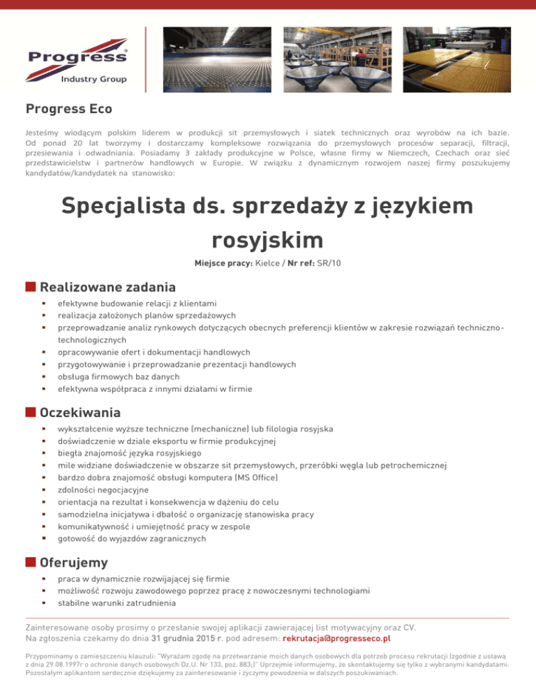 Progress Eco Jesteśmy wiodącym polskim liderem w produkcji sit przemysłowych i siatek technicznych oraz wyrobów na ich bazie. Od ponad 20 lat tworzymy i dostarczamy kompleksowe rozwiązania do przemysłowych procesów separacji, filtracji, przesiewania i odwadniania. Posiadamy 3 zakłady produkcyjne w Polsce, własne firmy w Niemczech, Czechach oraz sieć przedstawicielstw i partnerów handlowych w Europie. W związku z dynamicznym rozwojem naszej firmy poszukujemy kandydatów/kandydatek na stanowisko: Specjalista ds. sprzedaży z językiem rosyjskim Miejsce pracy: Kielce / Nr ref: SR/10 Realizowane zadania efektywne budowanie relacji z klientami realizacja założonych planów sprzedażowych przeprowadzanie analiz rynkowych dotyczących obecnych preferencji klientów w zakresie rozwiązań technicznotechnologicznych opracowywanie ofert i dokumentacji handlowych przygotowywanie i przeprowadzanie prezentacji handlowych obsługa firmowych baz danych efektywna współpraca z innymi działami w firmie Oczekiwania wykształcenie wyższe techniczne (mechaniczne) lub filologia rosyjska doświadczenie w dziale eksportu w firmie produkcyjnej biegła znajomość języka rosyjskiego mile widziane doświadczenie w obszarze sit przemysłowych, przeróbki węgla lub petrochemicznej bardzo dobra znajomość obsługi komputera (MS Office) zdolności negocjacyjne orientacja na rezultat i konsekwencja w dążeniu do celu samodzielna inicjatywa i dbałość o organizację stanowiska pracy komunikatywność i umiejętność pracy w zespole gotowość do wyjazdów zagranicznych Oferujemy praca w dynamicznie rozwijającej się firmie możliwość rozwoju zawodowego poprzez pracę z nowoczesnymi technologiami stabilne warunki zatrudnienia Zainteresowane osoby prosimy o przesłanie swojej aplikacji zawierającej list motywacyjny oraz CV. Na zgłoszenia czekamy do dnia 31 grudnia 2015 r. pod adresem: [email protected] Przypominamy o zamieszczeniu klauzuli: "Wyrażam zgodę na przetwarzanie moich danych osobowych dla potrzeb procesu rekrutacji (zgodnie z ustawą z dnia 29.08.1997r o ochronie danych osobowych Dz.U. Nr 133, poz. 883;)” Uprzejmie informujemy, że skontaktujemy się tylko z wybranymi kandydatami. Pozostałym aplikantom serdecznie dziękujemy za zainteresowanie i życzymy powodzenia w dalszych poszukiwaniach.