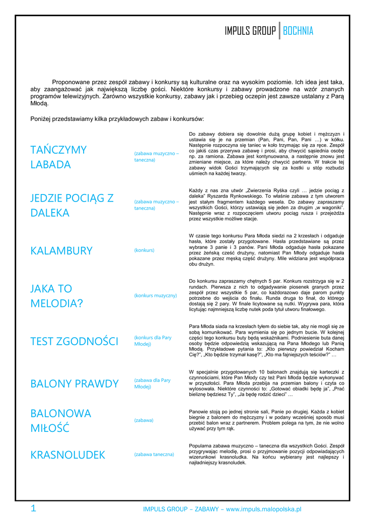 IMPULS GROUP BOCHNIA Proponowane przez zespół zabawy i konkursy są kulturalne oraz na wysokim poziomie. Ich idea jest taka, aby zaangażować jak największą liczbę gości. Niektóre konkursy i zabawy prowadzone na wzór znanych programów telewizyjnych. Zarówno wszystkie konkursy, zabawy jak i przebieg oczepin jest zawsze ustalany z Parą Młodą. Poniżej przedstawiamy kilka przykładowych zabaw i konkursów: TAŃCZYMY LABADA (zabawa muzyczno – taneczna) Do zabawy dobiera się dowolnie dużą grupę kobiet i mężczyzn i ustawia się je na przemian (Pan, Pani, Pan, Pani …) w kółku. Następnie rozpoczyna się taniec w koło trzymając się za ręce. Zespół co jakiś czas przerywa zabawę i prosi, aby chwycić sąsiednia osobę np. za ramiona. Zabawa jest kontynuowana, a następnie znowu jest zmieniane miejsce, za które należy chwycić partnera. W trakcie tej zabawy widok Gości trzymających się za kostki u stóp rozbudzi uśmiech na każdej twarzy. (zabawa muzyczno – taneczna) Każdy z nas zna utwór „Zwierzenia Ryśka czyli … jedzie pociąg z daleka” Ryszarda Rynkowskiego. To właśnie zabawa z tym utworem jest stałym fragmentem każdego wesela. Do zabawy zapraszamy wszystkich Gości, którzy ustawiają się jeden za drugim „w wagoniki”. Następnie wraz z rozpoczęciem utworu pociąg rusza i przejeżdża przez wszystkie możliwe stacje. (konkurs) W czasie tego konkursu Para Młoda siedzi na 2 krzesłach i odgaduje hasła, które zostały przygotowane. Hasła przedstawiane są przez wybrane 3 panie i 3 panów. Pani Młoda odgaduje hasła pokazane przez żeńską cześć drużyny, natomiast Pan Młody odgaduje hasła pokazane przez męską część drużyny. Mile widziana jest współpraca obu drużyn. (konkurs muzyczny) Do konkursu zapraszamy chętnych 5 par. Konkurs rozstrzyga się w 2 rundach. Pierwsza z nich to odgadywanie piosenek granych przez zespół przez wszystkie 5 par, co każdorazowo daje parom punkty potrzebne do wejścia do finału. Runda druga to finał, do którego dostają się 2 pary. W finale licytowane są nutki. Wygrywa para, która licytując najmniejszą liczbę nutek poda tytuł utworu finałowego. TEST ZGODNOŚCI (konkurs dla Pary Młodej) Para Młoda siada na krzesłach tyłem do siebie tak, aby nie mogli się ze sobą komunikować. Para wymienia się po jednym bucie. W kolejnej części tego konkursu buty będą wskaźnikami. Podniesienie buta danej osoby będzie odpowiedzią wskazującą na Pana Młodego lub Panią Młodą. Przykładowe pytania to: „Kto pierwszy powiedział Kocham Cię?”, „Kto będzie trzymał kasę?”, „Kto ma fajniejszych teściów?” … BALONY PRAWDY (zabawa dla Pary Młodej) W specjalnie przygotowanych 10 balonach znajdują się karteczki z czynnościami, które Pan Młody czy też Pani Młoda będzie wykonywać w przyszłości. Para Młoda przebija na przemian balony i czyta co wylosowała. Niektóre czynności to: „Gotować obiadki będę ja”, „Prać bieliznę będziesz Ty”, „Ja będę rodzić dzieci” … (zabawa) Panowie stoją po jednej stronie sali, Panie po drugiej. Każda z kobiet biegnie z balonem do mężczyzny i w podany wcześniej sposób musi przebić balon wraz z partnerem. Problem polega na tym, że nie wolno używać przy tym rąk. (zabawa taneczna) Popularna zabawa muzyczno – taneczna dla wszystkich Gości. Zespół przygrywając melodię, prosi o przyjmowanie pozycji odpowiadających wizerunkowi krasnoludka. Na końcu wybierany jest najlepszy i najładniejszy krasnoludek. JEDZIE POCIĄG Z DALEKA KALAMBURY JAKA TO MELODIA? BALONOWA MIŁOŚĆ KRASNOLUDEK 1 IMPULS GROUP – ZABAWY – www.impuls.malopolska.pl IMPULS GROUP BOCHNIA WYCIECZKA DO ZOO KARETA RĘKA NOGA (zabawa) Uczestnicy zabawy siadają na krzesłach w dwóch rzędach. Każdy rząd reprezentuje jedną rodzinę. Prowadzący zabawę ma za zadanie czytać tekst, a uczestnicy zabawy powinni go uważnie słuchać i stosować się do wskazówek. W momencie gdy usłyszą imię, które zostało przyporządkowane im w zabawie wstają ze swojego krzesła i biegną tak, aby jak najszybciej okrążyć wszystkich z własnej drużyny. (zabawa) Każdy z uczestników dostaje krzesło i musi zapamiętać swoją role (np.: Koń prawy, Królowa …). Podczas czytania tekstu każdy z uczestników po usłyszeniu swojej roli musi wstać i biec, aby okrążyć wszystkich uczestników zabawy. Państwo Młodzi biorą udział w zabawie w roli Królowej i Króla, natomiast nie biegają tylko wstają z krzesła. (zabawa taneczna) Zabawa polegająca na współpracy osób w parach. Na polecenie wydane przez prowadzącego, para musi utworzyć figurę w której na parkiecie może pozostać określona liczba części ciała. Bardzo wesoło jest, gdy zostaje wydane polecenie np. „2 ręce”. Jeżeli mają Państwo swoje pomysły – chętnie zrealizujemy je na Państwa uroczystości weselnej. 2 IMPULS GROUP – ZABAWY – www.impuls.malopolska.pl