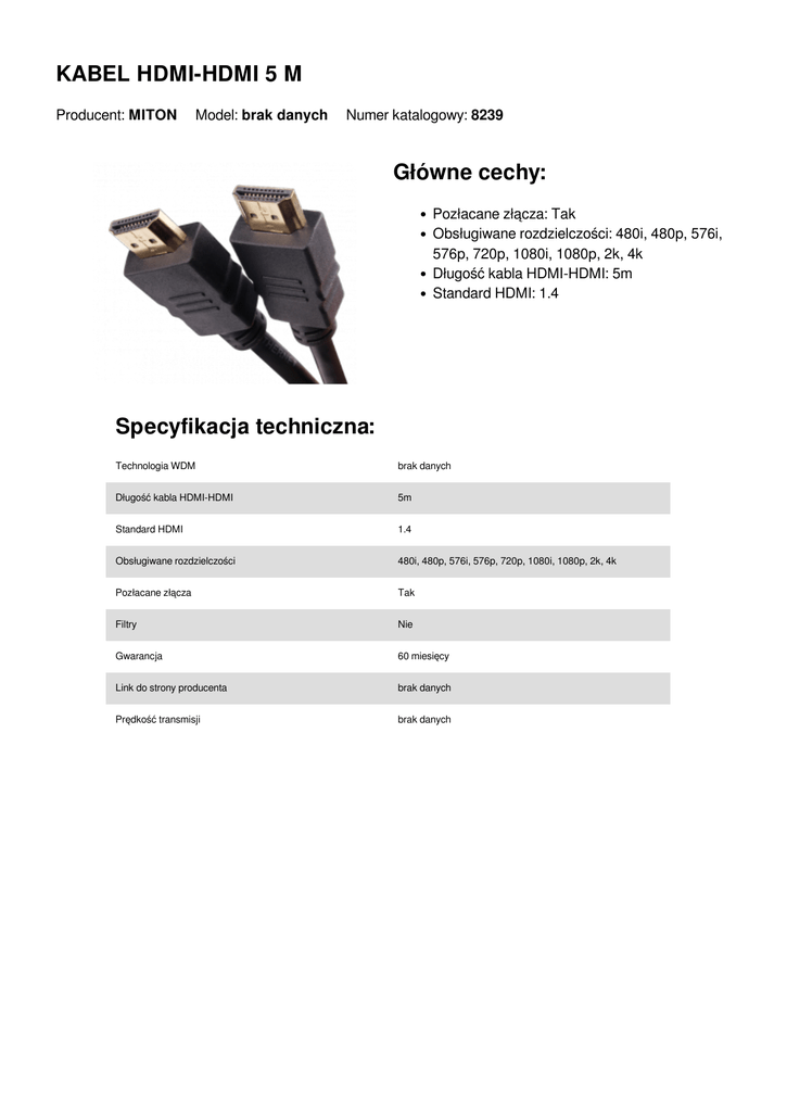 KABEL HDMI-HDMI 5 M Producent: MITON Model: brak danych Numer katalogowy: 8239 Główne cechy: Pozłacane złącza: Tak Obsługiwane rozdzielczości: 480i, 480p, 576i, 576p, 720p, 1080i, 1080p, 2k, 4k Długość kabla HDMI-HDMI: 5m Standard HDMI: 1.4 Specyfikacja techniczna: Technologia WDM brak danych Długość kabla HDMI-HDMI 5m Standard HDMI 1.4 Obsługiwane rozdzielczości 480i, 480p, 576i, 576p, 720p, 1080i, 1080p, 2k, 4k Pozłacane złącza Tak Filtry Nie Gwarancja 60 miesięcy Link do strony producenta brak danych Prędkość transmisji brak danych