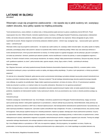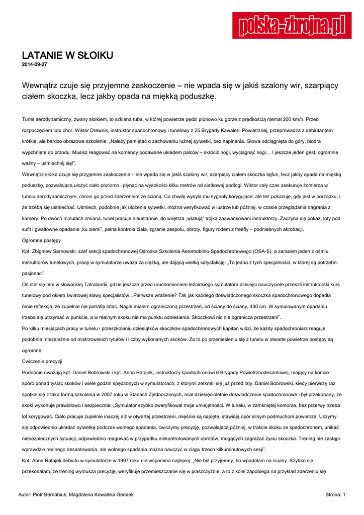 LATANIE W SŁOIKU 2014-09-27 Wewnątrz czuje się przyjemne zaskoczenie – nie wpada się w jakiś szalony wir, szarpiący ciałem skoczka, lecz jakby opada na miękką poduszkę. Tunel aerodynamiczny, zwany słoikiem, to szklana tuba, w której powietrze pędzi pionowo ku górze z prędkością niemal 200 km/h. Przed rozpoczęciem lotu chor. Wiktor Drewnik, instruktor spadochronowy i tunelowy z 25 Brygady Kawalerii Powietrznej, przeprowadza z debiutantem krótkie, ale bardzo obrazowe szkolenie: „Należy pamiętać o zachowaniu luźnej sylwetki, bez napinania. Głowa odciągnięta do góry, biodra wypchnięte do przodu. Musisz reagować na komendy podawane układem palców – skrócić nogi, wyciągnąć nogi… I jeszcze jeden gest, ogromnie ważny – uśmiechnij się!”. Wewnątrz słoika czuje się przyjemne zaskoczenie – nie wpada się w jakiś szalony wir, szarpiący ciałem skoczka tajfun, lecz jakby opada na miękką poduszkę, pozwalającą ułożyć ciało poziomo i płynąć na wysokości kilku metrów od siatkowej podłogi. Wiktor cały czas asekuruje żołnierza w tunelu aerodynamicznym, chroni go przed zderzeniem ze ścianą. Co chwilę wysyła mu sygnały korygujące, ale też pokazuje, gdy jest w porządku, i że trzeba się uśmiechać. Uśmiech, podobnie jak ułożenie sylwetki, można weryfikować w lustrze lub później, w czasie przeglądania nagrania z kamery. Po dwóch minutach zmiana, tunel pracuje nieustannie, do wnętrza „wlatują” trójką zaawansowani instruktorzy. Zaczyna się pokaz, loty pod sufit i gwałtowne opadanie „ku ziemi”, pełna kontrola ciała, zgranie zespołu, obroty, figury rodem z freefly – podniebnych akrobacji. Ogromne postępy Kpt. Zbigniew Sarnowski, szef sekcji spadochronowej Ośrodka Szkolenia Aeromobilno-Spadochronowego (OSA-S), a zarazem jeden z ośmiu instruktorów tunelowych, pracę w symulatorze uważa za ciężką, ale dającą wielką satysfakcję: „To jedna z tych specjalności, w której są potrzebni pasjonaci”. On stał się nim w słowackiej Tatralandii, gdzie jeszcze przed uruchomieniem leźnickiego symulatora dzisiejsi nauczyciele przeszli instruktorski kurs tunelowy pod okiem światowej sławy specjalistów. „Pierwsze wrażenie? Tak jak każdego doświadczonego skoczka spadochronowego dopadła mnie refleksja, że zupełnie nie potrafię latać. Nagle miałem ograniczoną przestrzeń, od ściany do ściany, 430 cm. W symulowanym opadaniu trzeba się utrzymać w punkcie, a w realnym skoku nie ma punktu odniesienia. Skoczkowi nic nie ogranicza przestrzeni”. Po kilku miesiącach pracy w tunelu i przeszkoleniu dziesiątków skoczków spadochronowych kapitan widzi, że każdy spadochroniarz reaguje podobnie, niezależnie od mistrzowskich tytułów i liczby wykonanych skoków. Za to po przeniesieniu się z tunelu w otwarte powietrze postępy są ogromne. Ćwiczenie precyzji Podobnie uważają kpt. Daniel Bobrowski i kpt. Anna Ratajek, instruktorzy spadochronowi 6 Brygady Powietrznodesantowej, mający na koncie sporo ponad tysiąc skoków i wiele godzin spędzonych w symulatorach, z którymi zetknęli się już przed laty. Daniel Bobrowski, kiedy pierwszy raz spotkał się z taką formą szkolenia w 2007 roku w Stanach Zjednoczonych, miał dziesięcioletnie doświadczenie spadochronowe i był przekonany, że skoki wykonuje prawidłowo i bezpiecznie: „Symulator szybko zweryfikował moje umiejętności. W tunelu, w zamkniętej komorze, bez przerwy trzeba lot korygować. Ciało pracuje zupełnie inaczej niż w otwartej przestrzeni, mięśnie są napięte, stawiają opór silnym podmuchom powietrza. Uczymy się odpowiednio układać sylwetkę podczas wolnego spadania, ćwiczymy precyzję, pozwalającą później, w trakcie skoku ze spadochronem, unikać niebezpiecznych sytuacji, odpowiednio reagować w przypadku niekontrolowanych obrotów, mogących zagrażać życiu skoczka. Trening nie zastąpi wprawdzie realnego desantowania, ale wolnego spadania można nauczyć w ciągu trzech kilkuminutowych sesji”. Kpt. Anna Ratajek debiutu w symulatorze w 1997 roku nie wspomina najlepiej: „Nie był przyjemny, bo wpadałam na ściany. Szybko się przekonałam, że trening wymusza precyzję, weryfikuje przemieszczanie się w płaszczyźnie, a to z kolei zapobiega na przykład zderzeniu się Autor: Piotr Bernabiuk, Magdalena Kowalska-Sendek Strona: 1 skoczków w powietrzu. Skoki w symulatorze niwelują również niepokój związany z otwarciem spadochronu i sytuacjami awaryjnymi. Można się skupić na technice skoków, zwłaszcza tych najtrudniejszych, z oporządzeniem. Również dla instruktorów, którzy wykonywali już skoki na wolne otwarcie, jest to dobry trening”. Zdaniem kpt. Sarnowskiego trening w symulatorze przydaje się wszystkim, również tym najbardziej doświadczonym, ale najłatwiej szkoli się w nim debiutantów, którym nie trzeba korygować złych nawyków: „Z tego wyciągamy prosty wniosek: każdy żołnierz spadochroniarz powinien zaczynać szkolenie od tunelu”. Autor: Piotr Bernabiuk, Magdalena Kowalska-Sendek Strona: 2