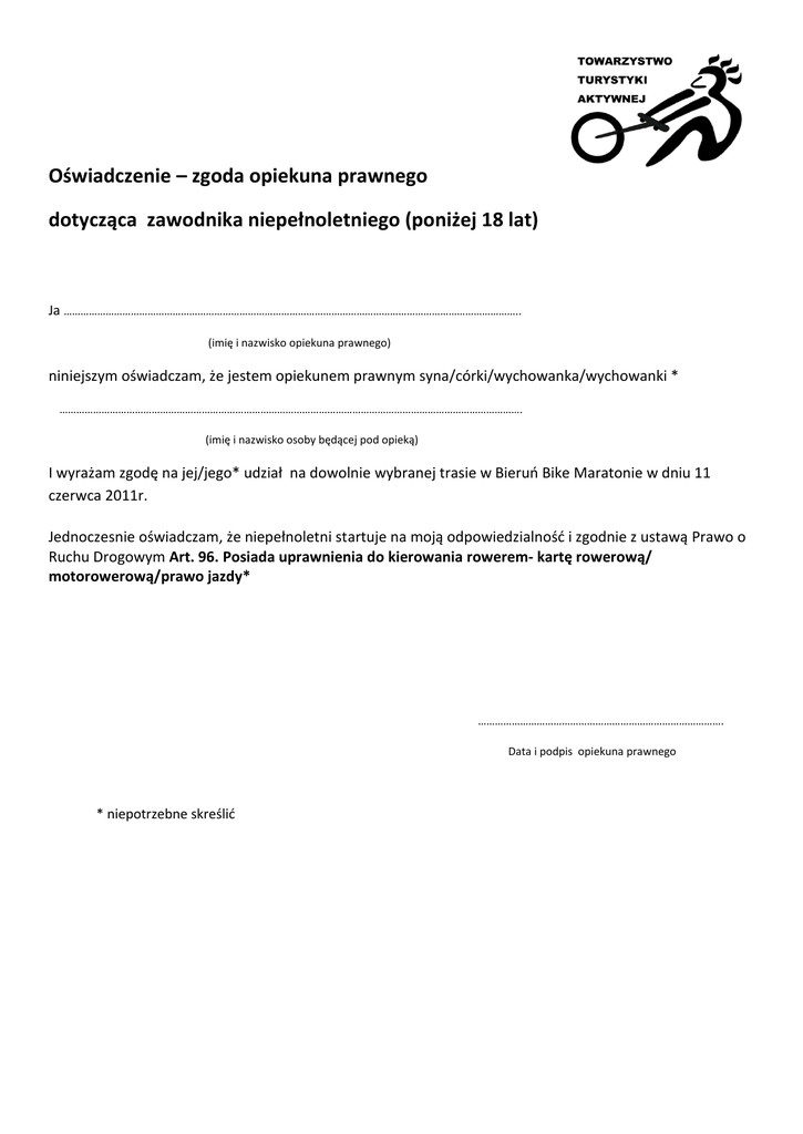 Oświadczenie – zgoda opiekuna prawnego dotycząca zawodnika niepełnoletniego (poniżej 18 lat) Ja ……………………………………………………………………………………………………………………………………………….. (imię i nazwisko opiekuna prawnego) niniejszym oświadczam, że jestem opiekunem prawnym syna/córki/wychowanka/wychowanki * …………………………………………………………………………………………………………………………………………………. (imię i nazwisko osoby będącej pod opieką) I wyrażam zgodę na jej/jego* udział na dowolnie wybranej trasie w Bieruo Bike Maratonie w dniu 11 czerwca 2011r. Jednoczesnie oświadczam, że niepełnoletni startuje na moją odpowiedzialnośd i zgodnie z ustawą Prawo o Ruchu Drogowym Art. 96. Posiada uprawnienia do kierowania rowerem- kartę rowerową/ motorowerową/prawo jazdy* ……………………………………………………………………………. Data i podpis opiekuna prawnego * niepotrzebne skreślid