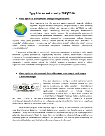 Typy klas na rok szkolny 2015/2016: Klasa ogólna z elementami ekologii i regionalizmu Klasa utworzona jest dla uczniów zainteresowanych przyrodą, ekologią, regionem. Program edukacji ekologicznej jest prowadzony w nowo powstałej pracowni ekologicznej „Wokół nas” utworzonej dzięki WFOŚiGW w Łodzi. Proponowane zajęcia umożliwiają młodzieży rozwijanie zainteresowań przyrodniczych, tworzą idealne warunki do rozwiązywania praktycznych i teoretycznych problemów badawczych. Dzięki nowoczesnemu wyposażeniu ekopracowni uczniowie samodzielnie przeprowadzają badania dotyczące czystości wody, gleby, powietrza, realizują ciekawe projekty edukacyjne m.in. „Dydaktyka ze śmietnika”, „Elektroodpady – problem czy nie”, „Stop niskiej emisji”, „Szkoła dla miast”, „Licz na zieleń”, „Szkolny detektyw – poszukiwanie nielegalnych składowisk odpadów”, „Ekologicznie, a modnie i ślicznie”. W programie wykraczającym poza treści z podstawy programowej proponujemy m.in. zajęcia terenowe, wycieczki przyrodnicze, eksperymenty naukowe, hodowle, doświadczenia biologiczne i chemiczne. Treści realizowane na lekcjach oraz w trakcie wycieczek po Łodzi i okolicach rozwijają zainteresowanie regionem, umożliwiają obcowanie z pięknem przyrody, zabytkami, pomagają poznać topografię i historię naszego miasta. Dla młodych turystów proponujemy udział w rajdach organizowanych przez PTTK i inne organizacje turystyczne, wspierające realizację zadań szkoły. Klasa ogólna z elementami dziennikarstwa prasowego, radiowego i internetowego Klasa jest utworzona z myślą o uczniach zainteresowanych środkami masowego przekazu. Program zakłada nie tylko zajęcia teoretyczne, ale także warsztaty z dziennikarzami i znawcami świata mediów. Młodzież będzie uczestniczyć w spotkaniach warsztatowych w redakcji Ekspresu Ilustrowanego, w wycieczkach do Radia Łódź, spotykać się z dziennikarzami Rozgłośni Polskiego Radia Łódź. Przewidziany jest udział uczniów w konkursach dziennikarskich, fotograficznych i literackich, a podczas dodatkowych, bezpłatnych lekcji będą oni realizować projekty dziennikarskie. Efekty pracy zespołowej przedstawimy na szkolnych wystawach prac uczniów. Proponowany program klasy obejmuje zajęcia z wiedzy o sztuce filmowej, publicystycznej oraz dziennikarstwa. Zadaniem realizacji dodatkowego programu jest kształtowanie w uczniach aktywności i krytycyzmu oraz wyrobienie umiejętności wypowiadania się zgodnie z poetyką różnych gatunków dziennikarskich. Uczeń tej klasy stanie się świadomym odbiorcą kultury, wrażliwym na problemy społeczne. Dziennikarstwo jest sztuką nie tylko słowa, choć warsztat jest bardzo ważny, ale również wnikliwej obserwacji świata i rzetelnego przekazywania informacji. W ramach programu dziennikarskiego zaplanowane są też zajęcia z wolontariuszami z Fundacji Schumana, prowadzone w języku polskim, niemieckim i angielskim. Dodatkowo proponujemy warsztaty grafiki komputerowej i obróbki zdjęć cyfrowych. Młodym adeptom sztuki dziennikarskiej umożliwimy udział w redagowaniu gazetki szkolnej GAZ, a także w realizowaniu audycji radiowych, których będzie można wysłuchać w szkolnym radiu i w Internecie. Każdy uczeń pozna podstawy rejestracji i edycji dźwięku, a w ramach projektu edukacyjnego będzie mógł nagrać i udźwiękowić autorskie słuchowisko radiowe. Młodych ludzi ciekawych świata i mediów zapraszamy do skorzystania z naszej oferty. Klasa ogólna z elementami praktycznej matematyki Klasa utworzona jest dla uczniów zainteresowanych naukami ścisłymi, poszukujących praktycznych rozwiązań różnych problemów technicznych, ekonomicznych,…. Szczególną uwagę będziemy zwracać na praktyczne wykorzystanie matematyki, na pokazywanie jej zastosowania w życiu codziennym. Planowana jest współpraca m.in. z pracownikami banku, Urzędu Statystycznego oraz przedstawicielami różnych zawodów. Program będzie realizowany na lekcjach oraz zajęciach dodatkowych. Uczniowie będą mogli rozwijać swoje zainteresowania, uczestnicząc w zajęciach Koła Praktycznych Matematyków, realizując projekt „Matematyka w praktyce” oraz biorąc udział w kuratoryjnym konkursie przedmiotowym, licznych konkursach matematycznych m.in.: Kangur, Pangea, Matematyka bez granic i innych. Proponujemy również udział w II Gimnazjalnym Konkursie Matematycznym na Najlepszego Matematyka 41 Gimnazjum oraz na najlepszy zespół klasowy z matematyki 41 Gimnazjum. Poprzez udział w zajęciach matematycznych młodzież pogłębi swoją wiedzę, udoskonali umiejętności pracy w zespole, nauczy się odpowiedzialności za podjęte zobowiązania, przygotuje do rozwiązywania praktycznych i teoretycznych problemów, pozna lepiej swoje możliwości, podniesie poziom samooceny, lepiej przygotuje się do planowania swojej przyszłości. Klasa sportowa o profilu rugby Klasa sportowa o profilu rugby , która powstanie w naszym gimnazjum po raz drugi, jest przeznaczona dla dziewcząt i chłopców , których pasją jest sport. Obecnie uczniowie tej klasy to zdobywcy tytułu mistrza Gimnazjalnej Ligi Rugby Tag 2014. Program klasy sportowej o profilu rugby jest przeznaczony dla uczniów klas I-III. Będzie on dostosowany do indywidualnych potrzeb uczniów rozpoczynających przygodę z rugby na poziomie gimnazjalnym. Nabór chłopców i dziewcząt obejmie całą Łódź. Program do tej klasy został napisany przez nauczyciela wychowania fizycznego – mgr Szymona Walczaka - instruktora i trenera rugby uczącego w naszej szkole. W ramach programu gwarantujemy: 10 godzin wychowania fizycznego tygodniowo Współpracę z instytucjami wspierającymi dyscyplinę rugby: Klub Sportowy BBRC Łódź, Łódzki Okręgowy Związek Rugby, Polski Związek Rugby Udział w rozgrywkach międzyszkolnych takich jak: „Gimnazjalna Liga Rugby Tag”, „Orlikowa Liga Rugby Tag”, udział w rozgrywkach, turniejach