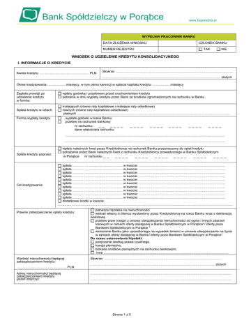 Bank Spółdzielczy w Porąbce www.bsporabka.pl WYPEŁNIA PRACOWNIK BANKU DATA ZŁOŻENIA WNIOSKU NUMER REJESTRU CZŁONEK BANKU TAK NIE WNIOSEK O UDZIELENIE KREDYTU KONSOLIDACYJNEGO I. INFORMACJE O KREDYCIE Kwota kredytu: …………….………………………. PLN Słownie: ……………………………..…………………….……………………………………… ………………….………………………………..……………………………………… złotych Okres kredytowania: …………… miesięcy, w tym okres karencji w spłacie kapitału kredytu: …………… miesięcy Zapłata prowizji za udzielenie kredytu w formie: wpłaty gotówką / przelewem przed uruchomieniem kredytu pobrania w dniu wypłaty kredytu przez Bank ze środków zgromadzonych na rachunku w Banku malejących (równe raty kapitałowe i malejące raty odsetkowe) równych (równe raty kapitałowo-odsetkowe) płatnych ………………………….…………………. ……………………………………………………………………….. wypłata gotówki w kasie Banku przelew na rachunek bankowy nr rachunku: __ ____ ____ ____ ____ ____ ____ dane właściciela rachunku: Spłata kredytu w ratach: Forma wypłaty kredytu …………………………………………………………………………………………………………….…..………….. ………………………………………………………………………………………………………….…..…………….. wpłaty należnych kwot przez Kredytobiorcę na rachunek Banku przeznaczony do spłat kredytu potrącanie przez Bank należnych kwot z rachunku Kredytobiorcy prowadzonego w Banku Spółdzielczym w Porąbce nr rachunku _ _ ____ ____ ____ ____ ____ __ Spłata kredytu poprzez: Cel kredytowania __ spłata ………. ……………………………. w kwocie: ………………………………………………………………….. spłata ………. ……………………………. w kwocie: ………………………………………………………………….. spłata ………. ……………………………. w kwocie: ………………………………………………………………….. spłata ………. ……………………………. w kwocie: ………………………………………………………………….. spłata ………. ……………………………. w kwocie: ………………………………………………………………….. spłata ………. ……………………………. w kwocie: ………………………………………………………………….. spłata ………. ……………………………. w kwocie: ………………………………………………………………….. spłata ………. ……………………………. w kwocie: ………………………………………………………………….. spłata ………. ……………………………. w kwocie: ………………………………………………………………….. spłata ………. ……………………………. w kwocie: ………………………………………………………………….. dodatkowe środki w kwocie: ……………………………………………………………………………………………..…………………………………………. Prawne zabezpieczenie spłaty kredytu: Wartość nieruchomości będącej zabezpieczeniem kredytu: …………….………………………. PLN Adres nieruchomości będącej zabezpieczeniem kredytu (jeżeli dotyczy): pierwsza hipoteka na nieruchomości weksel własny in blanco wystawiony przez Kredytobiorcę na rzecz Banku wraz z deklaracją wekslową przelew praw (cesja) z umowy ubezpieczenia nieruchomości od ognia i innych zdarzeń losowych w ramach oferty dostępnej w Banku Spółdzielczym w Porąbce*/ oferty poza Bankiem Spółdzielczym w Porąbce * wskazanie Banku jako uposażonego na wypadek śmierci w umowie ubezpieczenia na życie w ramach oferty dostępnej w Banku*/oferty poza Bankiem Spółdzielczym w Porąbce*. Do czasu ustanowienia hipoteki: poręczenie według prawa cywilnego, kaucja pieniężna, blokada środków pieniężnych na rachunku bankowym, inne ………………………………………………………………………………………………… Słownie: ……………………………..…………………….……………………………………… ………………….………………………………..…………………………………………… złotych ………………….………………………………..………………………………………………………… ………………….………………………………..………………………………………………………… Strona 1 z 5 II. INFORMACJE O WNIOSKODAWCACH Wnioskodawca I Wnioskodawca II Imiona Nazwisko Imiona rodziców Nazwisko rodowe Nazwisko rodowe matki PESEL Data urodzenia Miejsce urodzenia Stan cywilny zamężna/żonaty panna/kawaler separacja Małżeńska wspólnota majątkowa tak wdowa/wdowiec rozwiedziona/y nie nie dotyczy zamężna/żonaty panna/kawaler separacja tak nie wdowa/wdowiec rozwiedziona/y nie dotyczy Nazwa: ……………………………………….……. Nazwa: ……………………….……………………. Seria i nr …………………………………………... Seria i nr …………………………………………... Cechy dokumentu tożsamości Adres zamieszkania Adres do korespondencji (jeżeli inny niż zamieszkania) Nr telefonu (do wyboru) Wydany przez: ................................................... Wydany przez: ................................................... Data wydania: .................................................... Data wydania: ..................................................