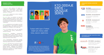 Zasady etyki krwiodawstwa: KTO ODDAJE KREW OKAZUJE SERCE Anonimowość: dane osobowe tak dawców jak i biorców są przechowywane i przetwarzane komputerowo przez służbę zdrowia regionu Toskania zgodnie z przepisami o ochronie danych osobowych i wrażliwych. Wolność wyboru: oddanie krwi to wolny i świadomy wybór każdego obywatela. Non profit: Krew i jej pochodne nie mogą być źródłem jakiegokolwiek dochodu; wartośc każdej jednostki krwi lub jej składników jest z góry ustalona na podstawie poniesionych kosztów związanych z jej gromadzeniem, przetwarzaniem, oznakowaniem i dystrybucją. Za darmo: krwiodawstwo nie jest odpłatne i nie może być wynagradzana w żaden sposób. We Włoszech krwiodawstwo odpłatne jest ścigane przez prawo na podstawie art. 22 ustawy nr 219 z 2005 roku. Higiena: Od każdego dawcy krew jest pobierana i przetaczana przy pomocy jednorazowych i sterylnych zestawów Bezpieczeństwo: Nieodpłatne krwiodawstwo, szczegółowe badania przed oddaniem krwi oraz testy diagnostyczne gwarantują chorym dostęp do bezpiecznych produktów krwiopochodnych, a także zapewniają ochronę zdrowia dawcy. 055 787651 www.pubblicheassistenzetoscane.it Via Pio Fedi, 46/48 - 50142 Firenze Tel. 055 787651 - Fax 055 78765207 [email protected] 800 261580 • www.avis.it/toscana Via Borgognissanti, 16 - 50123 Firenze Tel. 055 23.98.624 - Fax 055 29.41.62 [email protected] 800 166 666 • www.toscana.cri.it Via dei Massoni, 21 - 50139 Firenze Tel. 055 40571 - Fax 055 400699 [email protected] 055 4223746 www.fratres.org Tysiące osób żyje w Toskani dzięki tym, którzy oddali Via Benedetto Dei, 74/76 - 50141 Firenze Tel. e Fax 055 4223746 [email protected] krew, osocze i płytki krwi. Stowarzyszenie dawców krwi pępowinowej: Jakość: Przestrzeganie restrykcyjnych procedur oraz liczne kontrole jakości zestawów do pobierania zapewniają najlepszą jakość krwi i jej składników. Okresowość: Stali dawcy krwi to gwarancja zaufania i bezpieczeństwa oraz zabezpieczenie ciągłości dostaw krwi. Stały krwiodawca jest objęty okresową kontrolą lekarską. Poddawany jest dokładnym badaniom oraz ścisłym kontrolom oddawanej krwi. Każdorazowo przechodzi on badanie lekarskie i laboratoryjne oddawanej krwi. Stowarzyszenia dawców krwi: 0574 540002 • www.adisco.it Via del Lazzeretto 168/15 - 59100 Prato Cell. 335 1341929 - 335-5925648 [email protected] Jeśli chcesz wiedzieć więcej na temat krwiodawstwa, lub chcesz uzyskać informacje o Centrach krwiodawststwa i krwiolecznictwa w Twoim mieście, skorzystaj z darmowego połączenia nr 800 556060, zajrzyj na stronę internetową www.regione.toscana.it/donareilsangue lub skontaktuj się ze stowarzyszeniami dawców krwi. 0578 717238 • www.admo.it Via di Gracciano nel Corso, 73 53045 Montepulciano, Siena Cell. 338 4266318 Tel. e Fax 0578 717238 [email protected] Zasady etyki krwiodawstwa: KTO ODDAJE KREW OKAZUJE SERCE Anonimowość: dane osobowe tak dawców jak i biorców są przechowywane i przetwarzane komputerowo przez służbę zdrowia regionu Toskania zgodnie z przepisami o ochronie danych osobowych i wrażliwych. Wolność wyboru: oddanie krwi to wolny i świadomy wybór każdego obywatela. Non profit: Krew i jej pochodne nie mogą być źródłem jakiegokolwiek dochodu; wartośc każdej jednostki krwi lub jej składników jest z góry ustalona na podstawie poniesionych kosztów związanych z jej gromadzeniem, przetwarzaniem, oznakowaniem i dystrybucją. Za darmo: krwiodawstwo nie jest odpłatne i nie może być wynagradzana w żaden sposób. We Włoszech krwiodawstwo odpłatne jest ścigane przez prawo na podstawie art. 22 ustawy nr 219 z 2005 roku. Higiena: Od każdego dawcy krew jest pobierana i przetaczana przy pomocy jednorazowych i sterylnych zestawów Bezpieczeństwo: Nieodpłatne krwiodawstwo, szczegółowe badania przed oddaniem krwi oraz testy diagnostyczne gwarantują chorym dostęp do bezpiecznych produktów krwiopochodnych, a także zapewniają ochronę zdrowia dawcy. 055 787651 www.pubblicheassistenzetoscane.it Via Pio Fedi, 46/48 - 50142 Firenze Tel. 055 787651 - Fax 055 78765207 [email protected] 800 261580 • www.avis.it/toscana Via Borgognissanti, 16 - 50123 Firenze Tel. 055 23.98.624 - Fax 055 29.41.62 [email protected] 800 166 666 • www.toscana.cri.it Via dei Massoni, 21 - 50139 Firenze Tel. 055 40571 - Fax 055 400699 [email protected] 055 4223746 www.fratres.org Tysiące osób żyje w Toskani dzięki tym, którzy oddali Via Benedetto Dei, 74/76 - 50141 Firenze Tel. e Fax 055 4223746 [email protected] krew, osocze i płytki krwi. Stowarzyszenie dawców krwi pępowinowej: Jakość: Przestrzeganie restrykcyjnych procedur oraz liczne kontrole jakości zestawów do pobierania zapewniają najlepszą jakość krwi i jej składników. Okresowość: Stali dawcy krwi to gwarancja zaufania i bezpieczeństwa oraz zabezpieczenie ciągłości dostaw krwi. Stały krwiodawca jest objęty okresową kontrolą lekarską. Poddawany jest dokładnym badaniom oraz ścisłym kontrolom oddawanej krwi. Każdorazowo przechodzi on badanie lekarskie i laboratoryjne oddawanej krwi. Stowarzyszenia dawców krwi: 0574 540002 • www.adisco.it Via del Lazzeretto 168/15 - 59100 Prato Cell. 335 1341929 - 335-5925648 [email protected] Jeśli chcesz wiedzieć więcej na temat krwiodawstwa, lub chcesz uzyskać informacje o Centrach krwiodawststwa i krwiolecznictwa w Twoim mieście, skorzystaj z darmowego połączenia nr 800 556060, zajrzyj na stronę internetową www.regione.toscana.it/donareilsangue lub skontaktuj się ze stowarzyszeniami dawców krwi. 0578 717238 • www.admo.it Via di Gracciano nel Corso, 73 53045 Montepulciano, Siena Cell. 338 4266318 Tel. e Fax 0578 717238 [email protected] Zasady etyki krwiodawstwa: KTO ODDAJE KREW OKAZUJE SERCE Anonimowość: dane osobowe tak dawców jak i biorców są przechowywane i przetwarzane komputerowo przez służbę zdrowia regionu Toskania zgodnie z przepisami o ochronie danych o