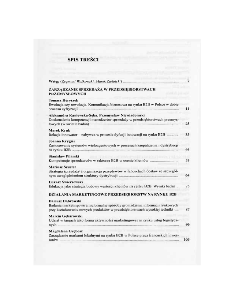 SPIS TREŚCI Wstęp (Zygmunt Waśkowski, Marek Zieliński) 7 ZARZĄDZANIE SPRZEDAŻĄ W PRZEDSIĘBIORSTWACH PRZEMYSŁOWYCH Tomasz Heryszek Ewolucja czy rewolucja. Komunikacja biznesowa na rynku B2B w Polsce w dobie procesu cyfryzacji 11 Aleksandra Kaniewska-Sęba, Przemysław Niewiadomski Doskonalenie kompetencji menedżerów sprzedaży w przedsiębiorstwach przemysłowych (w świetle badań) 25 Marek Kruk Relacje innowator — nabywca w procesie dyfuzji innowacji na rynku B2B 35 Joanna Krygier Zastosowanie systemów wieloagentowych w procesach zaopatrzenia i dystrybucji na rynku B2B 44 Stanisław Pilarski Kompetencje sprzedawców w sektorze B2B w ocenie klientów 53 Mariusz Szuster Strategia sprzedaży a organizacja przepływów w łańcuchach dostaw ze szczególnym uwzględnieniem struktury dystrybucji 64 Łukasz Świerżewski Edukacja jako strategia budowy wartości klientów na rynku B2B. Wyniki badań .. 75 DZIAŁANIA MARKETINGOWE PRZEDSIĘBIORSTW NA RYNKU B2B Dariusz Dąbrowski Badania marketingowe a nieformalne sposoby gromadzenia informacji rynkowych przy kształtowaniu nowych produktów w przedsiębiorstwach wysokiej techniki .... 87 Marcin Gębarowski Udział w targach jako forma aktywności marketingowej na rynku usług logistycznych 96 Magdalena Grębosz Zarządzanie markami lokalnymi na rynku B2B w Polsce przez francuskich inwestorów 105 4 Spis treści Izabela Michalska-Dudek Zastosowanie programów lojalnościowych na rynku business-to-business w turystyce 114 Arnold Pabian Zrównoważony marketing na rynku przedsiębiorstw 125 Katarzyna Pawlak-Kołodziejska Znaczenie działań public relations w procesie kształtowania relacji z klientami na rynku B2B 134 Maciej Schulz Determinanty lojalności klientów na rynku B2B 144 Janusz Signetzki Uwarunkowania realizacji koncepcji marketingu partnerskiego na rynku budowlanymwPolsce 153 Magdalena Sobocińska Rola komunikacji wewnętrznej w przedsiębiorstwie funkcjonującym na rynku B2B 166 Beata Tarczydło Budowanie wizerunku marki na rynku B2B 175 Piotr Zawadzki Działalność wydawców prasy codziennej w opinii reklamodawców 185 RELACJE I POWIĄZANIA SIECIOWE NA RYNKU B2B Maciej Brzozowski Design management w układzie sieci przedsiębiorstw 199 Lidia Danik, Joanna Żukowska Wpływ niedogodności wynikających z kooperacji podmiotów B2B na rozwój innowacji 209 Filip Januszewski, Justyna Lewandowska Przepływ wiedzy w łańcuchach dostaw 222 Miłosz Łuczak Znaczenie czynnika czasu w relacjach przedsiębiorstw podczas procesu internacjonalizacji 234 Łukasz Małys Wpływ kooperencji na sukces rynkowy małych i średnich przedsiębiorstw 247 Renata Oczkowska Dobór partnera jako przesłanka sukcesu w offshore outsourcing Jarosław Plichta Instytucjonalne uwarunkowania kooperacji na rynkach B2B 257 264 Spis treści Aleksandra Radziszewska Problemy komunikacji międzykulturowej w marketingowych relacjach business-to-business 274 Marek Rawski Diagnoza stanu relacji przedsiębiorstwa z interesariuszami na rynku na rynku B2B metodą refleksji strategicznej 284