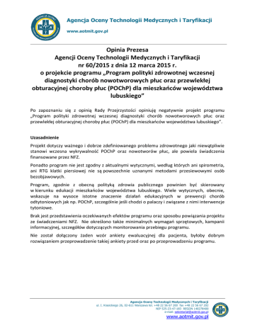 Agencja Oceny Technologii Medycznych i Taryfikacji www.aotmit.gov.pl Opinia Prezesa Agencji Oceny Technologii Medycznych i Taryfikacji nr 60/2015 z dnia 12 marca 2015 r. o projekcie programu „Program polityki zdrowotnej wczesnej diagnostyki chorób nowotworowych płuc oraz przewlekłej obturacyjnej choroby płuc (POChP) dla mieszkaoców województwa lubuskiego” Po zapoznaniu się z opinią Rady Przejrzystości opiniuję negatywnie projekt programu „Program polityki zdrowotnej wczesnej diagnostyki chorób nowotworowych płuc oraz przewlekłej obturacyjnej choroby płuc (POChP) dla mieszkaoców województwa lubuskiego”. Uzasadnienie Projekt dotyczy ważnego i dobrze zdefiniowanego problemu zdrowotnego jaki niewątpliwie stanowi wczesna wykrywalnośd POChP oraz nowotworów płuc, ale powiela świadczenia finansowane przez NFZ. Ponadto program nie jest zgodny z aktualnymi wytycznymi, według których ani spirometria, ani RTG klatki piersiowej nie są powszechnie uznanymi metodami przesiewowymi osób bezobjawowych. Program, zgodnie z obecną polityką zdrowia publicznego powinien byd skierowany w kierunku edukacji mieszkaoców województwa lubuskiego. Wiele wytycznych, obecnie, wskazuje na wysoce istotne znaczenie działao edukacyjnych w prewencji chorób odtytoniowych jak np. POChP, szczególnie jeśli chodzi o palaczy i związane z nimi interwencje tytoniowe. Brak jest przedstawienia oczekiwanych efektów programu oraz sposobu powiązania projektu ze świadczeniami NFZ. Nie określono także minimalnych wymagao sprzętowych, kampanii informacyjnej, szczegółów dotyczących monitorowania przebiegu programu. Nie został dołączony żaden wzór ankiety ewaluacyjnej dla pacjenta, byłoby dobrym rozwiązaniem przeprowadzenie takiej ankiety przed oraz po przeprowadzeniu programu. Agencja Oceny Technologii Medycznych i Taryfikacji ul. I. Krasickiego 26, 02-611 Warszawa tel. +48 22 56 67 200 fax +48 22 56 67 202 NIP 525-23-47-183 REGON 140278400 e-mail: [email protected] www.aotmit.gov.pl Opinia Prezesa AOTMiT nr 60/2015 z dnia 12 marca 2015 r. Przedmiot opinii Przedmiotem opinii jest projekt programu polityki zdrowotnej województwa lubuskiego w zakresie wczesnej diagnostyki chorób nowotworowych płuc oraz przewlekłej obturacyjnej choroby płuc (POChP). Program ma byd realizowany od dnia podpisania umowy do 15.12.2015 r. Planowany całkowity koszt realizacji programu został określony na 200 000 zł. Ocena projektu programu polityki zdrowotnej województwa lubuskiego Znaczenie problemu zdrowotnego Głównym celem Programu jest zmniejszenie zachorowalności i umieralności z powodu nowotworów oskrzela i płuc oraz przewlekłej obturacyjnej choroby płuc wśród mieszkaoców województwa lubuskiego. Projekt programu dotyczy ważnego problemu zdrowotnego opierającego się na profilaktyce i wczesnym wykrywaniu przewlekłej obturacyjnej choroby płuc oraz nowotworów płuc w populacji osób w wieku 35-75 lat zamieszkujących województwo lubuskie. Zakres programu jest zgodny z rozporządzeniem Ministra Zdrowia w sprawie priorytetów zdrowotnych oraz Narodowym Programem Zdrowia na lata 20072015 – cel strategiczny: zmniejszenie zachorowalności i przedwczesnej umieralności z powodu przewlekłych chorób układu oddechowego oraz zmniejszenie zachorowalności i przedwczesnej umieralności z powodu nowotworów złośliwych. Autorzy projektu nie przedstawili w opisie oczekiwanych efektów programu. Populacja docelowa Autorzy projektu programu przedstawili dane epidemiologiczne dla Polski. Zakres referencyjny został przedstawiony. Dodatkowo przedstawiono również dane dotyczące liczby ludności na terenie województwa lubuskiego dotyczące liczby zgonów na nowotwory złośliwe oskrzeli i płuc z podziałem na płed oraz wiek w roku 2012 r. Weryfikacja wszystkich danych przeprowadzona przez analityka AOTMiT pozwala stwierdzid, że dane zawarte w projekcie programu zostały przygotowane w sposób prawidłowy, niebudzący wątpliwości. Oparto się w projekcie programu o rzetelne źródła informacji m.in. opracowania Centrum Onkologii- Instytutu. Wedlug informacji zawartych na stronie internetowej GUS4 województwo lubuskie zamieszkiwało w 2013 r. ponad 509 000 osób w wieku 35-74 lata. Autorzy planują objąd działaniami samego programu w zależności od wariantu (4 możliwe warianty) włączenie do programu od ok. 1400 do 4875 osób. Interwencja W przypadku realizacji programu polityki zdrowotnej, autorzy programu nie określili liczby interwencji planowanych do przeprowadzenia natomiast należy mied na uwadze, że jest to dośd zmienna kwestia w zależności od zastosowanego wariantu u danego pacjenta. Autorzy programu wyszczególnili rodzaje świadczeo oferowane mieszkaocom województwa lubuskiego tj.: dwie konsultacje lekarskie, RTG klatki piersiowej oraz spirometrię. Zgodnie z aktualnymi wytycznymi, zaleca się wykonanie spirometrii dla osób, u których występują następujące czynniki ryzyka: przewlekły kaszel, odkrztuszanie plwociny, świszczący oddech lub dusznośd, stwierdzony w wywiadzie rodzinnym niedobór α12/9 Opinia Prezesa AOTMiT nr 60/2015 z dnia 12 marca 2015 r. antytrypsyny, palenie tytoniu (w tym narażenie na dym tytoniowy) – liczba paczko-lat w poszczególnych rekomendacjach różni się, natomiast nigdy nie jest niższa niż 10; nawracające, ostre, infekcyjne zapalenie oskrzeli; narażenie na pyły i środki chemiczne w środowisku pracy. Zaznacza się, że badanie to powinno byd przeprowadzane przez wykwalifikowany personel na odpowiednio wykalibrowanym urządzeniu. W związku z powyższym, zasadnym jest zastosowanie badao diagnostycznych w postaci spirometrii w grupach wymienionych przez autorów projektu programu. Jednak należy podkreślid, że aktualnie realizowany jest Program profilaktyki chorób odtytoniowych (w tym POChP) składający się z dwóch etapów. W programie finansowanym przez NFZ, wdrażane jest: zebranie wywiadu przez lekarza POZ do