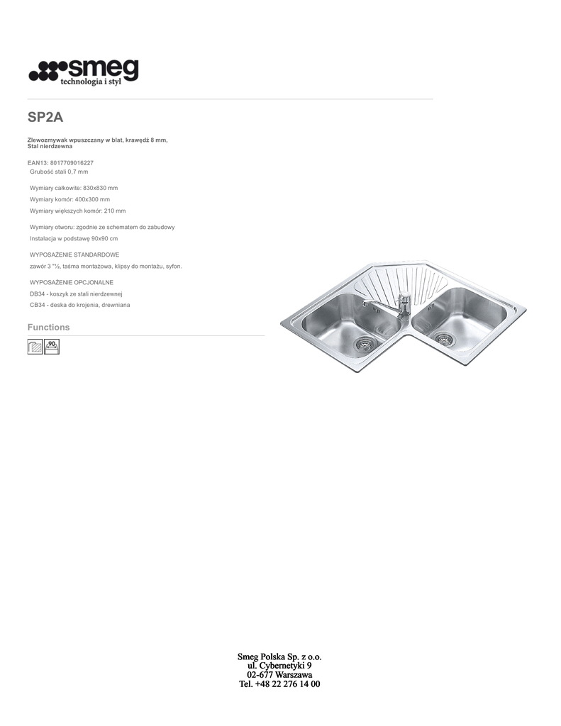SP2A Zlewozmywak wpuszczany w blat, krawędź 8 mm, Stal nierdzewna EAN13: 8017709016227 Grubość stali 0,7 mm Wymiary całkowite: 830x830 mm Wymiary komór: 400x300 mm Wymiary większych komór: 210 mm Wymiary otworu: zgodnie ze schematem do zabudowy Instalacja w podstawę 90x90 cm WYPOSAŻENIE STANDARDOWE zawór 3 "½, taśma montażowa, klipsy do montażu, syfon. WYPOSAŻENIE OPCJONALNE DB34 - koszyk ze stali nierdzewnej CB34 - deska do krojenia, drewniana Functions Smeg Polska Sp. z o.o. ul. Cybernetyki 9 02-677 Warszawa Tel. +48 22 276 14 00 SP2A iLOŚĆ KOMÓR: 2 stal nierdzewna 83 cm zlewozmywaki ze stali nierdzewnej wpuszczane w blat INSTALACJA PRZY KRAWĘDZI: Instalacja z zachowaniem krawędzi 8 mm. 90 CM PODSTAWA: Szerokość szafki/ podstawy wymagana do instalacji - 90 cm Smeg Polska Sp. z o.o. ul. Cybernetyki 9 02-677 Warszawa Tel. +48 22 276 14 00 SP2A iLOŚĆ KOMÓR: 2 stal nierdzewna 83 cm zlewozmywaki ze stali nierdzewnej wpuszczane w blat Smeg Polska Sp. z o.o. ul. Cybernetyki 9 02-677 Warszawa Tel. +48 22 276 14 00