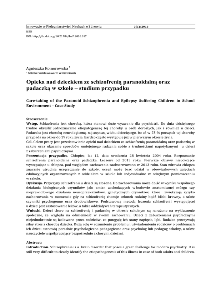 Innowacje w Pielęgniarstwie i Naukach o Zdrowiu 3(1)/2016 ISSN DOI: http://dx.doi.org/10.21784/IwP.2016.017 Agnieszka Komorowska 1 1 Szkoła Podstawowa w Wilkowicach Opieka nad dzieckiem ze schizofrenią paranoidalną oraz padaczką w szkole – studium przypadku Care-taking of the Paranoid Schizophrenia and Epilepsy Suffering Children in School Environment – Case Study Streszczenie Wstęp. Schizofrenia jest chorobą, która stanowi duże wyzwanie dla psychiatrii. Do dnia dzisiejszego trudno określić jednoznacznie etiopatogenezę tej choroby u osób dorosłych, jak i również u dzieci. Padaczka jest chorobą neurologiczną, najczęstszą wieku dziecięcego, bo aż w 75 % początek tej choroby przypada na okres do 19 roku życia. Bardzo często występuje już w pierwszym okresie życia. Cel. Celem pracy jest przedstawienie opieki nad dzieckiem ze schizofrenią paranoidalną oraz padaczką w szkole oraz ukazanie sposobów umiejętnego radzenia sobie z trudnościami napotykanymi u dzieci z zaburzeniami psychicznymi. Prezentacja przypadku. Chłopiec, lat 12, data urodzenia 28 kwietnia 2004 roku. Rozpoznanie schizofrenia paranoidalna oraz padaczka. Leczony od 2013 roku. Pierwsze objawy niepokojące występujące u chłopca, pod względem zachowania zaobserwowano w 2013 roku. Stan zdrowia chłopca znacznie utrudnia uczęszczanie do szkoły, uczeń może brać udział w obowiązkowych zajęciach edukacyjnych organizowanych z oddziałem w szkole lub indywidualne w odrębnym pomieszczeniu w szkole. Dyskusja. Przyczyny schizofrenii u dzieci są złożone. Do zachorowania może dojść w wyniku wspólnego działania biologicznych czynników jak: zmian zachodzących w budowie anatomicznej mózgu czy nieprawidłowego działania neuroprzekaźników, genetycznych czynników, które zwiększają ryzyko zachorowania w momencie gdy na schizofrenię choruje członek rodziny bądź bliski krewny, a także czynniki psychogenne oraz środowiskowe. Podstawową metodą leczenia schizofrenii występującej u dzieci jest zastosowanie leków, a także oddziaływań terapeutycznych. Wnioski. Dzieci chore na schizofrenię i padaczkę w okresie szkolnym są narażone na wykluczenie społeczne, ze względu na odmienność w swoim zachowaniu. Dzieci z zaburzeniami psychicznymi niejednokrotnie są izolowane przez rodziców, co potęguję ich stany napięcia, lęki. Rodzice przezywają silny stres z chorobą dziecka. Dużą rolę w rozumieniu problemu i uświadomieniu rodziców o problemach ich dzieci stanowią poradnie psychologiczno-pedagogiczne oraz psycholog lub pedagog szkolny, a także nauczyciele współpracujący bezpośrednio z chorymi dziećmi. Abstract: Introduction. Schizophrenia is a brain disorder that poses a great challenge for modern psychiatry. It is still very difficult to clearly identify the etiopathogenesis of this illness in case of both adults and children. Epilepsy comes as the neurological disorder of childhood and adolescence stage as its onset starts not later than till the age of 19; it also quite often occurs in the first period of human’s life. Aim. This paper aims to present various methods of care-taking of children with paranoid schizophrenia and epilepsy in their school environment, and provide methods for successful coping with any difficulties encountered in case of mentally ill children. Case presentation. A twelve-year boy born on 28 July 2004 diagnosed with paranoid schizophrenia and epilepsy. The treatment started in 2013 when first disturbing symptoms were noticed. His health problems make it extremely difficult for him to attend school. He can take part in regular classes or individual classes in a separate room. Discussion. The causes of schizophrenia among children are very complex. The illness may be triggered by biological factors, for example changes occurring in the brain or abnormal activity of neurotransmitters; genetic factors, especially when a member of the family or a close relative suffered from the illness; but also community factors are crucial..The primary method for treating schizophrenia, occurring in children, is the use of drugs and therapeutic interactions. Conclusions. Children with schizophrenia or epilepsy are susceptible to social exclusion due to their behaviour differences. It most often happens that the children suffering from psychical disorders are isolated by their parents which triggers their anxiety and fears. The parents undergo severe stress referring to the child’s illness. Psychological and pedagogical counselling centres, the school-based psychologists or pedagogy therapists, as well as teachers cooperating directly with the ill children play a vital role in assisting the parents in understanding the problem and coping with it. Słowa kluczowe: schizofrenia, padaczka, opieka nad dzieckiem, szkoła. Key words: schizophrenia, epilepsy, childcare, school. Wstęp Schizofrenia jest chorobą psychiczną. Bleuer po raz pierwszy użyl terminu schizofrenia w 1911 roku. Słowo schizofrenia oznacza ,, rozszczepienie rozumu lub serca’’ (schizo – rozszczepiam, phren - rozum, serce). Schizofrenia jest chorobą, która stanowi duże wyzwanie dla psychiatrii. Do dnia dzisiejszego trudno określić jednoznacznie etiopatogenezę tej choroby u osób dorosłych, jak i również u dzieci. Pierwsze objawy schizofrenii pojawiają się przed 15 rokiem życia u około 4 % chorych, tylko 1 % przed 10 rokiem życia, natomiast największy procent zachorowania na schizofrenię pojawia się przed 20 rokiem życia i stanowi 12-35 %. Na schizofrenię w okresie dzieciństwa chorują częściej chłopcy niż dziewczynki. Przewaga ta jest zauważalna w okresie dzieciństwa, natomiast tendencję malejącą zauważa się w okresie dojrzewania. W okresie dorosłości zachorowalność na schizofrenię charakteryzuję się zbliżoną tendencją zarówno u mężczyzn jak i u kobiet [1,2]. Zgodnie z definicją Światowej Organizacji Zdrowia termin padaczka oznacza p