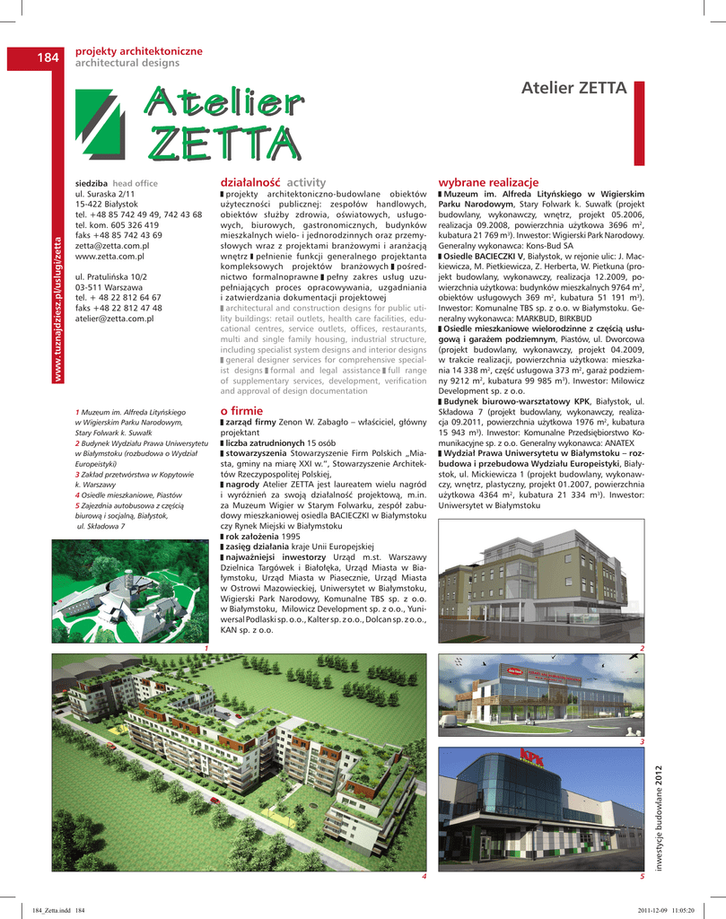 184 projekty architektoniczne architectural designs www.tuznajdziesz.pl/uslugi/zetta Atelier ZETTA działalność activity siedziba head office ul. Suraska 2/11 15-422 Białystok tel. +48 85 742 49 49, 742 43 68 tel. kom. 605 326 419 faks +48 85 742 43 69 [email protected] www.zetta.com.pl projekty architektoniczno-budowlane obiektów użyteczności publicznej: zespołów handlowych, obiektów służby zdrowia, oświatowych, usługowych, biurowych, gastronomicznych, budynków mieszkalnych wielo- i jednorodzinnych oraz przemysłowych wraz z projektami branżowymi i aranżacją wnętrz pełnienie funkcji generalnego projektanta kompleksowych projektów branżowych pośrednictwo formalnoprawne pełny zakres usług uzupełniających proces opracowywania, uzgadniania i zatwierdzania dokumentacji projektowej architectural and construction designs for public utility buildings: retail outlets, health care facilities, educational centres, service outlets, offices, restaurants, multi and single family housing, industrial structure, including specialist system designs and interior designs general designer services for comprehensive specialist designs formal and legal assistance full range of supplementary services, development, verification and approval of design documentation ul. Pratulińska 10/2 03-511 Warszawa tel. + 48 22 812 64 67 faks +48 22 812 47 48 [email protected] 1 Muzeum im. Alfreda Lityńskiego w Wigierskim Parku Narodowym, Stary Folwark k. Suwałk 2 Budynek Wydziału Prawa Uniwersytetu w Białymstoku (rozbudowa o Wydział Europeistyki) 3 Zakład przetwórstwa w Kopytowie k. Warszawy 4 Osiedle mieszkaniowe, Piastów 5 Zajezdnia autobusowa z częścią biurową i socjalną, Białystok, ul. Składowa 7 o firmie zarząd firmy Zenon W. Zabagło – właściciel, główny projektant liczba zatrudnionych 15 osób stowarzyszenia Stowarzyszenie Firm Polskich „Miasta, gminy na miarę XXI w.”, Stowarzyszenie Architektów Rzeczypospolitej Polskiej, nagrody Atelier ZETTA jest laureatem wielu nagród i wyróżnień za swoją działalność projektową, m.in. za Muzeum Wigier w Starym Folwarku, zespół zabudowy mieszkaniowej osiedla BACIECZKI w Białymstoku czy Rynek Miejski w Białymstoku rok założenia 1995 zasięg działania kraje Unii Europejskiej najważniejsi inwestorzy Urząd m.st. Warszawy Dzielnica Targówek i Białołęka, Urząd Miasta w Białymstoku, Urząd Miasta w Piasecznie, Urząd Miasta w Ostrowi Mazowieckiej, Uniwersytet w Białymstoku, Wigierski Park Narodowy, Komunalne TBS sp. z o.o. w Białymstoku, Milowicz Development sp. z o.o., Yuniwersal Podlaski sp. o.o., Kalter sp. z o.o., Dolcan sp. z o.o., KAN sp. z o.o. 1 wybrane realizacje Muzeum im. Alfreda Lityńskiego w Wigierskim Parku Narodowym, Stary Folwark k. Suwałk (projekt budowlany, wykonawczy, wnętrz, projekt 05.2006, realizacja 09.2008, powierzchnia użytkowa 3696 m2, kubatura 21 769 m3). Inwestor: Wigierski Park Narodowy. Generalny wykonawca: Kons-Bud SA Osiedle Bacieczki V, Białystok, w rejonie ulic: J. Mackiewicza, M. Pietkiewicza, Z. Herberta, W. Pietkuna (projekt budowlany, wykonawczy, realizacja 12.2009, powierzchnia użytkowa: budynków mieszkalnych 9764 m2, obiektów usługowych 369 m2, kubatura 51 191 m3). Inwestor: Komunalne TBS sp. z o.o. w Białymstoku. Generalny wykonawca: Markbud, Birkbud Osiedle mieszkaniowe wielorodzinne z częścią usługową i garażem podziemnym, Piastów, ul. Dworcowa (projekt budowlany, wykonawczy, projekt 04.2009, w trakcie realizacji, powierzchnia użytkowa: mieszkania 14 338 m2, część usługowa 373 m2, garaż podziemny 9212 m2, kubatura 99 985 m3). Inwestor: Milowicz Development sp. z o.o. Budynek biurowo-warsztatowy KPK, Białystok, ul. Składowa 7 (projekt budowlany, wykonawczy, realizacja 09.2011, powierzchnia użytkowa 1976 m2, kubatura 15 943 m3). Inwestor: Komunalne Przedsiębiorstwo Komunikacyjne sp. z o.o. Generalny wykonawca: Anatex Wydział Prawa Uniwersytetu w Białymstoku – rozbudowa i przebudowa Wydziału Europeistyki, Białystok, ul. Mickiewicza 1 (projekt budowlany, wykonawczy, wnętrz, plastyczny, projekt 01.2007, powierzchnia użytkowa 4364 m2, kubatura 21 334 m3). Inwestor: Uniwersytet w Białymstoku 2 inwestycje budowlane 2012 3 4 184_Zetta.indd 184 5 2011-12-09 11:05:20