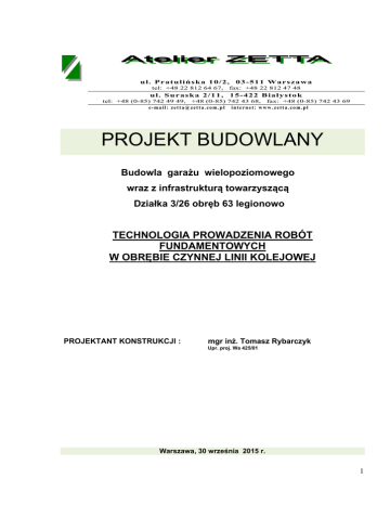 ul. Pratulińska 10/2, 03-511 Warszawa tel: +48 22 812 64 67, fax: +48 22 812 47 48 ul. Suraska 2/11, 15-422 Białystok tel: +48 (0-85) 742 49 49, +48 (0-85) 742 43 68, fax: +48 (0-85) 742 43 69 e-mail: [email protected] internet: www.zetta.com.pl PROJEKT BUDOWLANY Budowla garażu wielopoziomowego wraz z infrastrukturą towarzyszącą Działka 3/26 obręb 63 legionowo TECHNOLOGIA PROWADZENIA ROBÓT FUNDAMENTOWYCH W OBRĘBIE CZYNNEJ LINII KOLEJOWEJ PROJEKTANT KONSTRUKCJI : mgr inż. Tomasz Rybarczyk Upr. proj. Wa 425/01 Warszawa, 30 września 2015 r. 1 ZAWARTOŚĆ OPRACOWANIA Spis rysunków str. 3 Opis techniczny str. 4-7 Załączniki – uprawnienia budowlane str. 8-9 Rysunki konstrukcyjne str. 10-11 2 SPIS RYSUNKÓW KONSTRUKCYJNYCH 1 2 Fundamenty Przekrój poprzeczny 3 OPIS TECHNICZNY 1. PRZEDMIOT I ZAKRES OPRACOWANIA Przedmiotem niniejszego opracowania jest technologia wykonywania robót fundamentowych otwartego garażu wielostanowiskowego zlokalizowanego przy ulicy Tadeusza Kościuszki w Legionowie na działce nr. ew. 3/26, obręb 63. w bezpośrednim sąsiedztwie czynnej linii kolejowej. 2. PODSTAWY OPRACOWANIA - projekt architektoniczny i projekty branżowe wytyczne Inwestora „Opinia geotechniczna wraz z dokumentacją badań podłoża gruntowego dla garażu piętrowego w Legionowie woj. mazowieckie" wykonana w sierpniu 2015 przez firmę "HGS” – Warszawa ul. Puławska 26. 3. WARUNKI GRUNTOWO – WODNE Na terenie przyszłej lokalizacji garażu (w pobliżu dworca PKP) z rzędnych 82,20 ÷ 82,55 m n.p.m. wykonano łącznie 16 otworów badawczych o głębokości po 5,0 m. Stwierdzono następujące warunki gruntowe: Bezpośrednio pod powierzchnią terenu do głębokości 0,0÷1,60m występują nasypy niebudowlane złożone z luźnych piasków (ID = 0,2) z domieszką żużla i gruzu. Poniżej, do głębokości wykonania odwiertów, w we wszystkich otworach poza jednym, natrafiono na piaski drobne i średnie w stanie średniozagęszczonym. Do celów projektowania przyjęto następujące parametry w/w piasków: - stopień zagęszczenia ID = 0,4 - gęstość objętościowa γn = 17,5 kN/m3 - kąt tarcia wewnętrznego Φun = 31,5o W trzech otworach zlokalizowanych pod południowo zachodnią elewacją budowli wierzchnia warstwa piasków do głębokości 2,80÷4,50m poniżej poziomu terenu jest w stanie luźnym (ID = 0,2÷0,3). Z kolei jeden z otworów pod tą samą elewacją wyróżnia się spośród wszystkich, występowaniem dwóch soczewek glin w stanie plastycznym o stopniu plastyczności IL = 0,4. Górna soczewka znajduje się bezpośrednio pod wierzchnią warstwą nasypów na głębokości od 1,50 do 1,90m p.p.t. Dolna o miąższości 70cm rozpoczyna się od głębokości 3,10m poniżej poziomu terenu. W żadnym z odwiertów nie natrafiono na wodę gruntową. W podłożu projektowanego garażu zgodnie z badaniami geotechnicznymi występują proste warunki gruntowe. 4 4. OPIS KONSTRUKCJI GARAŻU Projektowana budowla składać się będzie z siedmiu części - segmentów oddzielonych dylatacjami. Wszystkie będą mieć 3 kondygnacje nadziemne i nie będą podpiwniczone za wyjątkiem fragmentu mieszczącego jedną z klatek schodowych. Każdy z segmentów posiada podział biegnący wzdłuż całego obiektu na kondygnacje (półpiętra) usytuowane wyżej (rzędne ±0,00, +2,84 i +5,68) od strony torów kolejowych, oraz kondygnacje (półpiętra) niższe (rzędne -1,42, +1,42 i +4,26) od strony ulicy Kościuszki. Konstrukcja obiektu w całości żelbetowa monolityczna szkieletowa o stropach w postaci płaskich płyt wylewanych połączonych pomiędzy wyższymi i niższymi półpiętrami przy pomocy czterech monolitycznych pochylni żelbetowych. Płyty stropowe oparte na słupach żelbetowych o przekroju koła lub półkolistym dla słupów przydylatacyjnych. Podparcie płyt bez pogrubień płyty czyli "grzybków" lub belek - podciągów krawędziowych. Skraj płyt stropowych oraz boczne krawędzie pochylni wjazdowych zakończone żelbetowymi monolitycznymi barierami. W skrajnych segmentach obiektu oraz w segmencie środkowym zaprojektowano 3 klatki schodowe o ścianach żelbetowych wylewanych ocieplonych od zewnątrz styropianem. Klatki przekryte dachami w formie monolitycznych płyt żelbetowych gr. 20cm. Ściany klatek schodowych połączone z płytami stropowymi stanowią ich dodatkowe podparcie i zarazem usztywnienie konstrukcji całej budowli. Podesty półpięter w postaci przedłużonych fragmentów płyt międzypiętrowych. Biegi klatek płytowe żelbetowe monolityczne. Fundamenty bezpośrednie w postaci żelbetowych monolitycznych stóp o wymiarach 2,2x2,2x0,4m. Stopy pod słupy przydylatacyjne niedylatowane. Fundamenty klatek schodowych żelbetowe płytowe. Na poziomie parteru wyższa i niższa część obiektu rozdzielona żelbetową monolityczną płytową ścianą oporową biegnącą po osi "C" wzdłuż całego budynku. W osi A i B bezpośrednio przy linii kolejowej – poziom posadowienia stóp wynosi -1,20 m W tych osiach występują grunty nośne. Poziom dna wykopu – 1,30 m W rejonie słabych gruntów od strony ulicy Kościuszki (luźne piaski i plastyczne gliny) grunt pod stopy fundamentowe głównej konstrukcji obiektu oraz pod ścianę oporową należy wybrać i wymienić na piasek zagęszczony do wskaźnika zagęszczenia IS = 0,95. Ponieważ w niektórych miejscach słabonośne grunty mogą występować aż do głębokości 4,50m poniżej poziomu terenu, należy rozważyć wykonywanie wykopów pod wymianę gruntu jako umocnionych ściankami szczelnymi ze stalowych wyprasek. W przypadku natrafienia na dnie wykopów pod stopy na nasypy niebudowlane, które zgodnie z badaniami gruntowymi mogą osiągać miąższość nawet do 1,60m, należy je usunąć i zastąpić piaskiem zagęszczonym do wskaźnika IS = 0,95. Przewidziano także częściową wymianę istniejących nasypów antropogenicznych pod 5 posadzki parteru. Pod posadzki wymienić należy warstwę wierzchnią na