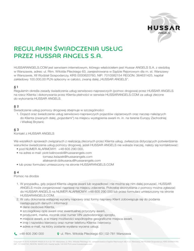 REGULAMIN ŚWIADCZENIA USŁUG PRZEZ HUSSAR ANGELS S.A. HUSSARANGELS.COM jest serwisem internetowym, którego właścicielem jest Hussar ANGELS S.A. z siedzibą w Warszawie, adres: ul. Rtm. Witolda Pileckiego 63, zarejestrowana w Sądzie Rejonowym dla m. st. Warszawy w Warszawie, XII Wydział Gospodarczy, KRS 0000620760, NIP: 7010582154 REGON: 364631425, kapitał zakładowy 100.000,00 PLN opłacony w całości, zwaną dalej „HUSSAR ANGELS”. §1 Regulamin określa zasady świadczenia usług serwisowo-naprawczych (pomoc drogowa) przez HUSSAR ANGELS na rzecz Klienta i dokonywania przez Klienta płatności w serwisie HUSSARANGELS.COM za usługi zlecone do wykonania HUSSAR ANGELS. §2 Świadczenie usług pomocy drogowej obejmuje w szczególności: 1. D ojazd oraz świadczenie usług serwisowo-naprawczych pojazdów ciężarowych oraz naczep należących do Klienta (zwanych dalej „pojazdami”) na miejscu wystąpienia awarii m. in. na terenie Europy Zachodniej i Wielkiej Brytanii; §3 Kontakt z HUSSAR ANGELS We wszelkich sprawach związanych z realizacją zleconych przez Klienta usług, zwłaszcza dotyczących potwierdzenia warunków świadczenia usług pomocy drogowej, jeżeli HUSSAR ANGELS nie wskaże inaczej, należy się kontaktować: • pod NUMER ALARMOWY: +48 605 290 000, • na adres e-mail: [email protected] [email protected] [email protected] • lub przez formularz umieszczony na stronie HUSSARANGELS.COM §4 Pomoc na drodze 1. W przypadku, gdy pojazd Klienta ulegnie awarii lub wypadkowi i nie można się nim dalej poruszać, HUSSAR ANGELS może zorganizować naprawę na miejscu zdarzenia. Potrzebę skorzystania z pomocy można zgłaszać do HUSSAR ANGELS na NUMER ALARMOWY: +48 605 290 000 lub przez formularz umieszczony na stronie HUSSARANGELS.COM. 2. W celu dokonania wstępnej wyceny naprawy oraz formy naprawy Klient zobowiązuje się do podania następujących danych i informacji: • dane osobowe Klienta, • szczegółowy opis awarii oraz ewentualnej przyczyny awarii, • producent, marka, rocznik oraz numer VIN uszkodzonego sprzętu, • miejsce awarii, a w miarę możliwości współrzędne geograficzne miejsca awarii, • imię i nazwisko kierowcy oraz numer telefonu Klienta i kierowcy. • adres e-mail, na który zostanie wysłana wycena usługi. +48 605 290 000 ul. Rtm. Witolda Pileckiego 63 | 02-781 Warszawa Copyright © 2016 HUSSAR ANGELS S.A 02-781 Warszawa, ul. Rtm. Witolda Pileckiego 63, zarejestrowana w Sądzie Rejonowym dla m.st. Warszawy, XIII Wydział Gospodarczy, KRS 0000620760, NIP: 7010582154, REGON: 364631425, Kapitał spółki 100.000 PLN www.hussarangels.com 3. P o szczegółowej weryfikacji danych i informacji, wymienionych w pkt 2 powyżej, HUSSAR ANGELS przesyła Klientowi drogą poczty elektronicznej na uprzednio podany adres Klienta, informację o formie dokonania naprawy, szacowanym czasie dojazdu na miejsce awarii, wstępną wycenę naprawy oraz prośbę o akceptację powyższych warunków naprawy. 4. K lient niezwłocznie akceptuje warunki naprawy poprzez przesłanie drogą poczty elektronicznej skanu pisma zawierającego informacje określone w ust. 2 niniejszego paragrafu opatrzonego pieczątką Klienta wraz z podpisem upoważnionej przez Klienta osoby. Wzór e-maila zwrotnego poniżej: „Zlecam naprawę auta/naczepy marka …...... rocznik …... . Miejsce wystąpienia awarii …...” 5. W przypadku braku niezwłocznej akceptacji warunków naprawy przez Klienta, HUSSAR ANGELS staje się wolny od wykonania naprawy na zaproponowanych warunkach i nie ponosi odpowiedzialności za jakiekolwiek skutki braku akceptacji warunków naprawy. 6. P o otrzymaniu od Klienta skanu pisma akceptującego warunki naprawy, HUSSAR ANGELS podejmuje działania w celu likwidacji awarii. 7.HUSSAR ANGELS przekazuje Klientowi informacje o stanie likwidacji awarii: telefonicznie, smsem lub drogą elektroniczną. W przypadku zwiększenia kosztów usunięcia awarii, HUSSAR ANGELS informuje Klienta o zaistniałej sytuacji, w celu uzgodnienia nowych kosztów naprawy. W przypadku braku porozumienia, co do nowych kosztów naprawy, Klient jest zobowiązany zapłacić za wykonaną dotychczas usługę, a HUSSAR ANGELS nie ponosi odpowiedzialności za brak zgody Klienta na dokonanie dodatkowych, niezbędnych napraw, które powodują konieczność ustalenia nowych kosztów naprawy. 8. Z chwilą usunięcia awarii, HUSSAR ANGELS informuje o tym fakcie Klienta, a kierowca pojazdu lub inna upoważniona przez Klienta osoba będąca na miejscu awarii podpisuje protokół potwierdzający wykonanie naprawy. §5 Sposób płatności 1. K lient dokonuje płatności za usługę pomocy drogowej przez serwis HUSSARANGELS.COM. Warunkiem przystąpienia do naprawy jest dokonanie płatności przez Klienta. Dniem dokonania wpłaty jest dzień zaksięgowania wpłaty na rachunku bankowym HUSSAR ANGELS. 2. W celu dokonania zapłaty za usługę pomocy drogowej w serwisie HUSSARANGELS.COM należy wpisać wymagane dane w formularzu opłacenia naprawy. 3. P łatność dokonywana jest przez system płatności internetowych Przelewy24. 4. Z głoszenie naprawy za pośrednictwem serwisu HUSSARANGELS.COM wymaga akceptacji plików cookies przez przeglądarkę użytkownika. 5. S erwis HUSSARANGELS.COM działa na prawidłowo skonfigurowanej przeglądarce Internet Explorer, Mozilla Firefox, Google Chrome bądź innej zaktualizowanej i odpowiednio skonfigurowanej przeglądarce. 6. P o złożeniu zamówienia Zamawiający otrzyma mail potwierdzający przyjęcie zamówienia. §6 Wydanie pojazdu 1. Wydanie pojazdu nastąpi w miejscu wykonania usługi pomocy drogowej. 2. J eżeli przewidywany termin wykonania usługi pomocy drogowej nie może być dotrzymany, HUSSAR ANGELS powiadomi Klienta o nowym przewidywanym terminie. +48 605 290 000 ul. Rtm. Witolda Pileckiego 63 | 02-781 Warszawa Copyright © 2016 HUSSAR ANGELS S.A 02-781 Warszawa, ul. Rtm. Witolda Pileckiego 63, zarejestrowana w Sądzie Rejonowym dla m.st. Warszawy