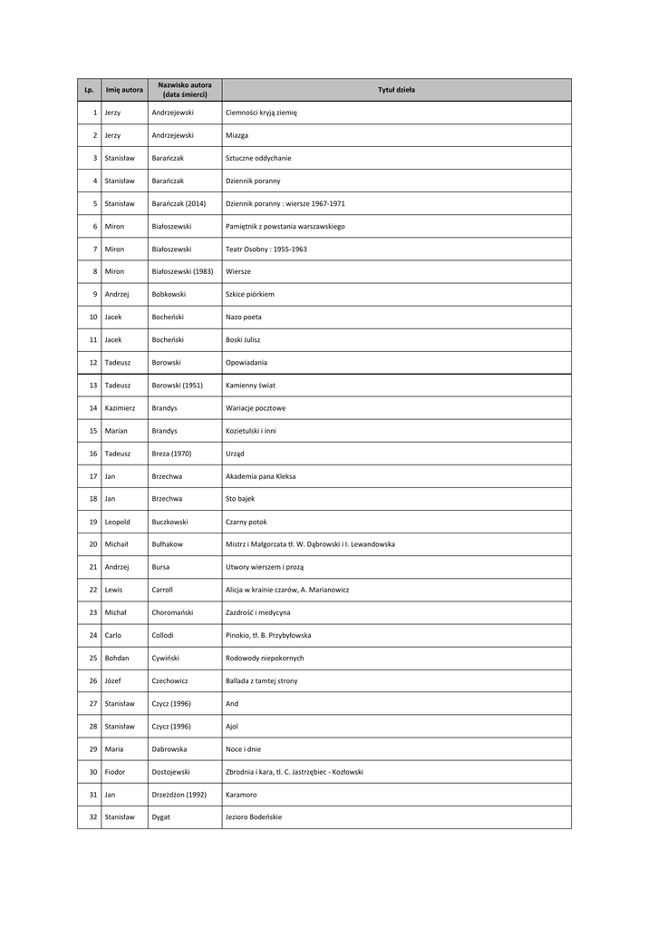 Lp. Imię autora Nazwisko autora (data śmierci) Tytuł dzieła 1 Jerzy Andrzejewski Ciemności kryją ziemię 2 Jerzy Andrzejewski Miazga 3 Stanisław Barańczak Sztuczne oddychanie 4 Stanisław Barańczak Dziennik poranny 5 Stanisław Barańczak (2014) Dziennik poranny : wiersze 1967-1971 6 Miron Białoszewski Pamiętnik z powstania warszawskiego 7 Miron Białoszewski Teatr Osobny : 1955-1963 8 Miron Białoszewski (1983) Wiersze 9 Andrzej Bobkowski Szkice piórkiem 10 Jacek Bocheński Nazo poeta 11 Jacek Bocheński Boski Julisz 12 Tadeusz Borowski Opowiadania 13 Tadeusz Borowski (1951) Kamienny świat 14 Kazimierz Brandys Wariacje pocztowe 15 Marian Brandys Kozietulski i inni 16 Tadeusz Breza (1970) Urząd 17 Jan Brzechwa Akademia pana Kleksa 18 Jan Brzechwa Sto bajek 19 Leopold Buczkowski Czarny potok 20 Michaił Bułhakow Mistrz i Małgorzata tł. W. Dąbrowski i I. Lewandowska 21 Andrzej Bursa Utwory wierszem i prozą 22 Lewis Carroll Alicja w krainie czarów, A. Marianowicz 23 Michał Choromański Zazdrość i medycyna 24 Carlo Collodi Pinokio, tł. B. Przybyłowska 25 Bohdan Cywiński Rodowody niepokornych 26 Józef Czechowicz Ballada z tamtej strony 27 Stanisław Czycz (1996) And 28 Stanisław Czycz (1996) Ajol 29 Maria Dabrowska Noce i dnie 30 Fiodor Dostojewski Zbrodnia i kara, tl. C. Jastrzębiec - Kozłowski 31 Jan Drzeżdżon (1992) Karamoro 32 Stanisław Dygat Jezioro Bodeńskie Lp. Imię autora Nazwisko autora (data śmierci) Tytuł dzieła 33 Konstanty I. Gałczyński Wybór wierszy 34 Konstanty I. Gałczyński Zielona gęś 35 Witold Gombrowicz Ferdydurke 36 Witold Gombrowicz Dziennik 1953-1956 37 Witold Gombrowicz Dziennik 1957-1961 38 Witold Gombrowicz Dziennik 1961-1966 39 Witold Gombrowicz Trans-Atlantyk ; Ślub 40 Witold Gombrowicz Pornografia 41 Witold Gombrowicz Kosmos Grimm Baśnie 43 Stanisław Grochowiak Wiersze wybrane 44 Stanisław Grochowiak Ballada rycerska 45 Stanisław Grochowiak (1976) Wiersze wybrane 46 Stanisław Grzesiuk Boso, ale w ostrogach 47 Jerzy Harasymowicz Wybór wierszy 1955-1973 48 Jaroslav Hašek Przygody dobrego wojaka Szwejka, tł. P. Hulka - Laskowski 49 Zbigniew Herbert Pan Cogito 50 Zbigniew Herbert Barbarzyńca w ogrodzie 51 Gustaw Herling-Grudziński Inny świat 52 Marek Hłasko Pierwszy krok w chmurach 53 Ireneusz Iredyński (1985) Dzień oszusta 54 Ireneusz Iredyński (1985) Żegnaj Judaszu 55 Jarosław Iwaszkiewicz Panny z Wilka, Brzezina 56 Jarosław Iwaszkiewicz (1980) Lato w Nohant. Komedia w trzech aktach 57 Jarosław Iwaszkiewicz (1980) Sława i chwała 58 Jerosław Iwaszkiewicz (1980) Kochankowie z Marony 59 Paweł Jasienica Polska Jagiellonów 60 Paweł Jasienica Rzeczpospolita Obojga Narodów 61 Paweł Jasienica Polska Piastów 62 James Joyce Ulisses, tł. Maciej Słomczyński 63 Anna Kamieńska Żołnierze i żołnierzyki 64 Aleksander Kamiński Kamienie na szaniec 42 Jacob i Wilhelm Lp. Imię autora Nazwisko autora (data śmierci) Tytuł dzieła 65 Ryszard Kapuściński Cesarz 66 Tymoteusz Karpowicz Odwrócone światło 67 Andrzej Kijowski Dziecko przez ptaka przyniesione 68 Andrzej Kijowski (1985) Listopadowy wieczór 69 Leszek Kołakowski (2009) Klucz niebieski albo Opowieści budujące z historii świętej zebrane ku pouczeniu i przestrodze 70 Leszek Kołakowski (2009) Główne nurty marksizmu. Powstanie – rozwój – rozkład 71 Leszek Kołakowski (2009) Obecność mitu 72 Leszek Kołakowski (2009) Czy diabeł może być zbawiony i 27 innych kazań. 73 Leszek Kołakowski (2009) Kultura i fetysze 74 Leszek Kołakowski (2009) 13 bajek z królestwa Lailonii dla dużych i małych. 75 Leszek Kołakowski (2009) Rozmowy z diabłem 76 Leszek Kołakowski (2009) Świadomość religijna i więź kościelna: studia nad chrześcijaństwem bezwyznaniowym siedemnastego wieku 77 Tadeusz Konwicki Mała apokalipsa 78 Tadeusz Konwicki Sennik współczesny 79 Tadeusz Konwicki Kompleks polski 80 Tadeusz Konwicki Wniebowstąpienie 81 Tadeusz Konwicki Kalendarz i klepsydra Kornhauser / Zagajewski Świat nie przedstawiony 83 Jan Kott Szkice o Szekspirze 84 Maria Kownacka Plastusiowy pamiętnik 85 Hanna Krall Zdążyć przed Panem Bogiem 86 Joanna Kulmowa Wio, Leokadio 87 Maria Kuncewiczowa Tristan 1946 88 Maria Kuncewiczowa Cudzoziemka 89 Andrzej Kuśniewicz Król Obojga Sycylii 90 Jerzy Kwiatkowski Klucze do wyobraźni Lec (1966) Myśli nieuczesane 92 Stanisław Lem Solaris 93 Stanisław Lem Opowieści o Pilocie Pirxie 94 Leo Lipski (1997) Piotruś 95 Leo Lipski (1997) Dzień i noc : (opowiadania) 96 Józef Łoziński Pantokrator 82 91 Julian / Adam Stanisław Jerzy Lp. Imię autora Nazwisko autora (data śmierci) Tytuł dzieła 97 Józef Łoziński Chłopacka wysokość 98 Wilhelm Mach (1965) Góry nam czarnym morzem 99 Kornel Makuszyński Szatan z siódmej klasy 100 Hanna Malewska Przemija postać świata 101 Krystyna Miłobędzka Dom, pokarmy 102 Czesław Miłosz Ocalenie 103 Czesław Miłosz Zniewolony umysł 104 Czesław Miłosz Dolina Issy 105 Kazimierz Moczarski Rozmowy z katem 106 Lucy Maud Montgomery Ania z Zielonego Wzgórza, tł. R. Bernsteinowa 107 Sławomir Mrożek Tango oraz inne dramaty i opowiadania 108 Sławomir Mrożek Rzeźnia 109 Sławomir Mrożek Opowiadania 110 Sławomir Mrożek Wesele w Atomicach 111 Wiesław Myśliwski Pałac 112 Wiesław Myśliwski Nagi sad 113 Zofia Nałkowska Medaliony 114 Zofia Nałkowska Dziennik czasów wojny 115 Zofia Nałkowska Granica 116 Edmund Niziurski Sposób na Alcybiadesa 117 Edmund Niziurski Niewiarygodne przygody Marka Piegusa 118 Ewa Nowacka Kilka miesięcy, całe życie 119 Tadeusz Nowak A jak królem, a jak katem będziesz 120 Tadeusz Nowak Wybór wierszy 121 Marek Nowakowski Chłopiec z gołębiem na głowie 122 Marek Nowakowski Ten stary złodziej 123 Marek Nowakowski Robaki 124 Marek Nowakowski (2014) Robaki 125 Włodzimierz Odojewski Zasypie wszystko, zawieje… 126 Kazimierz Orłoś Cudowna melina 127 Marian Pankowski (2011) Matuga idzie 128 Marian Pankowski (2011) Rudolf 