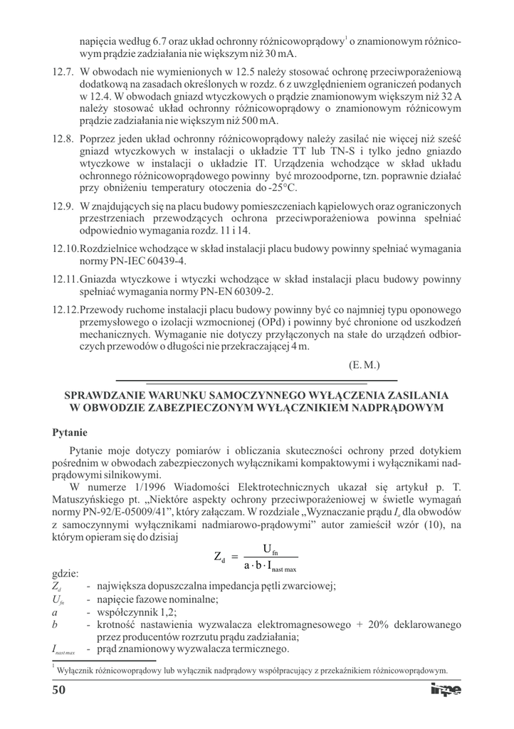 napięcia według 6.7 oraz układ ochronny różnicowoprądowy1 o znamionowym różnicowym prądzie zadziałania nie większym niż 30 mA. 12.7. W obwodach nie wymienionych w 12.5 należy stosować ochronę przeciwporażeniową dodatkową na zasadach określonych w rozdz. 6 z uwzględnieniem ograniczeń podanych w 12.4. W obwodach gniazd wtyczkowych o prądzie znamionowym większym niż 32 A należy stosować układ ochronny różnicowoprądowy o znamionowym różnicowym prądzie zadziałania nie większym niż 500 mA. 12.8. Poprzez jeden układ ochronny różnicowoprądowy należy zasilać nie więcej niż sześć gniazd wtyczkowych w instalacji o układzie TT lub TN-S i tylko jedno gniazdo wtyczkowe w instalacji o układzie IT. Urządzenia wchodzące w skład układu ochronnego różnicowoprądowego powinny być mrozoodporne, tzn. poprawnie działać przy obniżeniu temperatury otoczenia do -25°C. 12.9. W znajdujących się na placu budowy pomieszczeniach kąpielowych oraz ograniczonych przestrzeniach przewodzących ochrona przeciwporażeniowa powinna spełniać odpowiednio wymagania rozdz. 11 i 14. 12.10.Rozdzielnice wchodzące w skład instalacji placu budowy powinny spełniać wymagania normy PN-IEC 60439-4. 12.11.Gniazda wtyczkowe i wtyczki wchodzące w skład instalacji placu budowy powinny spełniać wymagania normy PN-EN 60309-2. 12.12.Przewody ruchome instalacji placu budowy powinny być co najmniej typu oponowego przemysłowego o izolacji wzmocnionej (OPd) i powinny być chronione od uszkodzeń mechanicznych. Wymaganie nie dotyczy przyłączonych na stałe do urządzeń odbiorczych przewodów o długości nie przekraczającej 4 m. (E. M.) SPRAWDZANIE WARUNKU SAMOCZYNNEGO WYŁĄCZENIA ZASILANIA W OBWODZIE ZABEZPIECZONYM WYŁĄCZNIKIEM NADPRĄDOWYM Pytanie Pytanie moje dotyczy pomiarów i obliczania skuteczności ochrony przed dotykiem pośrednim w obwodach zabezpieczonych wyłącznikami kompaktowymi i wyłącznikami nadprądowymi silnikowymi. W numerze 1/1996 Wiadomości Elektrotechnicznych ukazał się artykuł p. T. Matuszyńskiego pt. „Niektóre aspekty ochrony przeciwporażeniowej w świetle wymagań normy PN-92/E-05009/41”, który załączam. W rozdziale „Wyznaczanie prądu Ia dla obwodów z samoczynnymi wyłącznikami nadmiarowo-prądowymi” autor zamieścił wzór (10), na którym opieram się do dzisiaj gdzie: Zd Ufn a b Inast max 1 U Zd = fn a× b× I nast max - największa dopuszczalna impedancja pętli zwarciowej; napięcie fazowe nominalne; współczynnik 1,2; krotność nastawienia wyzwalacza elektromagnesowego + 20% deklarowanego przez producentów rozrzutu prądu zadziałania; - prąd znamionowy wyzwalacza termicznego. Wyłącznik różnicowoprądowy lub wyłącznik nadprądowy współpracujący z przekaźnikiem różnicowoprądowym. 50 Rys. 1. Charakterystyki czasowo-prądowe wyłącznika firmy MOELLER, typu NZM 10 o prądzie znamionowym 630 A. Linie pionowe oznaczają najmniejszy i największy prąd nastawczy członu zwarciowego przy najmniejszym i największym prądzie nastawczym członu przeciążeniowego: Ir = 300 A ® Imr Î (600 ¸ 3600) A Ir = 630 A ® Imr Î (1260 ¸ 7560) A Na podstawie powyższego wzoru w następujący sposób obliczam największą dopuszczalną impedancję pętli zwarciowej, na przykład dla obwodu z wyłącznikiem kompaktowym NZM firmy MOELLER: prąd znamionowy wyłącznika 630 A prąd zadziałania według charakterystyki czasowoprądowej wyłącznika, b = 12, wobec czego 12 × 630 = 7560 A, dopuszczalny rozrzut dodatni +20%, co daje 1,2 × 7 560 = 9072 A a = 1,2, wobec czego 1,2 × 9072 = 10886,4 A 220 Zd = = 20,2 mΩ W 10886,4 Największa dopuszczalna impedancja pętli zwarciowej rozpatrywanego obwodu wynosi zatem 20,2 mW . Zdaję sobie sprawę, że powyższy problem dotyczy kilkunastu osób w Polsce, ponieważ badając skuteczność ochrony przed dotykiem pośrednim obwodów silnoprądowych posługuję się miernikiem MAXTEST HT 2038 firmy AMPROBE INSTRUMENT USA. Wiem, ile tych mierników sprzedano i jakie firmy go kupiły. Powyższy sposób obliczania konsultowałem z przedstawicielami producentów wyłączników i nie spotkałem sprzeciwu, ale nie znaczy to, że musi on być prawidłowy. Czy należy brać pod uwagę wartość nastawioną na wyzwalaczu, czy też tak, jak w powyższej metodzie i przytoczonym wzorze tylko wartość nominalną wyzwalacza? Proszę o ocenę powyższej metody, a jeśli jest ona nieprawidłowa, będę wdzięczny za wszelkie sugestie. Z poważaniem Wiesław Czyż Odpowiedź Problem dotyczy tysięcy osób w Polsce, dotyczy wszystkich, którzy projektują obwody zabezpieczone wyłącznikami bądź w istniejących instalacjach sprawdzają obwody z punktu widzenia skuteczności ochrony dodatkowej, niezależnie od rodzaju mierników, którymi się posługują. Problem polega na poprawnym ustaleniu wartości prądu wyłączającego Ia wyłącznika i sprawdzeniu czy jest ona nie większa niż wartość prądu zwarciowego płynącego w wyniku uszkodzenia wymagającego samoczynnego wyłączenia zasilania, tzn. - w razie jednomiejscowego zwarcia L-PE lub L-PEN w układzie TN, - w razie dwumiejscowego zwarcia L-PE oraz L-PE lub N-PE w układzie IT, Nr 42 51 - w razie dwumiejscowego zwarcia z nieuziemionym przewodem wyrównawczym CC (PA) w obwodzie separowanym zasilającym więcej niż jedno urządzenie, - w razie dwumiejscowego zwarcia z częścią przewodzącą dostępną lub częścią przewodzącą obcą w obrębie izolowanego stanowiska, na którym wykorzystuje się nieuziemione przewody wyrównawcze CC (PA). Jeżeli samoczynne wyłączenie zasilania nie jest możliwe i w zamian zapewnia się, że największe występujące długotrwale napięcie dotykowe nie przekracza wartości dopuszczalnej, to poprawnie wyznaczona wartość prądu wyłączającego Ia wyłącznika jest niezbędna do obliczenia wspomnianej wartości największego występującego długotrwale napięcia dotykowego UT w oparciu o wartoś