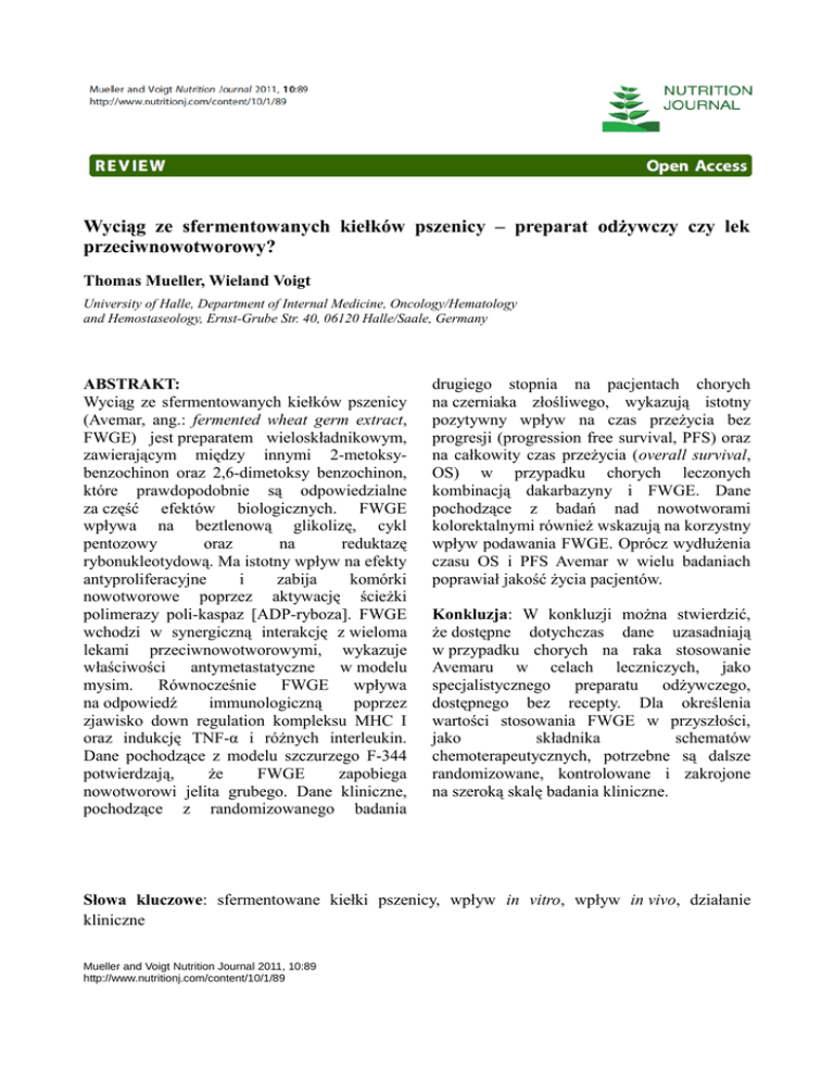 Wyciąg ze sfermentowanych kiełków pszenicy – preparat odżywczy czy lek przeciwnowotworowy? Thomas Mueller, Wieland Voigt University of Halle, Department of Internal Medicine, Oncology/Hematology and Hemostaseology, Ernst-Grube Str. 40, 06120 Halle/Saale, Germany ABSTRAKT: Wyciąg ze sfermentowanych kiełków pszenicy (Avemar, ang.: fermented wheat germ extract, FWGE) jest preparatem wieloskładnikowym, zawierającym między innymi 2-metoksybenzochinon oraz 2,6-dimetoksy benzochinon, które prawdopodobnie są odpowiedzialne za część efektów biologicznych. FWGE wpływa na beztlenową glikolizę, cykl pentozowy oraz na reduktazę rybonukleotydową. Ma istotny wpływ na efekty antyproliferacyjne i zabija komórki nowotworowe poprzez aktywację ścieżki polimerazy poli-kaspaz [ADP-ryboza]. FWGE wchodzi w synergiczną interakcję z wieloma lekami przeciwnowotworowymi, wykazuje właściwości antymetastatyczne w modelu mysim. Równocześnie FWGE wpływa na odpowiedź immunologiczną poprzez zjawisko down regulation kompleksu MHC I oraz indukcję TNF-α i różnych interleukin. Dane pochodzące z modelu szczurzego F-344 potwierdzają, że FWGE zapobiega nowotworowi jelita grubego. Dane kliniczne, pochodzące z randomizowanego badania drugiego stopnia na pacjentach chorych na czerniaka złośliwego, wykazują istotny pozytywny wpływ na czas przeżycia bez progresji (progression free survival, PFS) oraz na całkowity czas przeżycia (overall survival, OS) w przypadku chorych leczonych kombinacją dakarbazyny i FWGE. Dane pochodzące z badań nad nowotworami kolorektalnymi również wskazują na korzystny wpływ podawania FWGE. Oprócz wydłużenia czasu OS i PFS Avemar w wielu badaniach poprawiał jakość życia pacjentów. Konkluzja: W konkluzji można stwierdzić, że dostępne dotychczas dane uzasadniają w przypadku chorych na raka stosowanie Avemaru w celach leczniczych, jako specjalistycznego preparatu odżywczego, dostępnego bez recepty. Dla określenia wartości stosowania FWGE w przyszłości, jako składnika schematów chemoterapeutycznych, potrzebne są dalsze randomizowane, kontrolowane i zakrojone na szeroką skalę badania kliniczne. Słowa kluczowe: sfermentowane kiełki pszenicy, wpływ in vitro, wpływ in vivo, działanie kliniczne Mueller and Voigt Nutrition Journal 2011, 10:89 http://www.nutritionj.com/content/10/1/89